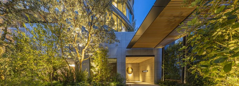 どこにもない姿で、しかも奇を衒わずに——外観には、そんな青山らしい感性が取り入れられています。曲線を活かしたファサードは、互い違いに配された、「表参道と外苑の交差」を表現するフィンとサッシが有機的なフォルムを描き、陰影を創出。先進的なデザインでありながら、マテリアルは風合いある石器質タイルが格調を醸し出し、そのコントラストが、この場所らしい佇まいを魅せています。自然の生命力を感じさせ、存在感を放つ外観デザインです。