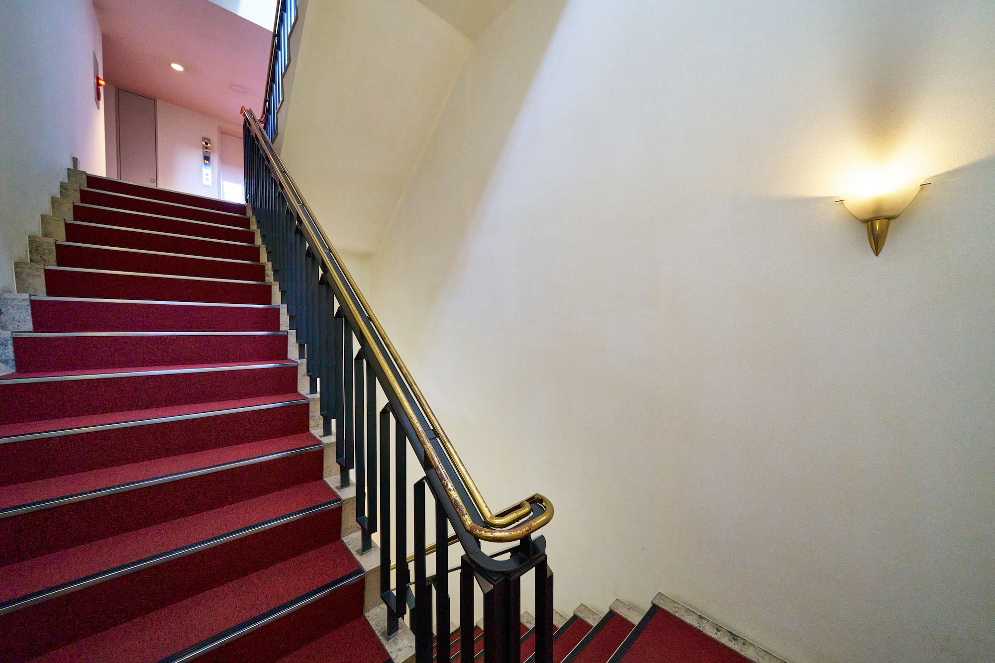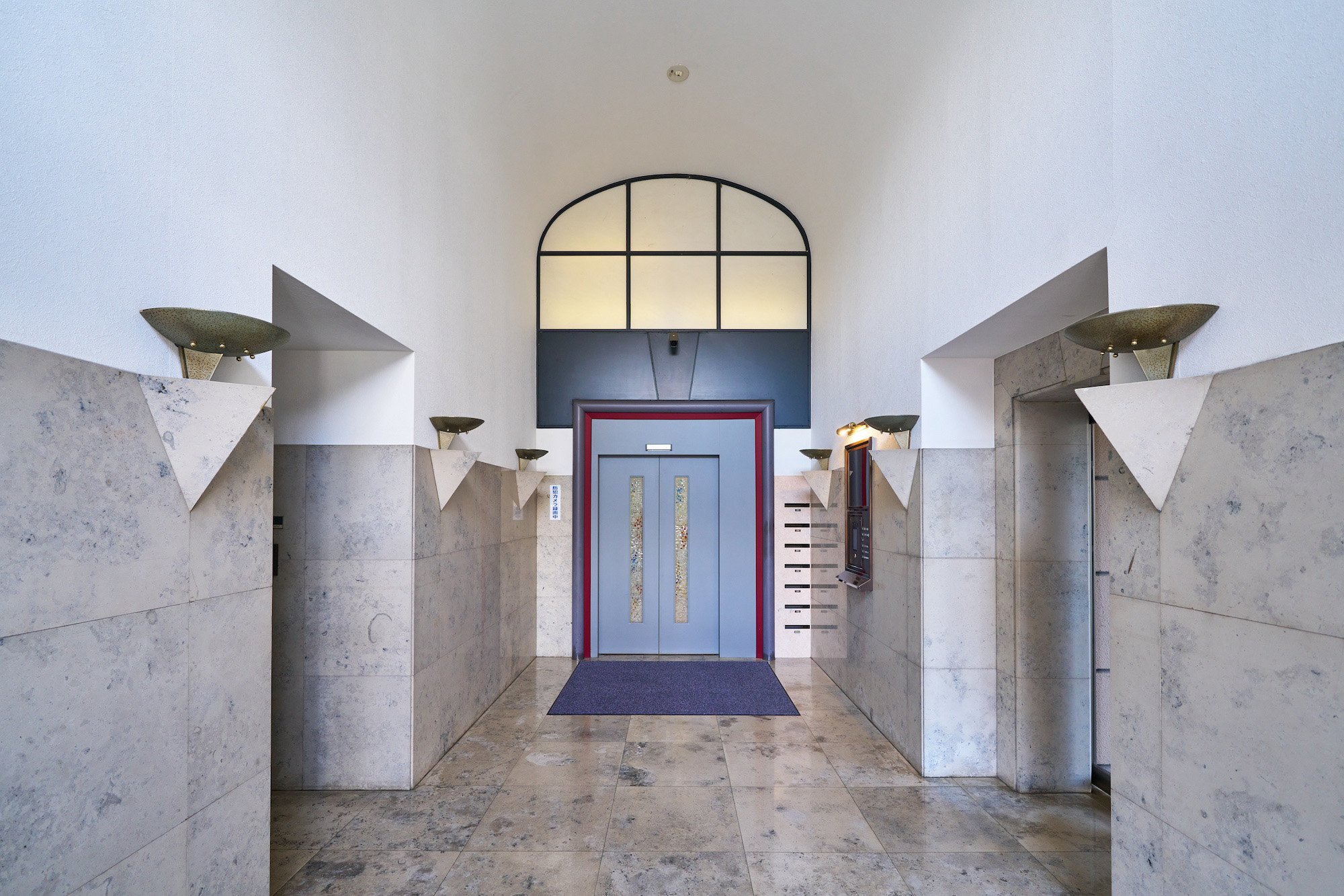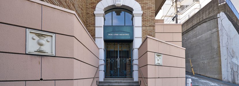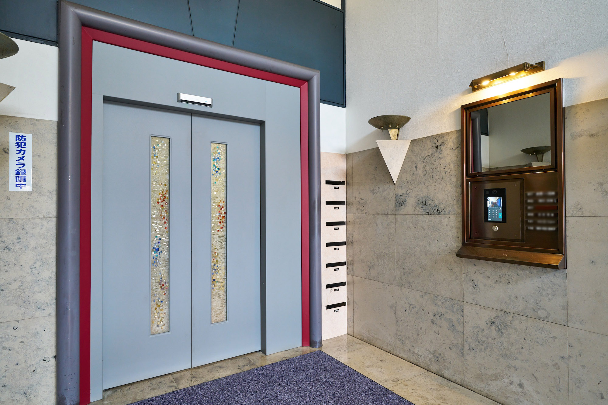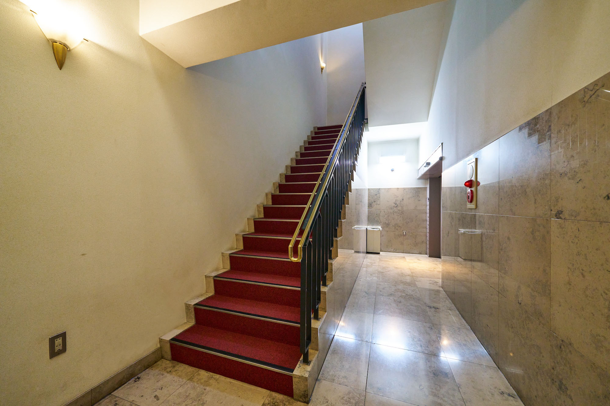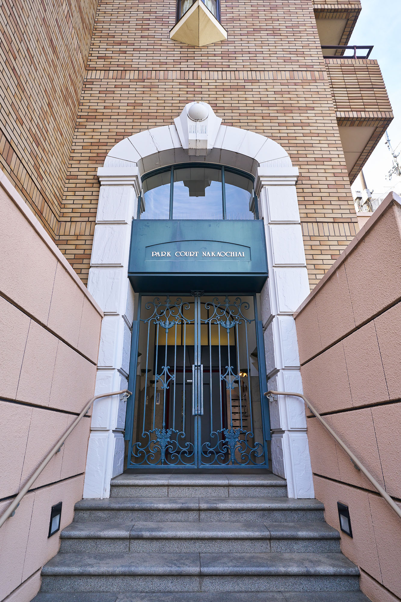 東西に高低差のある敷地を利用して建てられた「パーク・コート中落合」は、地下1階・地上3階建。地下1階には、東側道路に面してメインエントランス、北側にサブエントランスを配しているほか、エントランスホール、駐車場などのパブリックスペースを設置。約4.8mの天井高を確保した、開放感あふれるエントランスホールは、床・壁とも大理石張り。さらに、随所に金の装飾や美しい意匠が施され、格調高い住まいにふさわしい、しっとりと落ち着いた雰囲気のパブリック空間を演出しています。