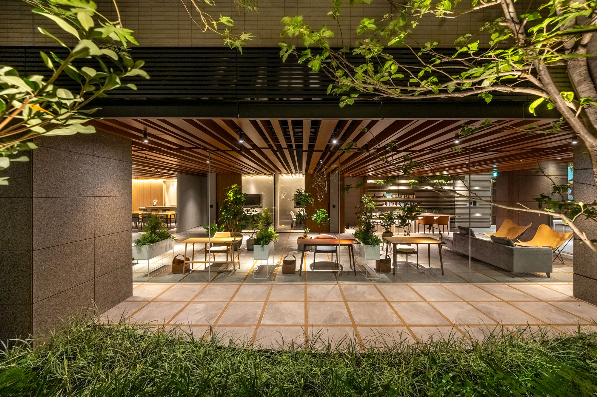 森を描いた絵画のような外の景色を、ガラスを隔て空間内部まで設えたエレベーターホール。内と外をつなぐやわらかな緑の曲線と、ビオトープの水面が映し出す景色の変化は、日々の暮らしに彩りを添えています。