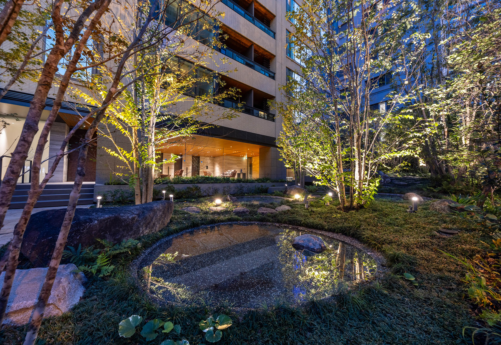 ビオトープが心を潤す、緑に囲まれたもうひとつのメインエントランス「ガーデンエントランス」。自然と融合したモダンアートをイメージして設計し、都心にいながら、森にいる至福を感じることができます。