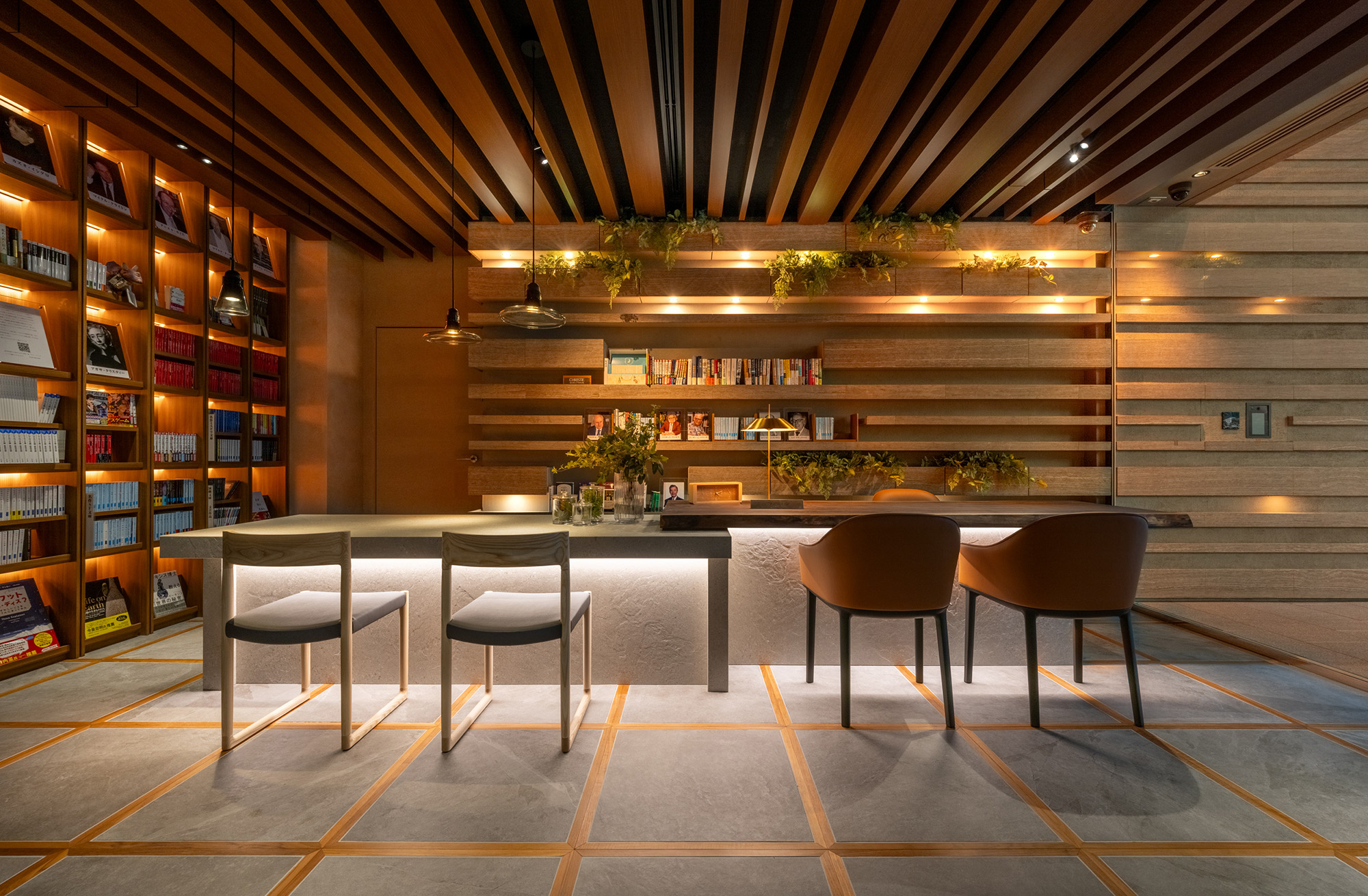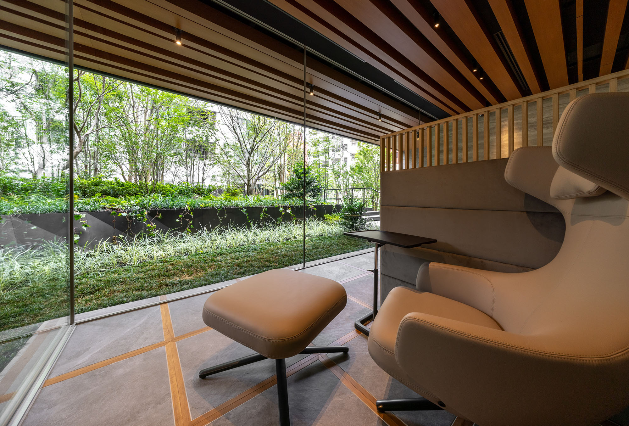 完全なる個室ではなく、植栽のパーテーションで適度に外部とつながり、緊張感を持つことで集中できるホテルのロビーやカフェのような1人用デスクのある空間です。