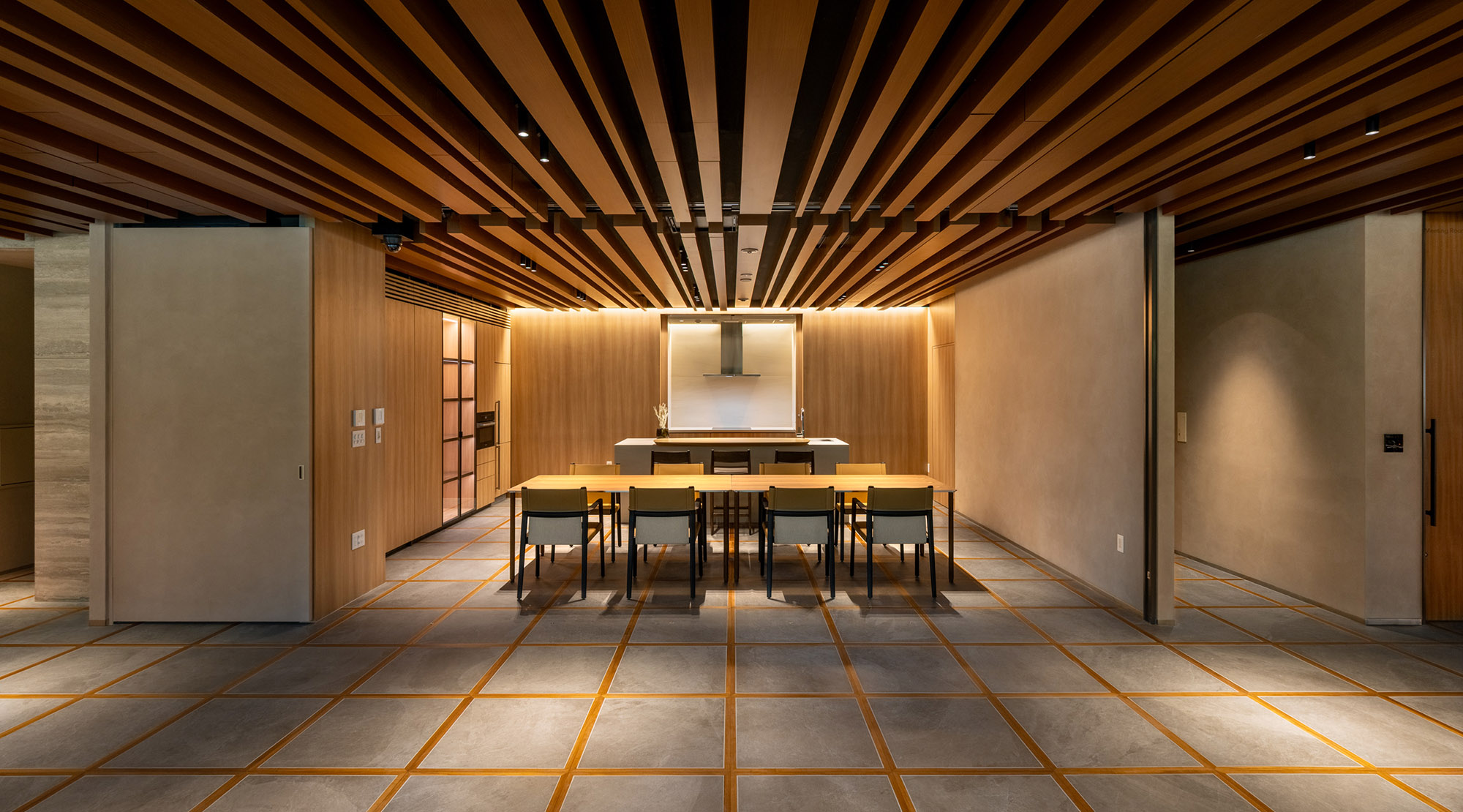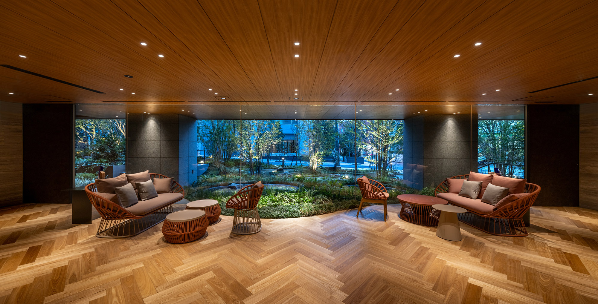 大樹を望み、陽光と木々の緑が調和する、二層吹き抜けの開放的なエントランスホール。都心に生活する住む方の心を静め、上質で豊かなプライベートへと導く空間です。