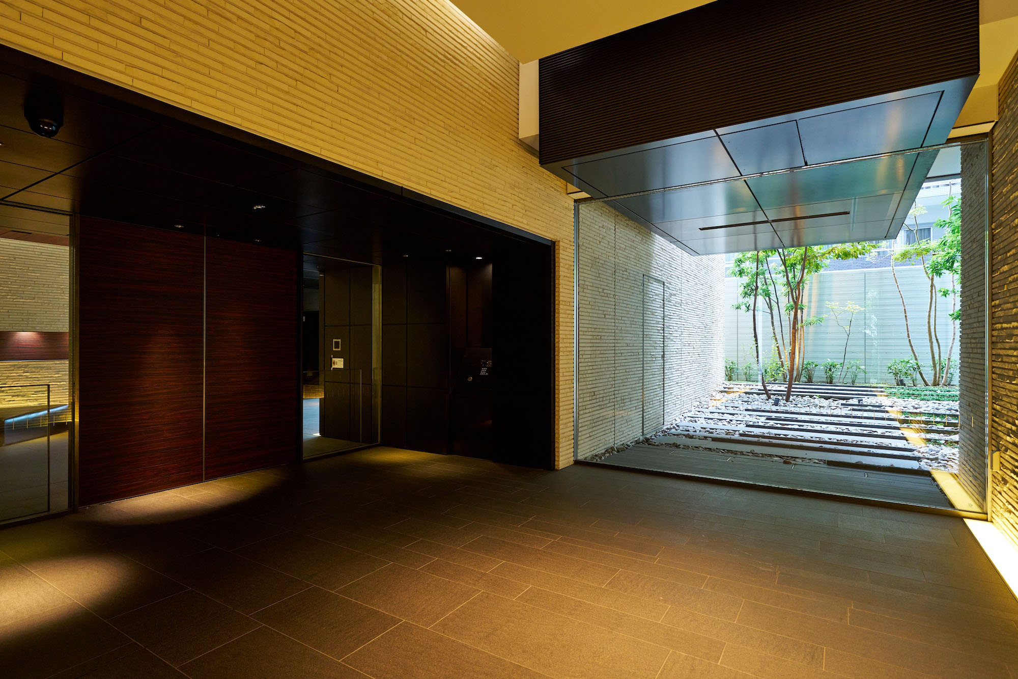 エントランス前のゆとりある空間には、コミュニティスペースとしてベンチをレイアウトし、人々が自然に挨拶を交わすシーンを演出。プライバシー性を高めるアイストップツリーを配し、スタイリッシュで上質な雰囲気に包み込まれたエントランスへと導きます。足を踏み入れるとまず出迎えるのは、街の躍動を忘れさせる静謐なエントランスホールと、「動」的なアンジュレーションが施された中庭。さらに内部へ進むと、上質な落ち着きが漂うラウンジと、一木一石の「静」を表現した絵画的な中庭が配されています。エントランスやラウンジの床には、五感に心地よいとされる「1/fゆらぎ」というリズムを応用したデザインが施されており、重厚感や温かみを生み出す壁の割肌タイルとともに、安らぎの空間を創り上げています。
