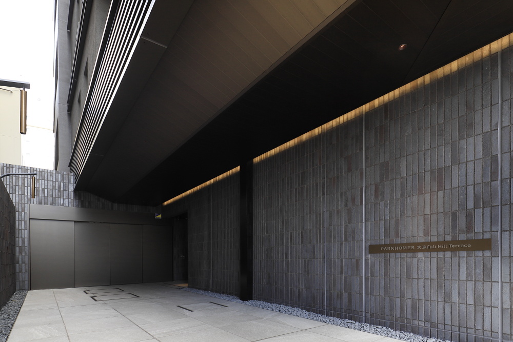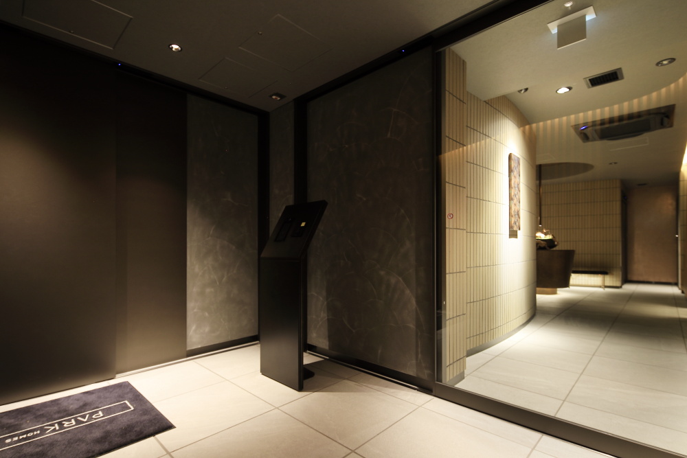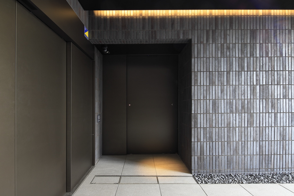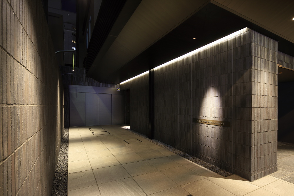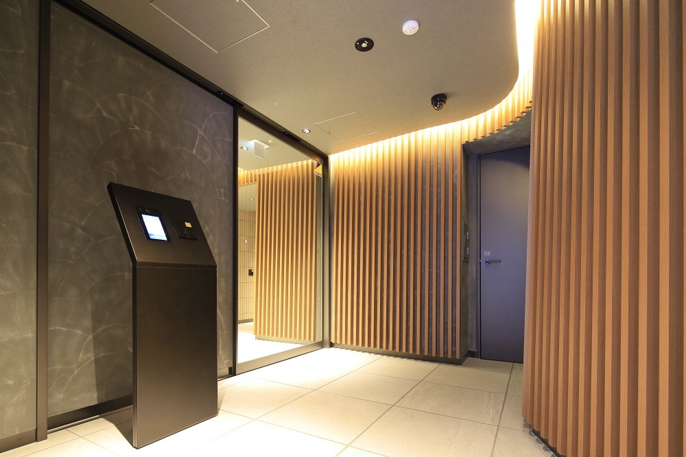 エントランスを公道から奥まった位置に配することで、十分なアプローチを確保。落ち着いた雰囲気を醸すレジデンスにふさわしいエントランスアプローチは、ブラケット照明や間接照明により豊かな表情が演出され、夜間には日中とは異なる趣のある雰囲気が漂います。エントランスを抜けて出迎えるのは、足元やオブジェを淡く照らす間接照明が配されたラウンジ。落ち着いた都心の隠れ家を思わせる空間が広がっています。メインエントランスには、居住者や来訪者と共に入館する侵入者を抑止する、カメラ付オートロック操作盤を設置。エレベーターは住戸の鍵に組み込まれたICチップにより、居住階と共用階のみ着床するシステムを組み込むなど、高い防犯性も備わっています。