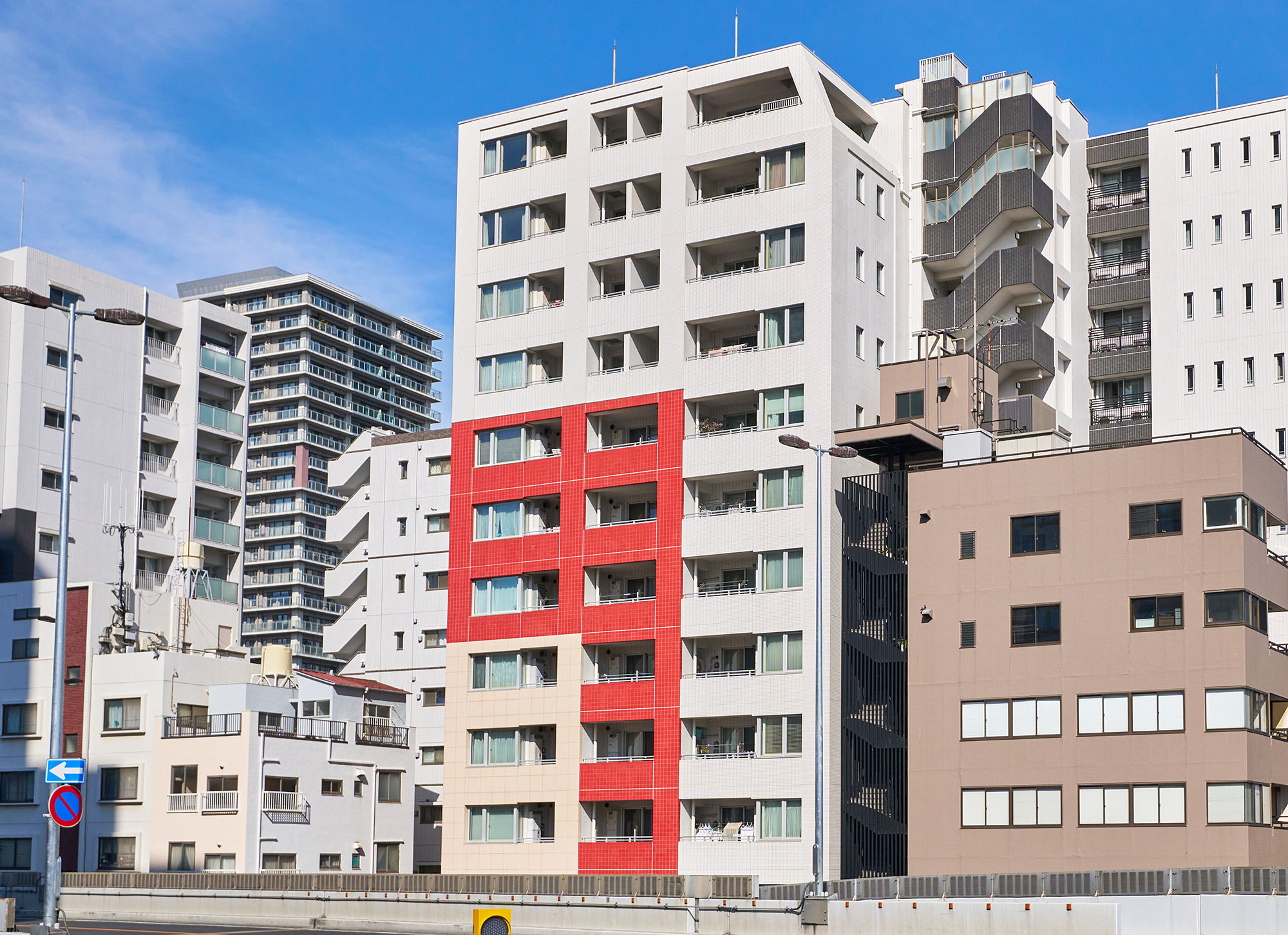 都心という機能的な立地にあるからこそ追求したのは、ゆとりや快適性を満喫できるセンスをもった、感性豊かな住まい。アシンメトリーなフォルムとカラーリング、鮮やかな赤のアクセント、エントランスには重厚感のある大柱と相反する柔らかな曲線。遊び心を感じさせる様々な趣向が、都心の中でも埋もれることのない存在感を放っています。
