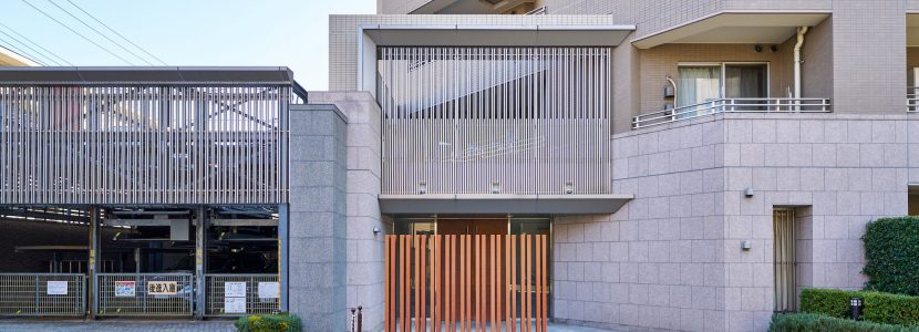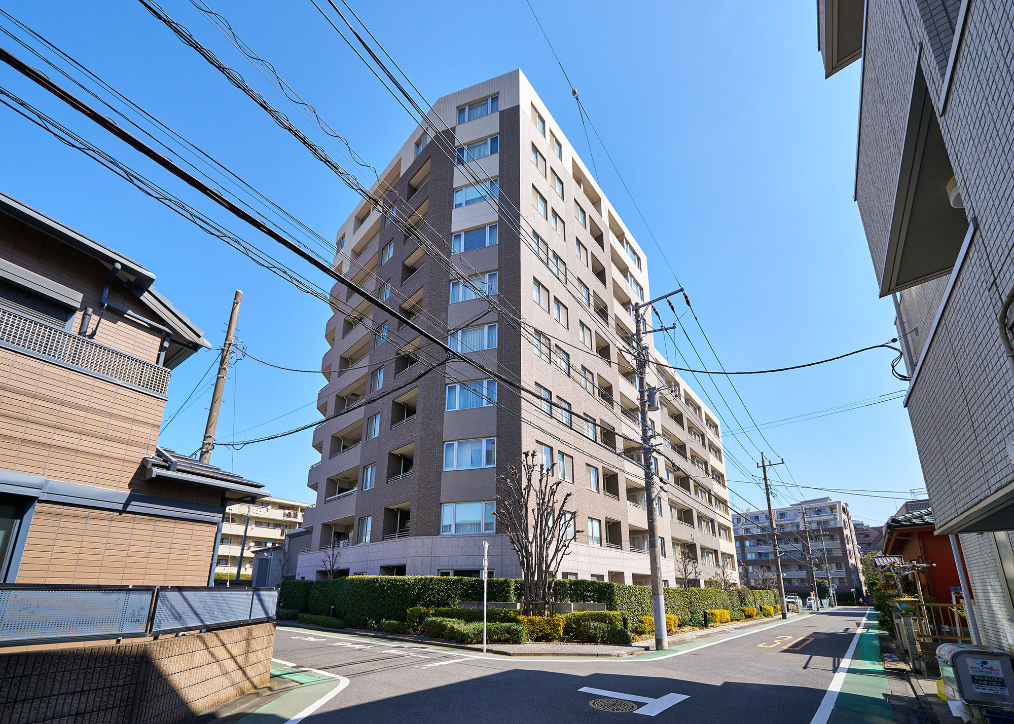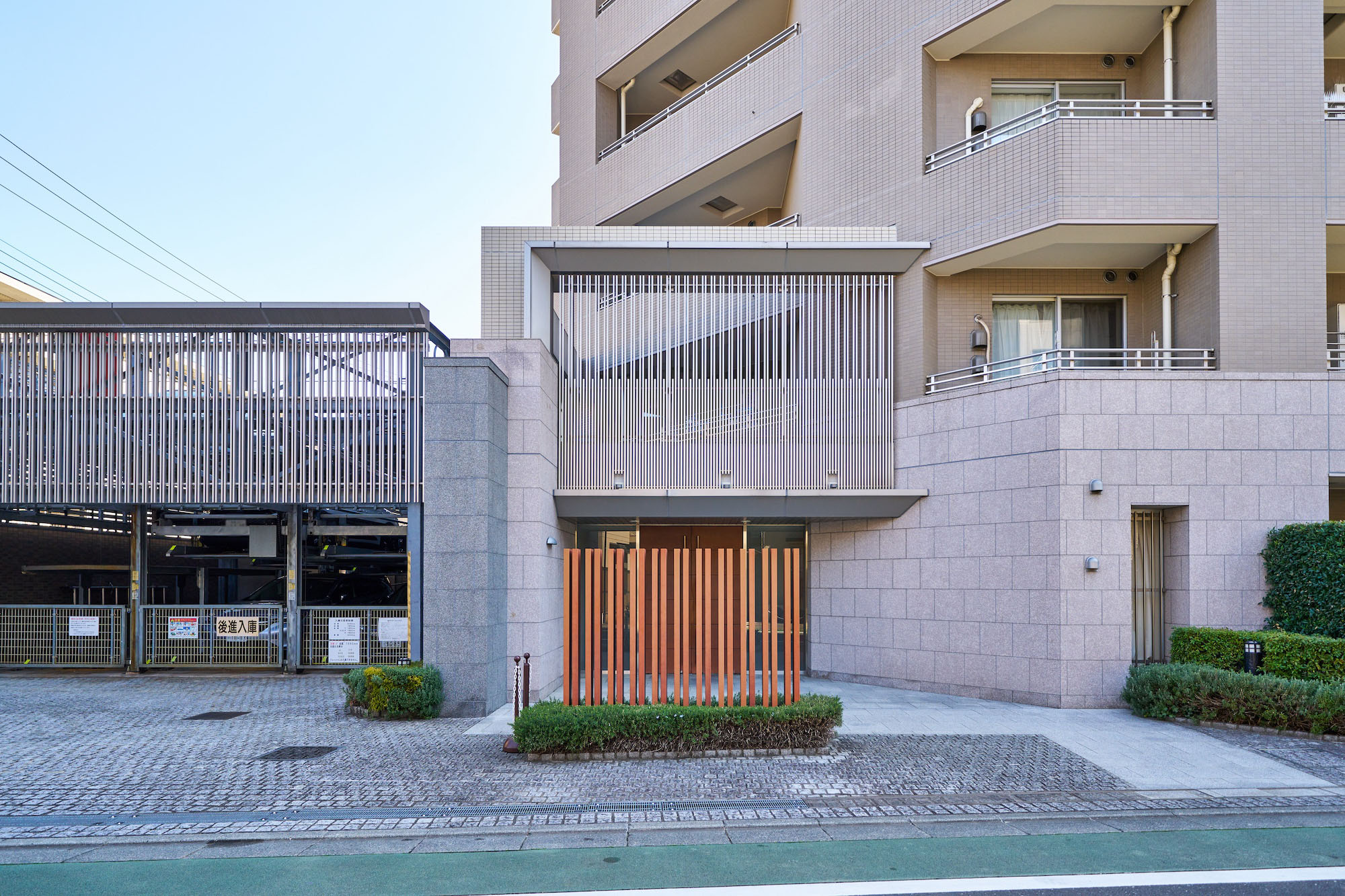 「大化の改新」の時代から続く府中の歴史と、武蔵野の大地から受け継いだ豊かな自然、そして府中が持つ都市としての感性と未来への可能性。モダンにして優雅な建築デザインは、それらの融合から生まれました。外壁には草木の色など「和」の伝統色を取り入れた特注のオリジナルタイルを採用。床材なども土や石といった自然の素材感にこだわり、温もりのある印象に。周辺の街並みとの境界となるアイストップと外構フェンスにも、気品ある格子デザインを使用することで、モダンな「和」のイメージを醸成しています。周辺の閑静で緑豊かな環境にも違和感なく融け合う、さりげない「和」の落ち着き。そこに現代感覚のエッセンスを取り入れながら、人にも、街にも快適なデザインに仕上げられています。