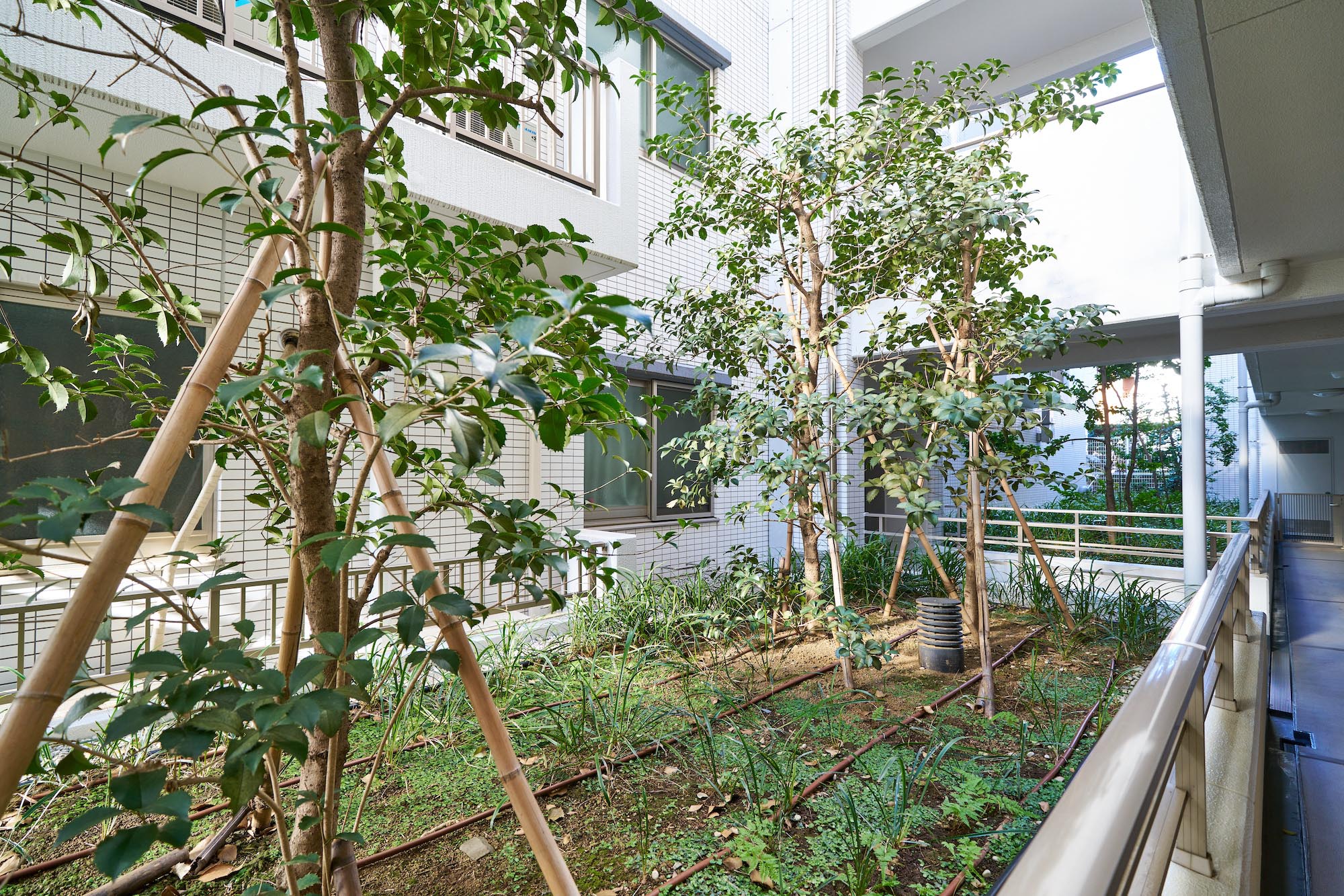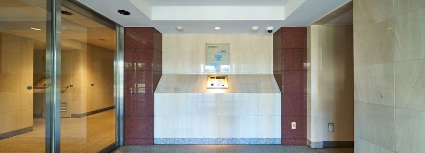 街並みの中で一際目を惹くエントランス。街や人の温もり、そして伝統を超越するアーティスティックな存在感が「朱(あか)」の意匠に込められています。内部は質感ある天然石貼りの落ち着いた空間。住まう方には包み込むような安らぎを、訪れる方には気品あるおもてなしを感じさせてくれます。中央棟と南棟を表情豊かに結ぶブリッジの両サイドには中庭が広がり、開放感と自然の潤いある空間を形成。緑の優しさが、住まいへと心地よくエスコートします。