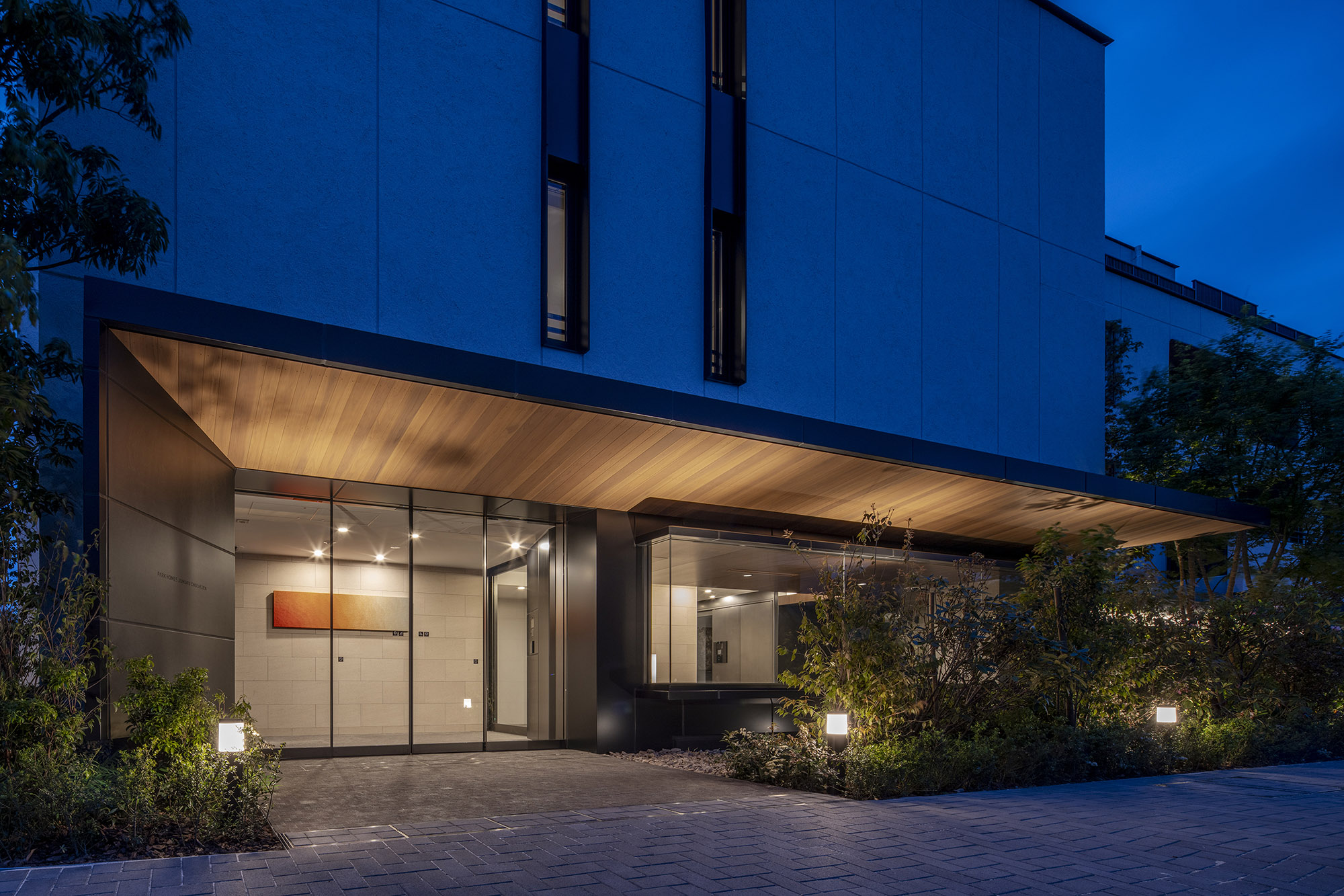 天然木と鋼板で縁どられた庇が、公園の四阿(あずまや)を思わせるエントランス。防腐・防蟻処理の上に、撥水性と防汚性に優れた保護塗料を塗布した天然木は、美しさを保ちながら日々の暮らしに自然を取り込みます。