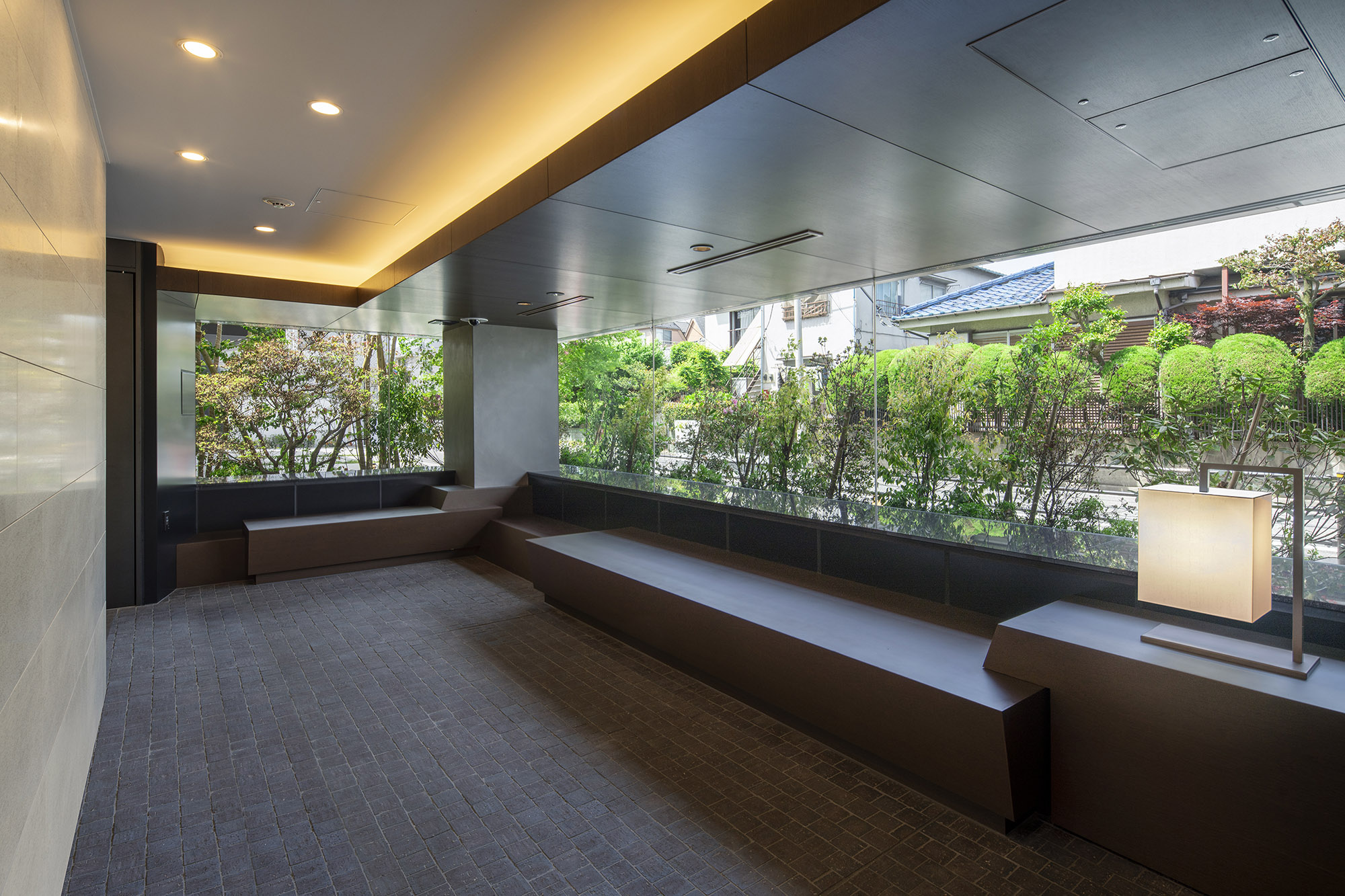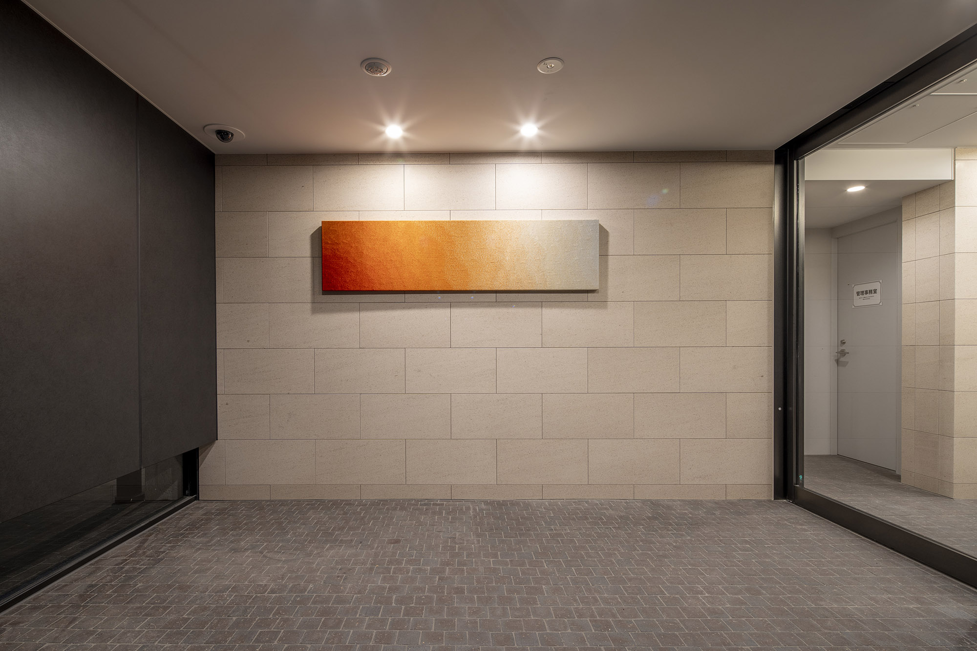 植栽の緑と一体となる心地よい空間のエントランスホールには、綴織の技術を活かしたアートを採用。最上級の帯に使われる「引箔」の技術を用いたアートパネルや、繊細な織の表現によるファブリックアートパネルが自然豊かな日常にさらなる潤いを添えています。共用スペース