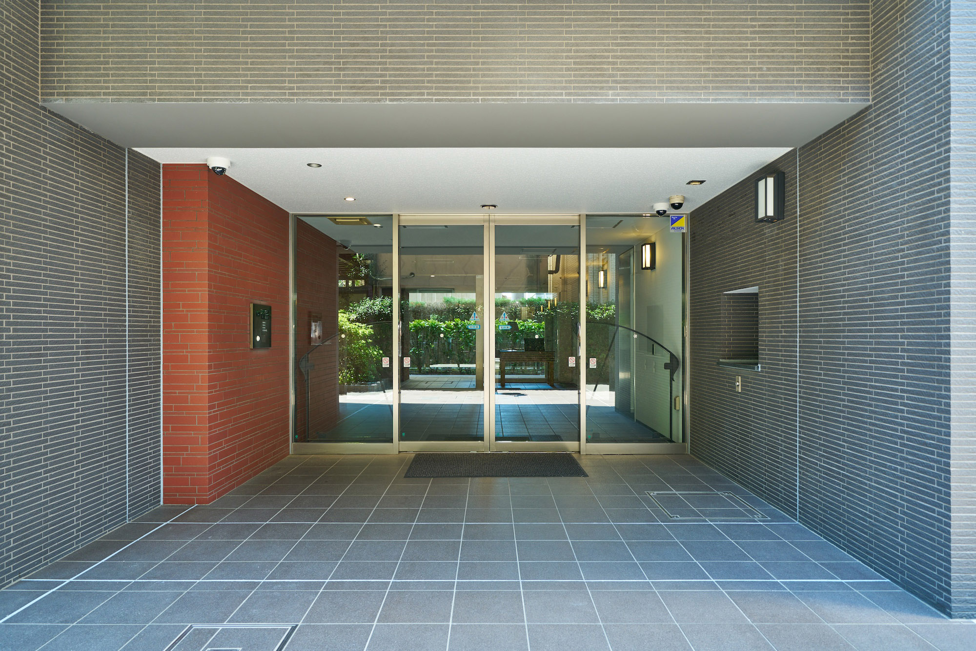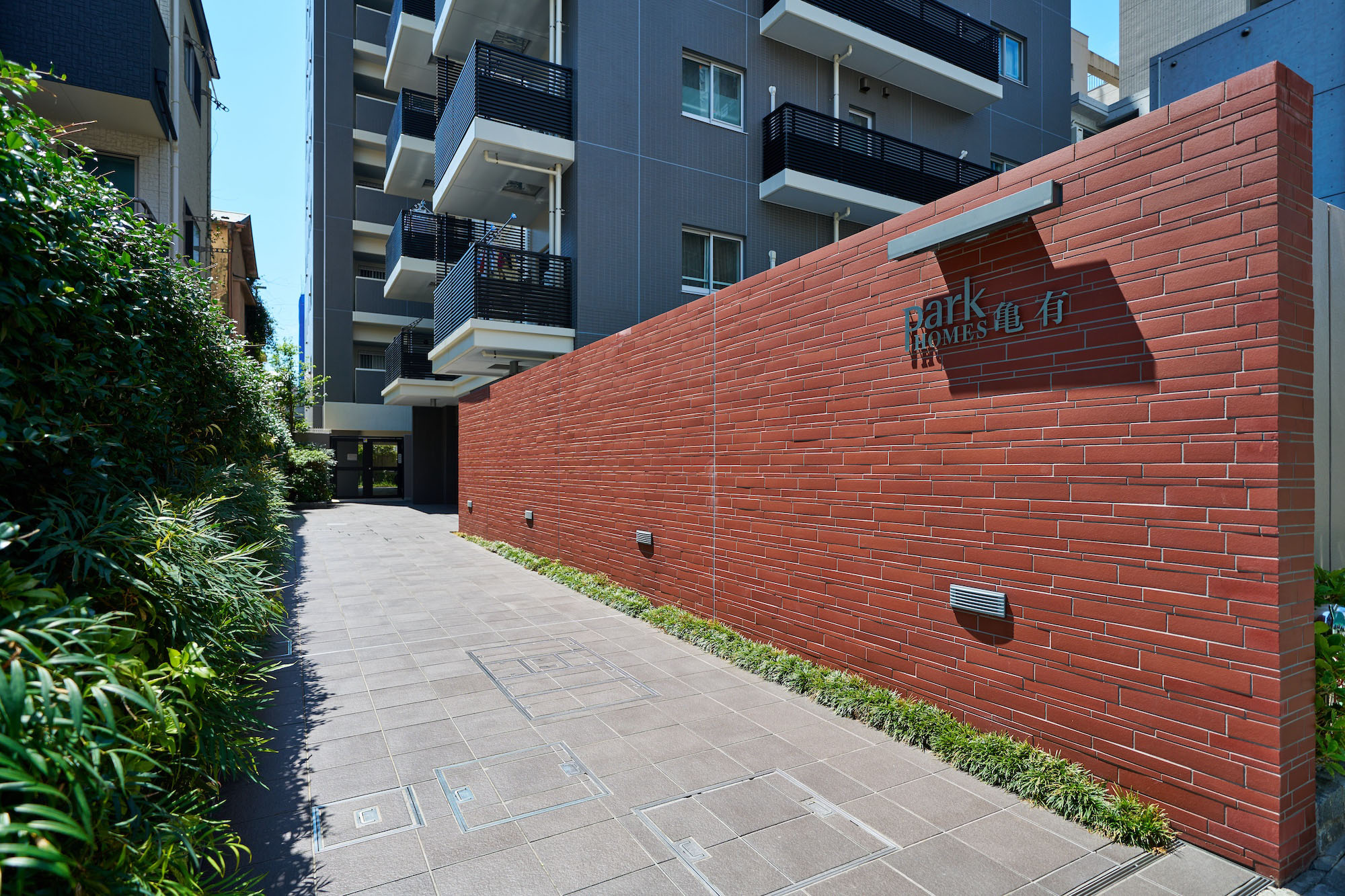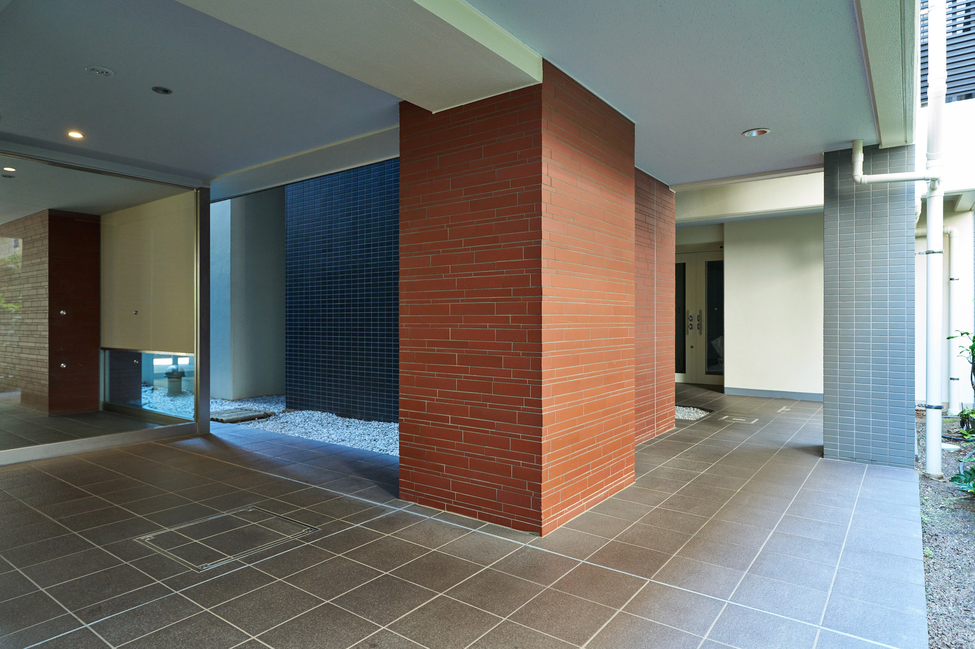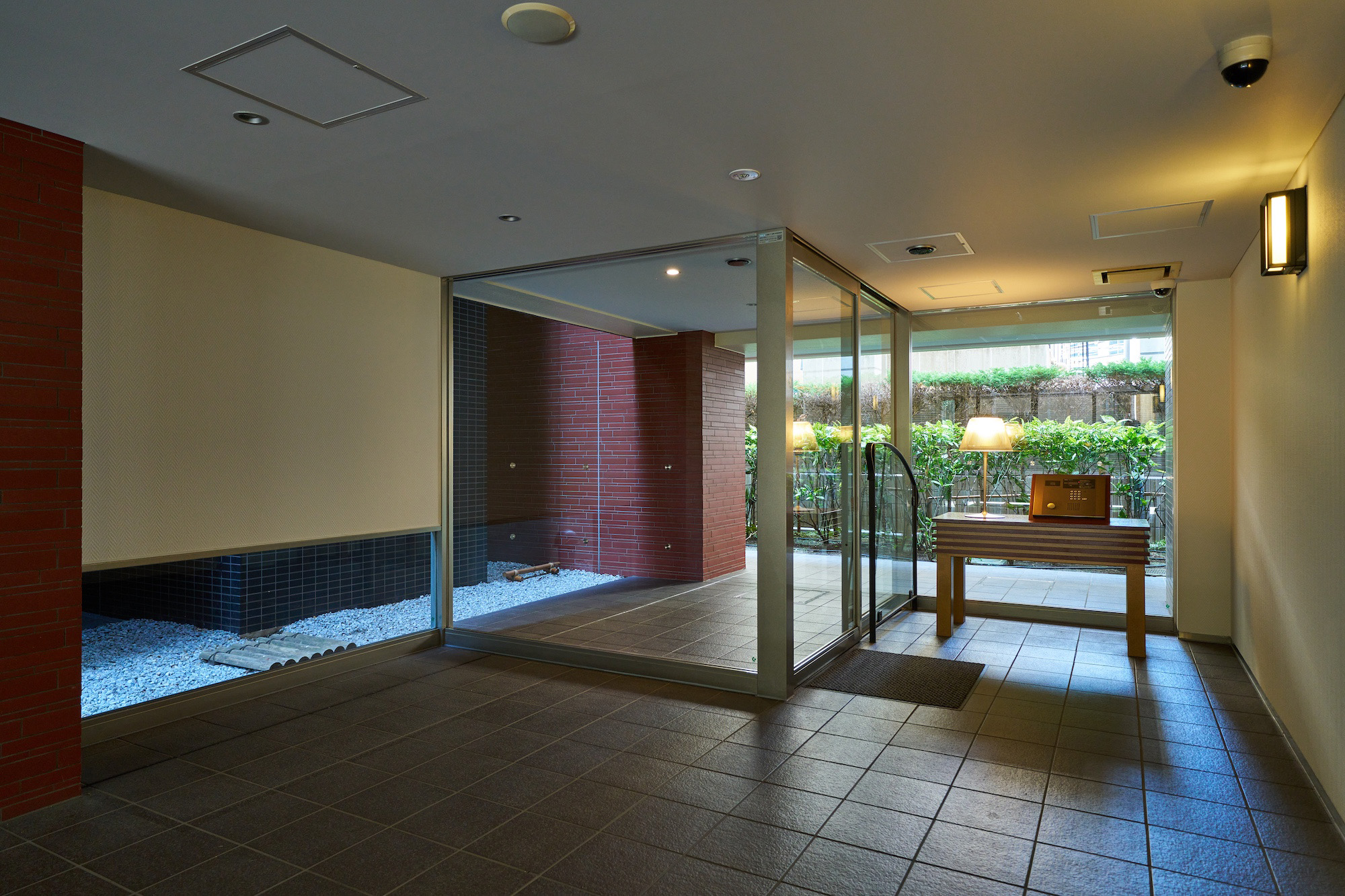 エントランスホールは、黒の床タイルにアクセントとなる赤系の壁が映える、洗練されたデザイン。大きなガラス面の向こうには、レイランドヒノキやフイリアオキなど、緑の色合いの違う植栽がレイアウトされ、優しさや潤いの景観にも配慮されています。家具調にデザインされたテーブルにオートロック操作盤を備え、モダンでありながら、心地よい温もりを感じる、先進と優しさか調和した、亀有の街を象徴するかのような空間です。