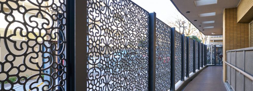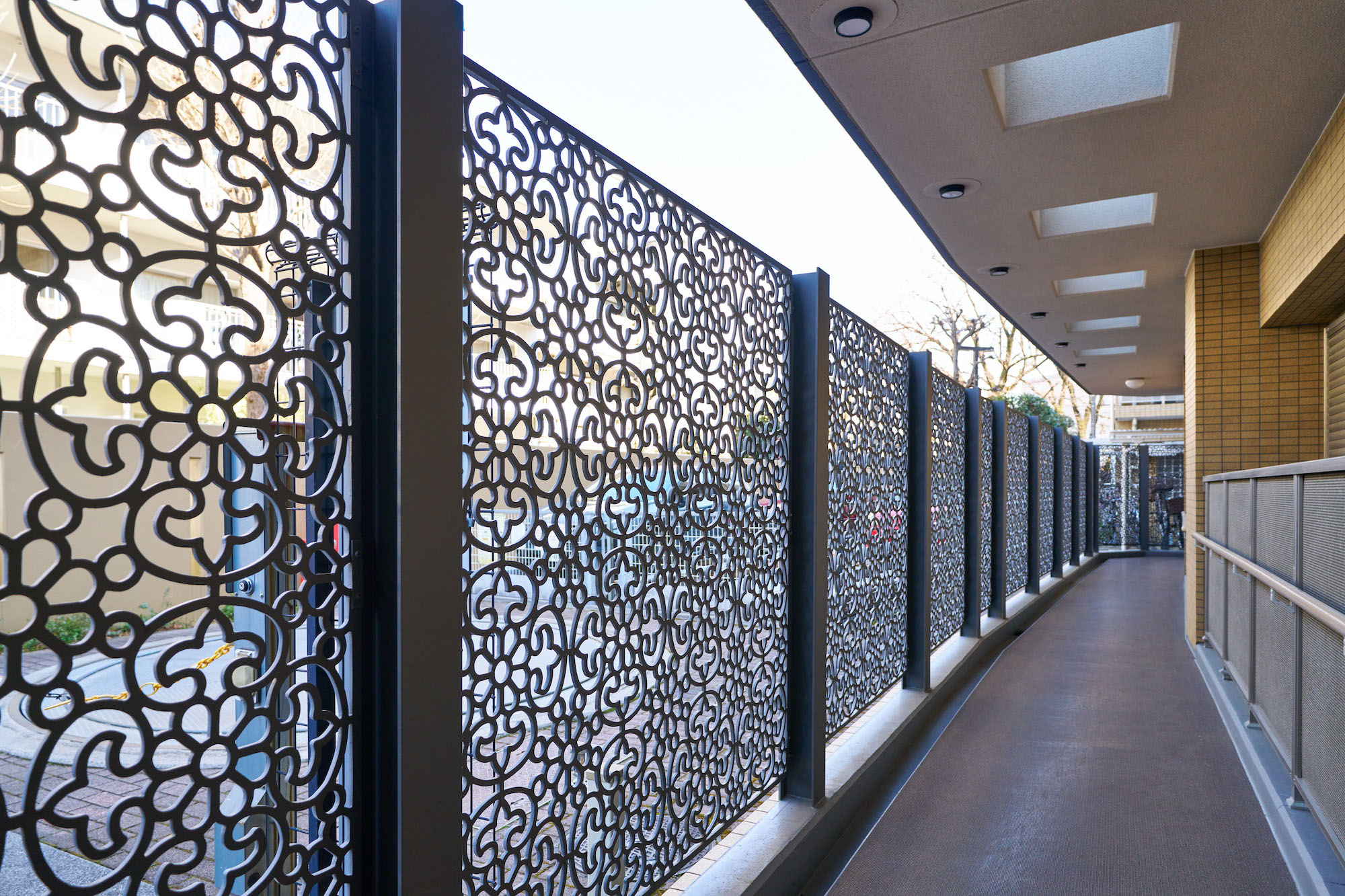 ヨーロピアンテイストのスクリーンを巡らしたやすらぎのコモンスペース。曲線を大切にしたデザインが、街を彩る街路樹の緑と優しく調和しています。風格ある木製のエントランスドアの奥に広がるのは、静かで落ち着いたエントランスホール。南欧トスカーナを思わせる塗り壁や自然石の風合いを活かしたタイルなどで、心和ませる雰囲気にデザインされた空間です。素焼きレンガを思わせる床は、そのまま共用廊下へと美しい流れを作っています。1階共用廊下は、トップライトからの光がキャストアイアンの陰影を生み出す趣き豊かな造り。スクリーン越しに映える光と影のシルエットは幻影的なアートとなり、何気なく歩くだけでも心を満たしてくれます。
