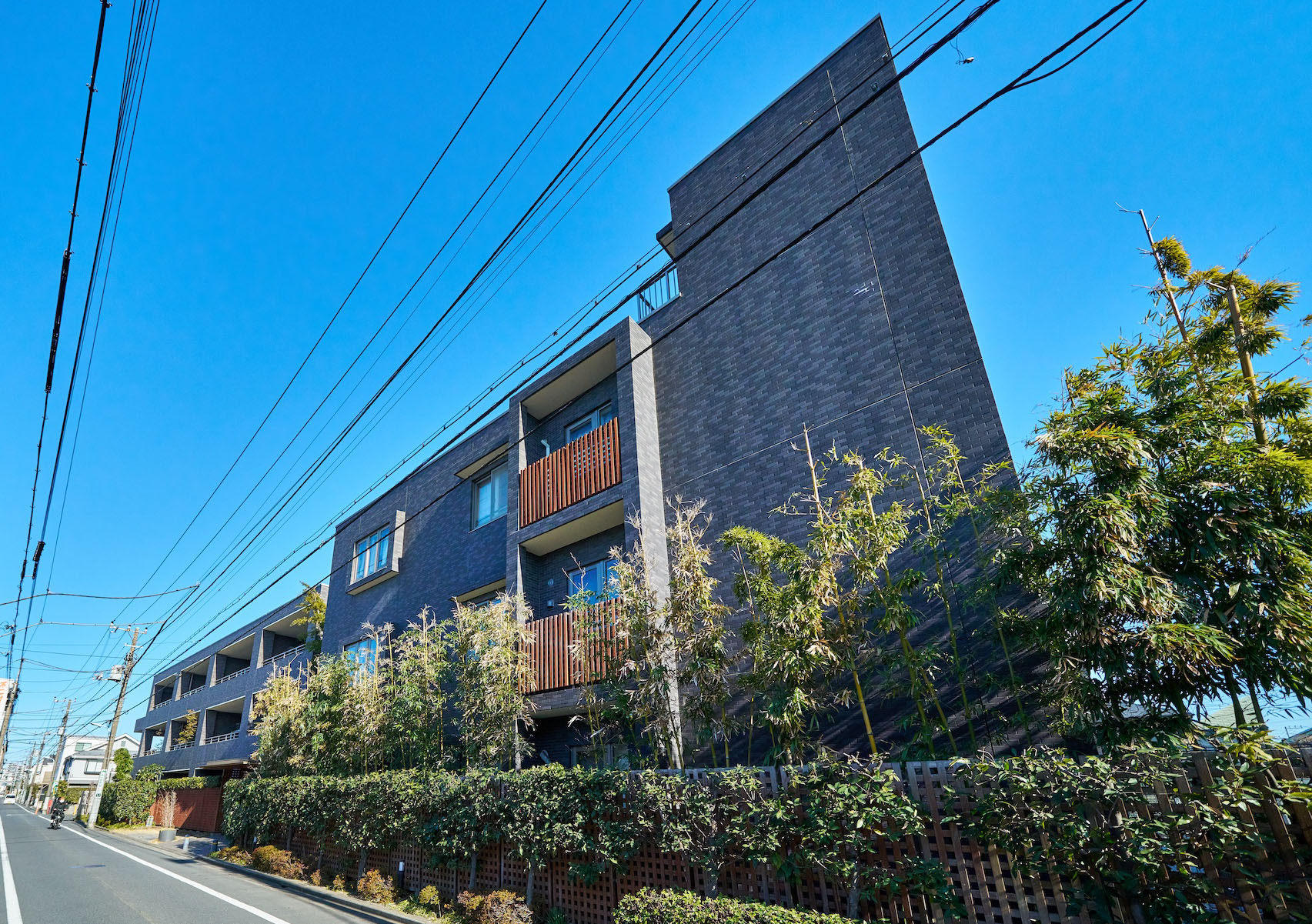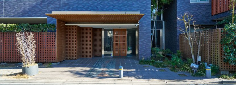 低層3階建て。外装タイルには、時が経つとともに風合いを増す、いぶし瓦を思わせるシックなチャコールグレイのタイルを採用。その重厚な質感と、エントランス周りを飾る木格子との鮮やかなコントラストは、住まう人や行き交う人々の目を楽しませてくれます。アプローチからホール内へと続く床には、いぶし瓦をアクセントに使用。素材の力強さが空間を引き締めています。エントランスやホールの吹抜けには、竹林をレイアウトし、空間に趣と清らかさをプラス。シンプルモダンなデザインの中に「和」のモチーフが散りばめられ、五感を満たすとともに、「パークホームズ久我山」のアイデンティティを創り上げています。