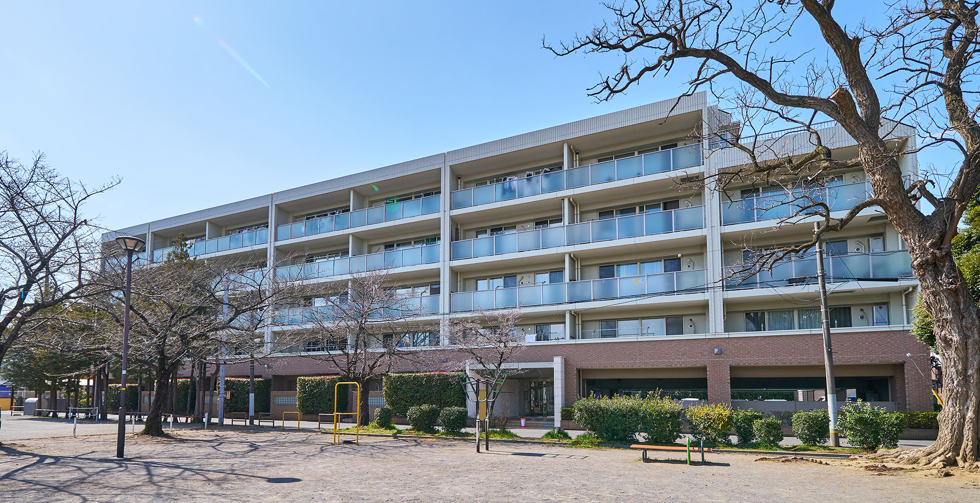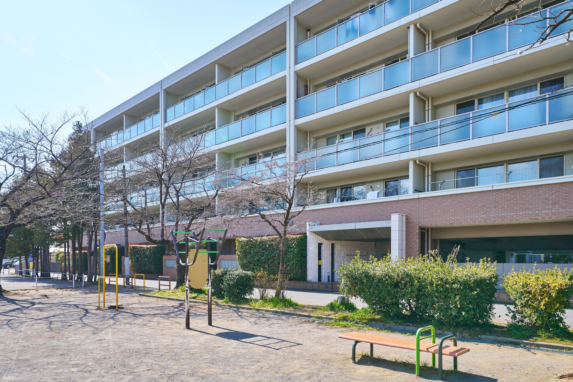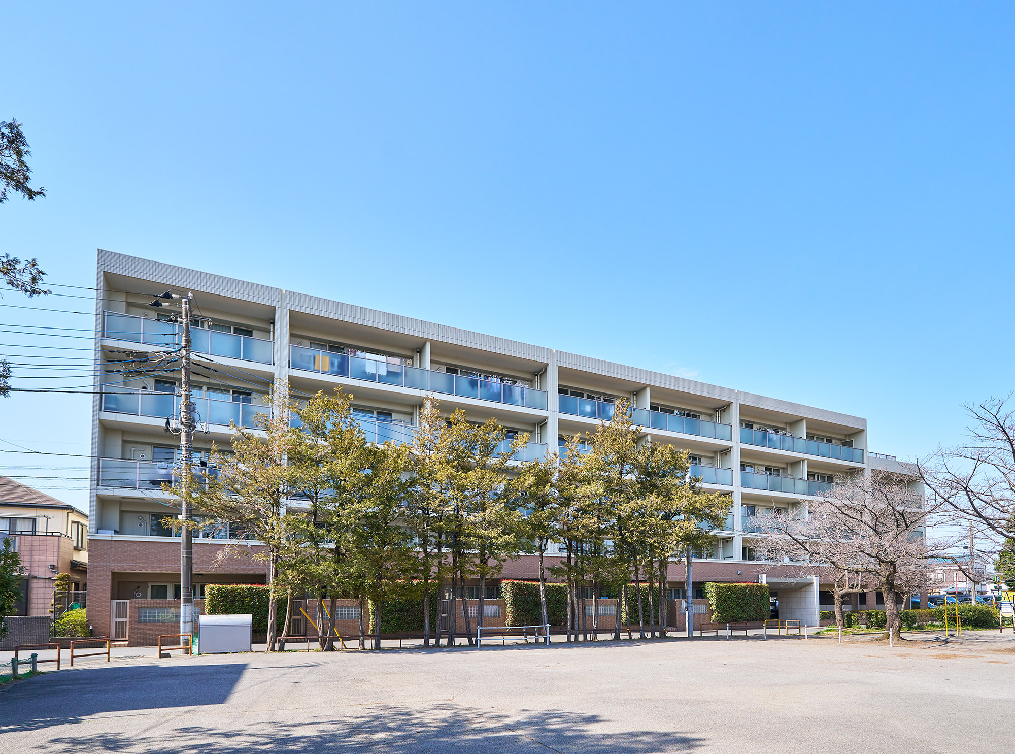 周辺に残る豊かな自然環境と、目の前に広がる公園の木々の潤い。ガラス手摺のバルコニーは、建物に洗練されたイメージを生みだすだけでなく、この場所に建つ建物だからこその美しさを創出しています。視界が開け、人々も集まりやすい公園前立地に建つ住まいとして、周辺の街の印象まで明るく変えられるようなホワイトのカラーリングに。表情が単調にならないように縦のラインがリズムをつくりながらも、シンプルな好感を保つように調和を追求。街並みにも美しい印象を添える洗練された佇まいです。