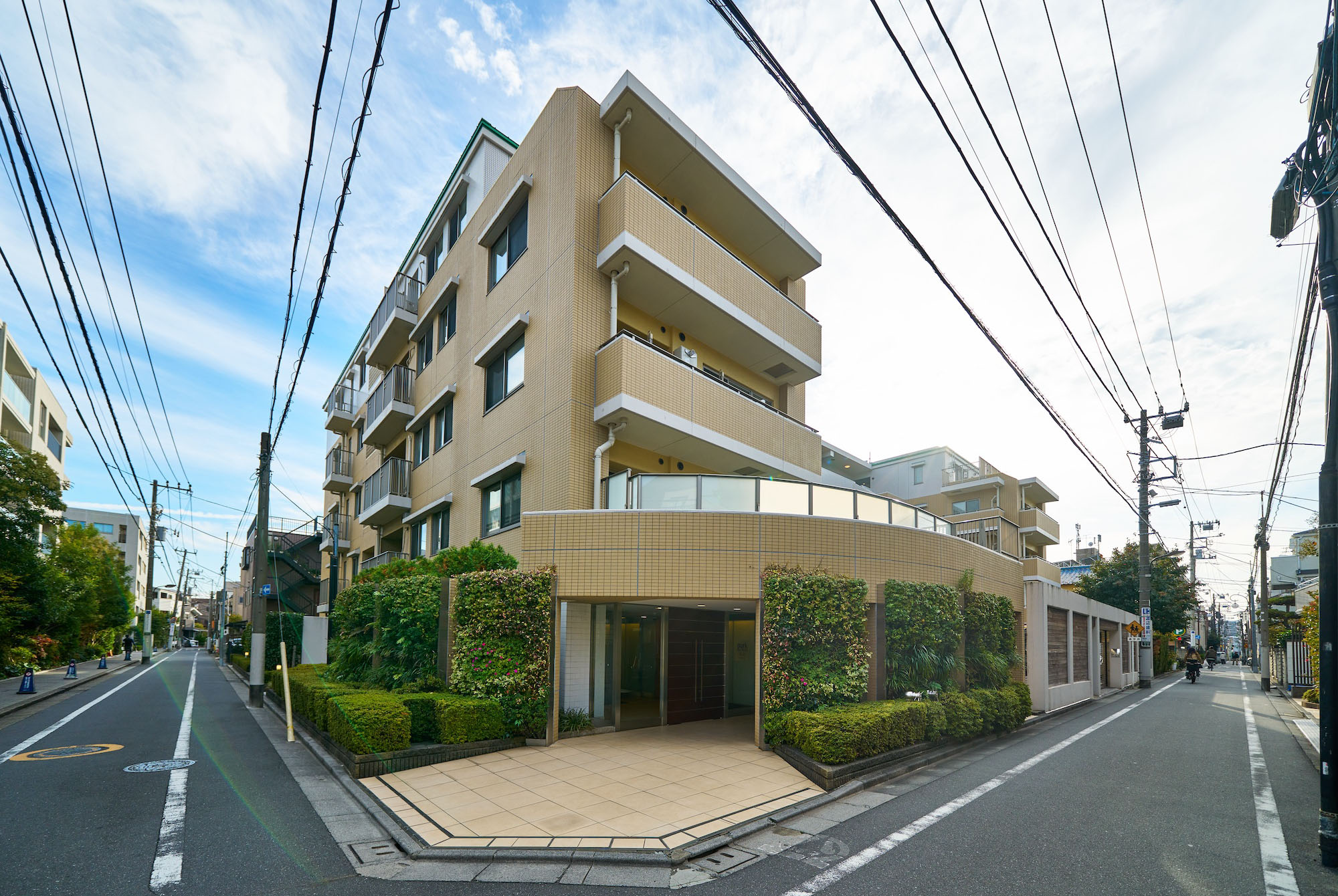 お客様を迎え入れるようなコの字型のフォルムが特徴的な外観。柔らかさや優しさを感じさせる暖色系のタイルを中心としたファサードには、潤い豊かな植栽が調和。ここに住まうことが誇らしくなるような、洗練された外観デザインです。エントランス回りには、季節に応じたマンションの顔を演出するネイチャーウォール(壁面緑化)を設置。住まいに心地よい癒しを醸成し、彩りのある都市型マンションがデザインされています。