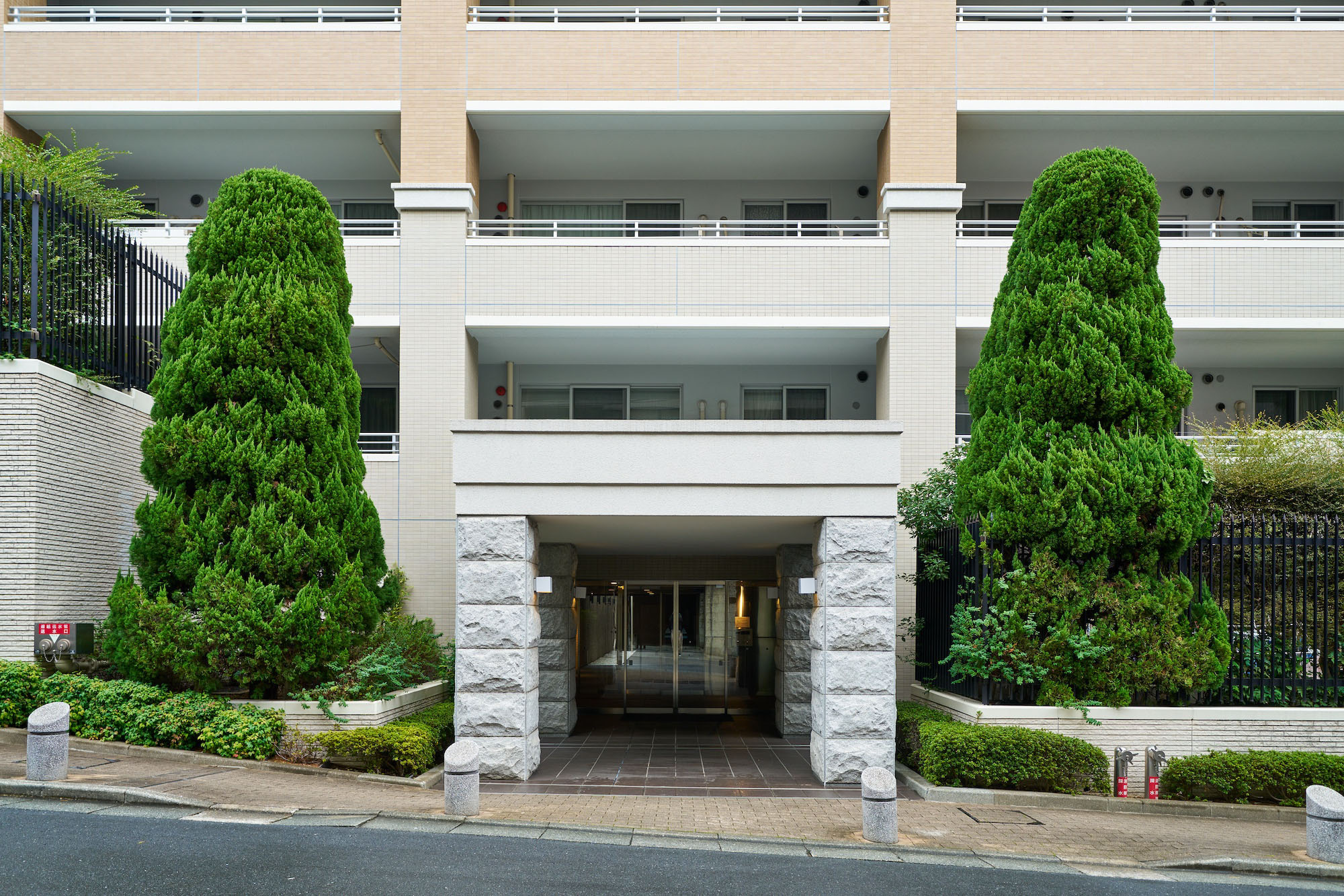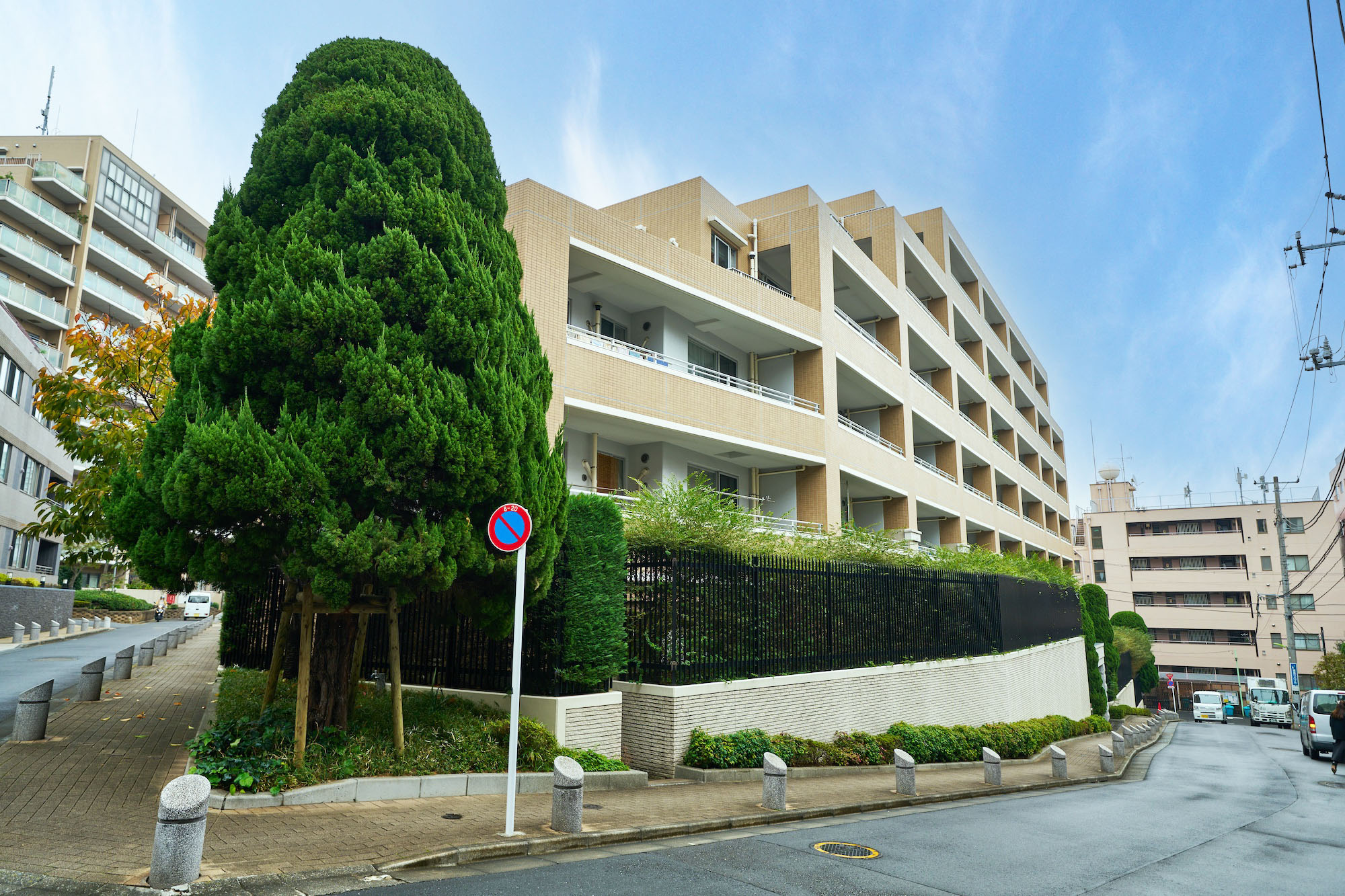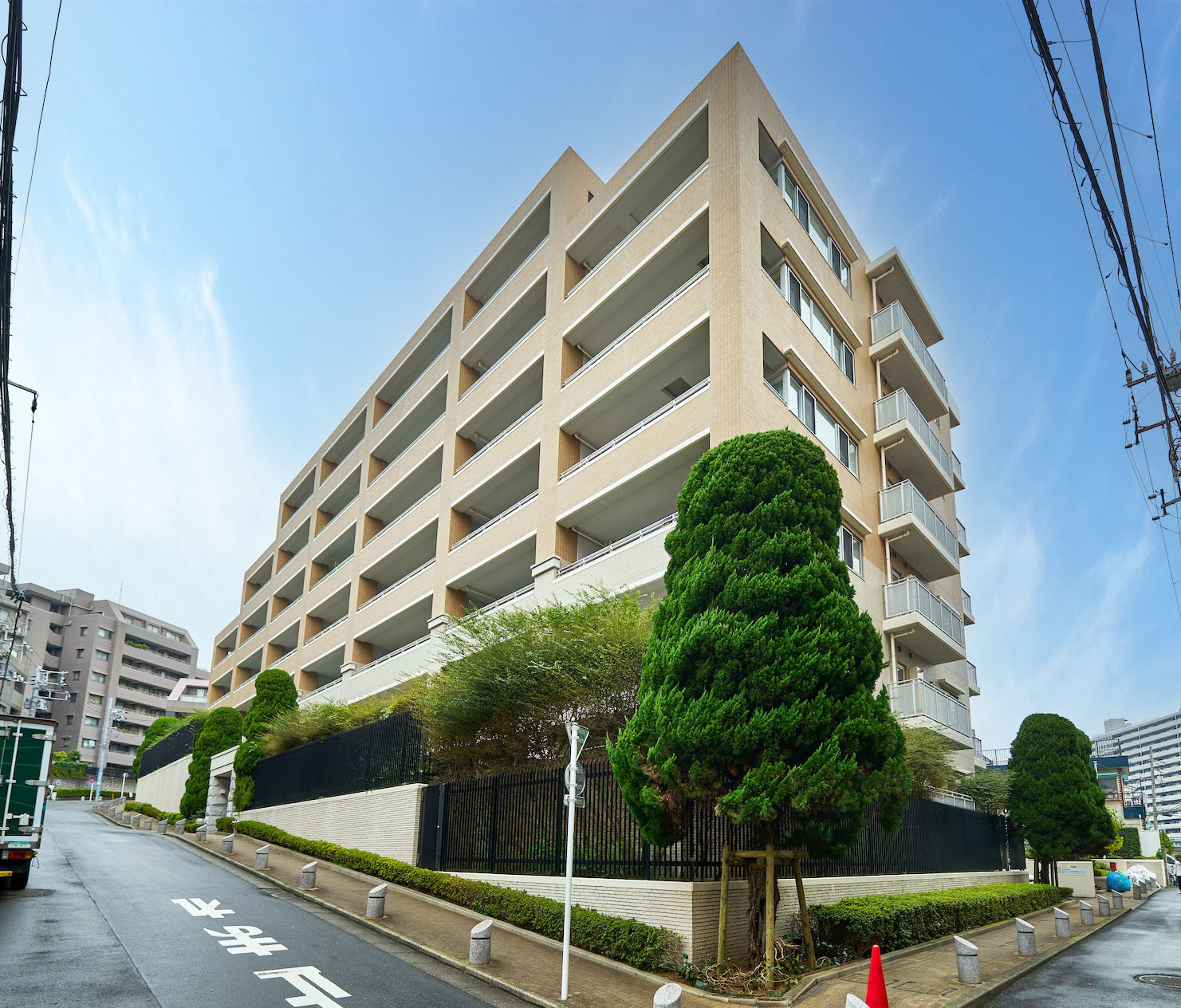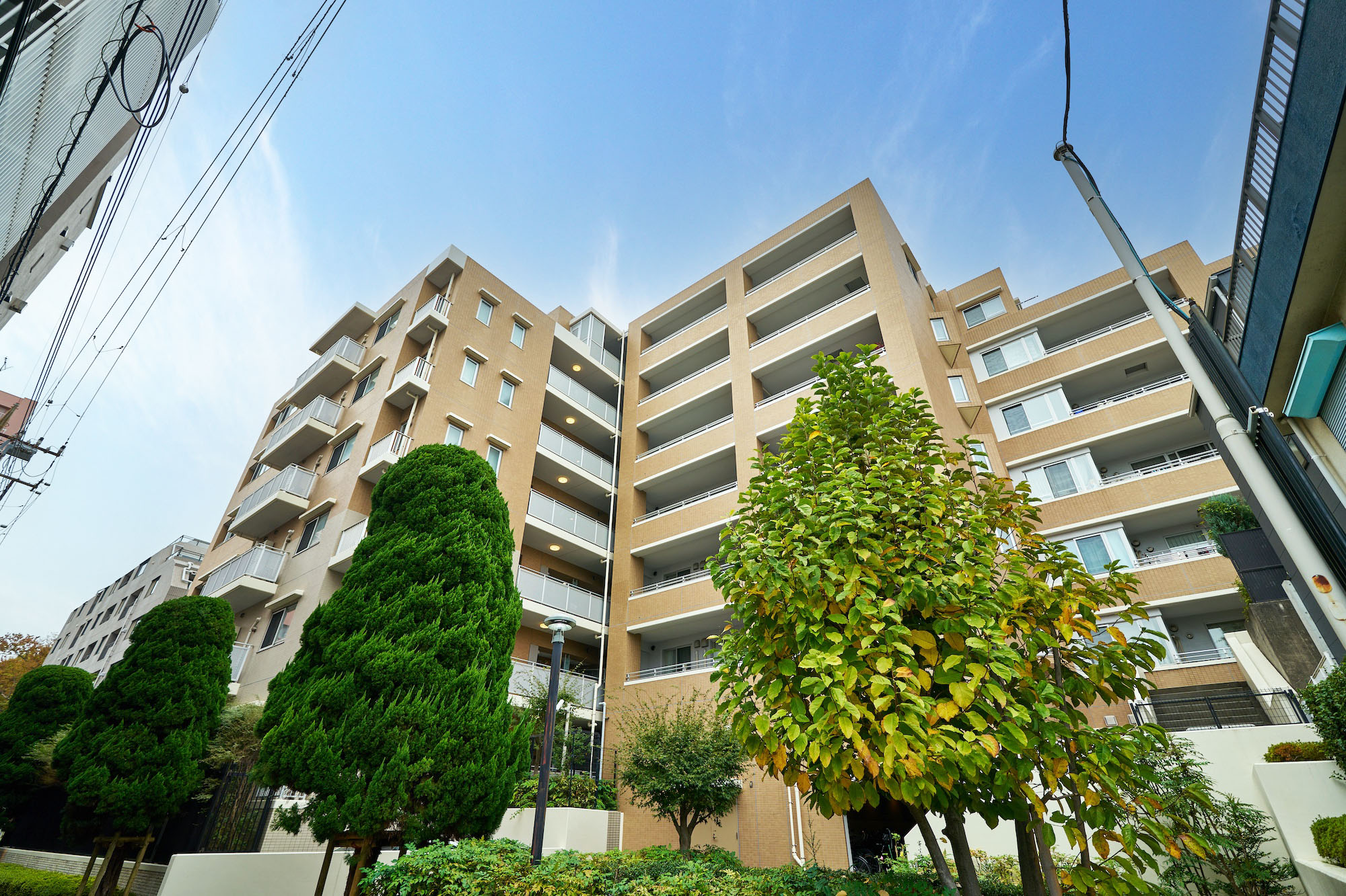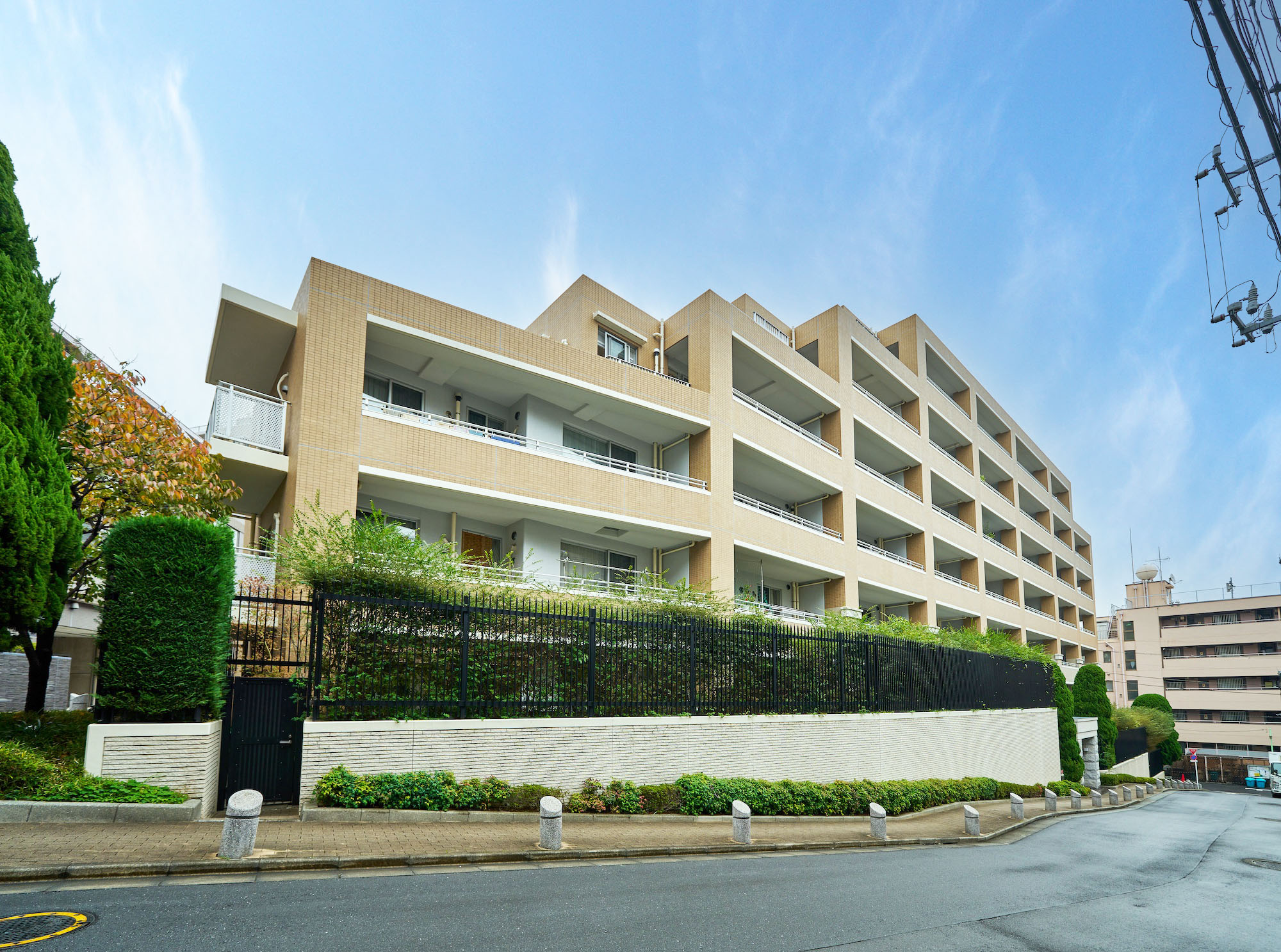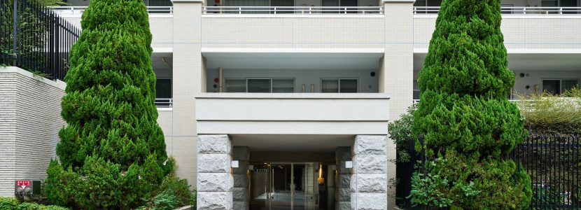 明るいベージュを基調とし、軒下やバルコニー手摺りの白をアクセントとした、優しく上品な印象の外観デザイン。低層部はオフホワイトの淡い色調でありながら、風合いのあるタイルや剣先フェンスが重厚感を醸成し、植栽の緑が一層映えて格調高い雰囲気を演出しています。「グランヴェル」はフランス語で「大いなる緑」という意味。その名の通り、建物の足元には豊かな植栽が配され、大井公園や鮫洲運動公園など緑が多い街並みと調和する、穏やかな佇まいです。