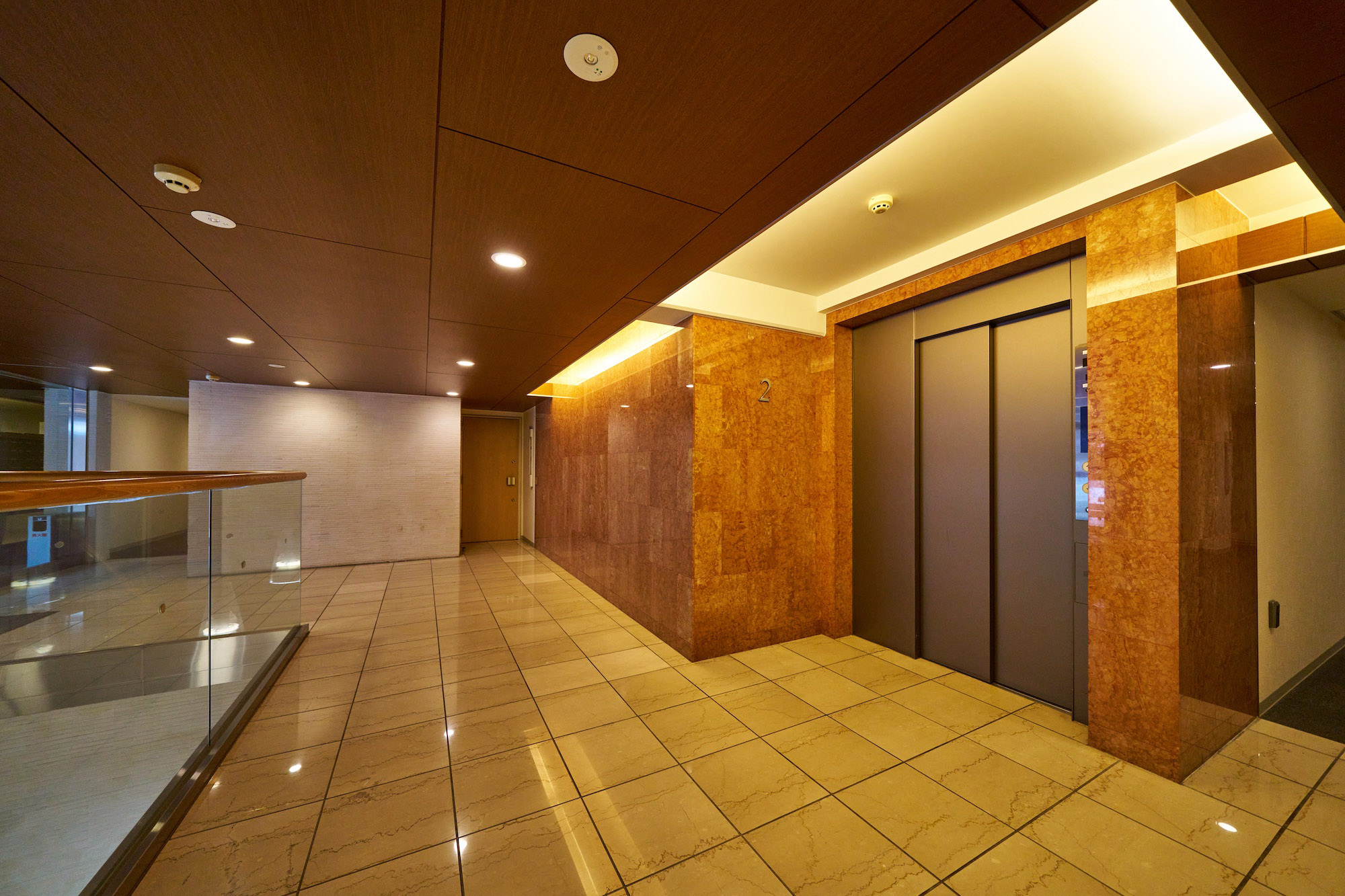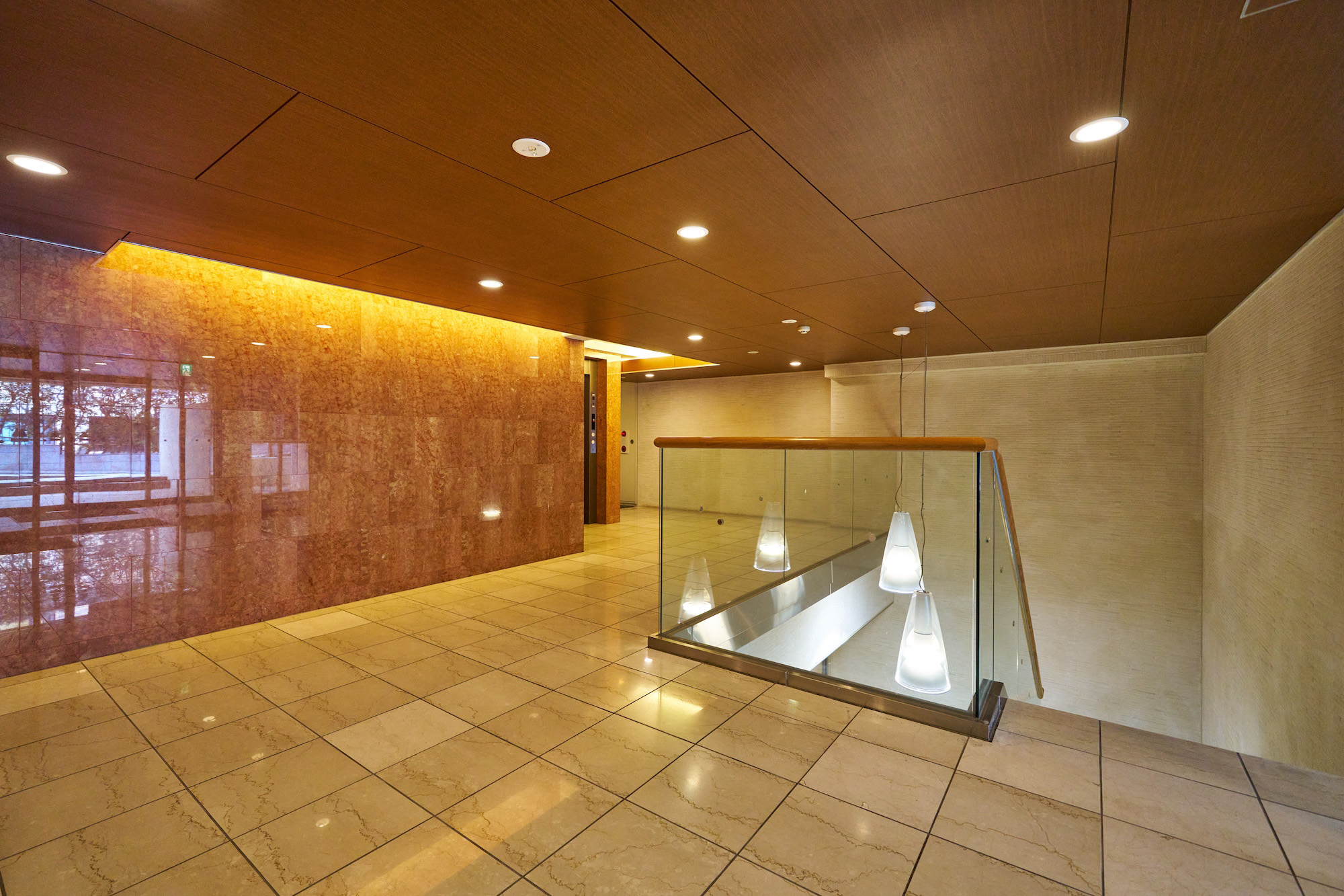 白いボーダータイルが爽やかな印象で出迎えるエントランス。内部へ足を踏み入れると、木目調の天井や光沢ある赤い大理石貼りの壁が、あたたかくも気品ある空間を形成しています。1階への階段の吹き抜けにはペンダントライトが灯り、幻想的な雰囲気を醸成。都心の喧騒から帰還した心をリセットさせ、やすらぎで包み込みながら私邸へと誘います。