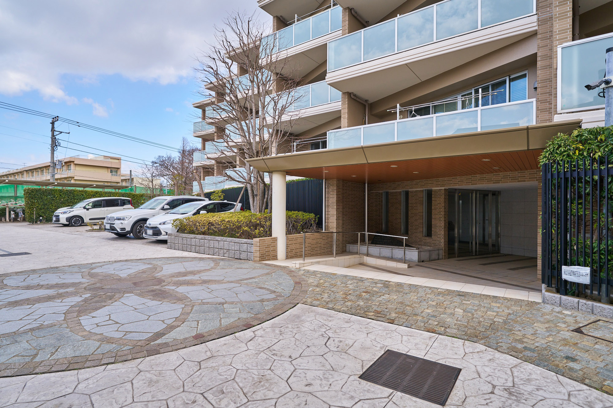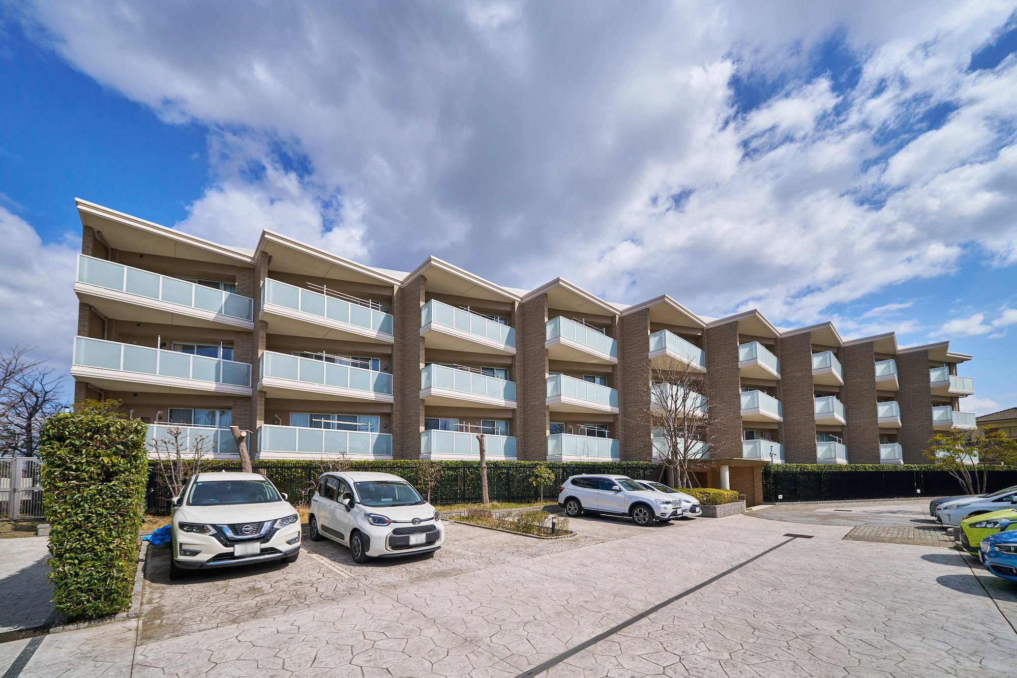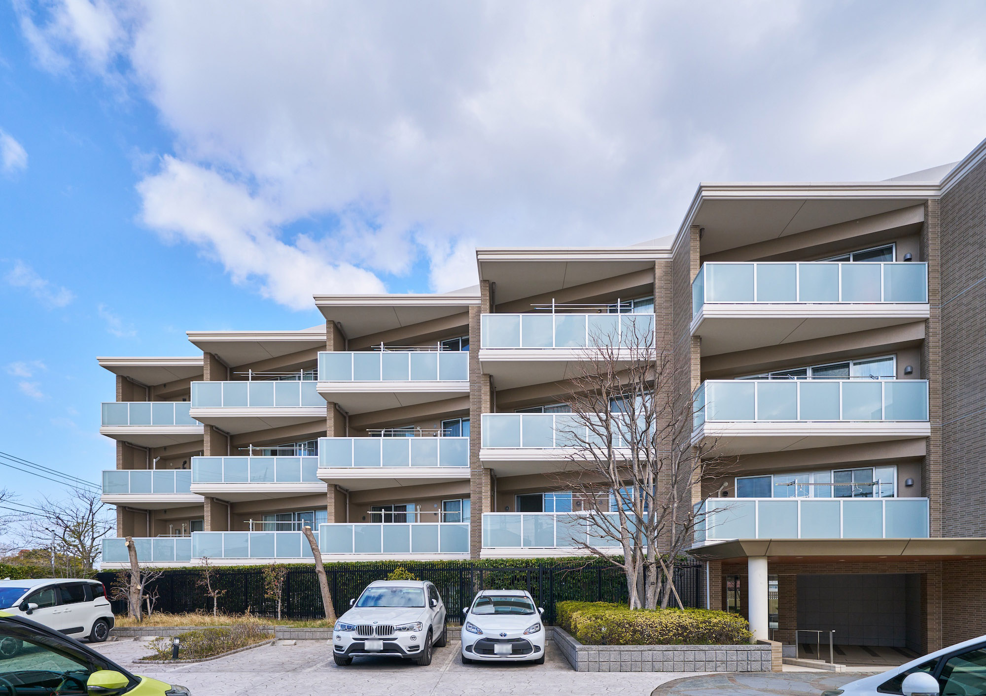 外壁は周囲に溶け込む柔らかなベージュ系のタイルを採用。三角形のバルコニーを雁行配置した設計は、個性的なフォルムとなって存在感を放ちつつ、効率の良い採光を実現しています。乳白色のガラス手摺は青空をよく映し、外観に爽やかな透明感をプラス。穏やかな街並みと調和する佇まいでありながら、圧倒的な開放感と独創的な造形美が際立つ低層レジデンスです。