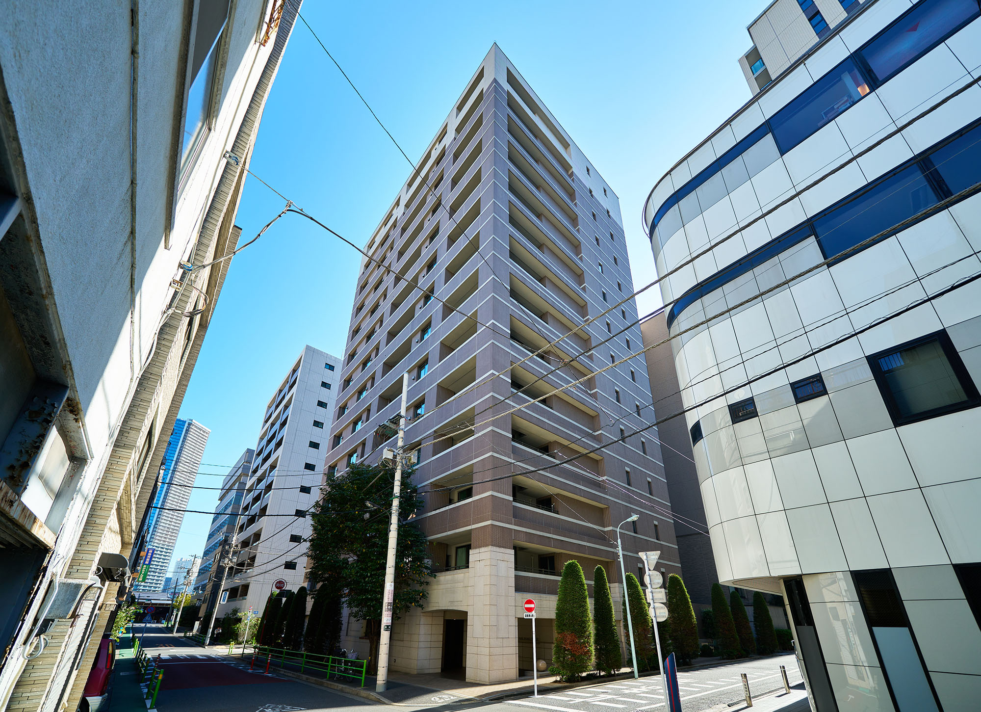 デザインのテーマはノスタルジー。築地付近は外国人居留地だった歴史があることから、モチーフとしてレンガを建築に取り入れ、街との一体感を演出しています。外装は織物のように陰影あるファサードを追求。基壇部は、赤茶色とのコントラストが印象的な、石貼と左官仕上げ。色やディテールにまでこだわった、新しさと懐かしさをあわせ持つ外観デザインです。