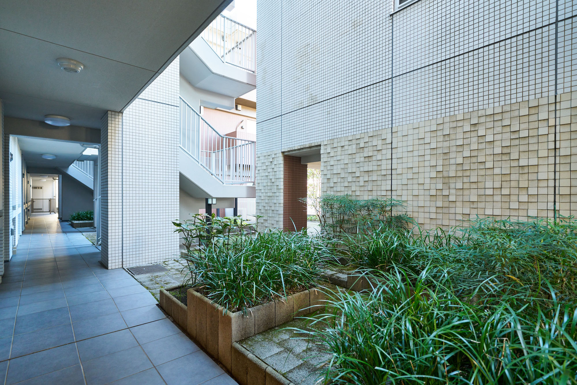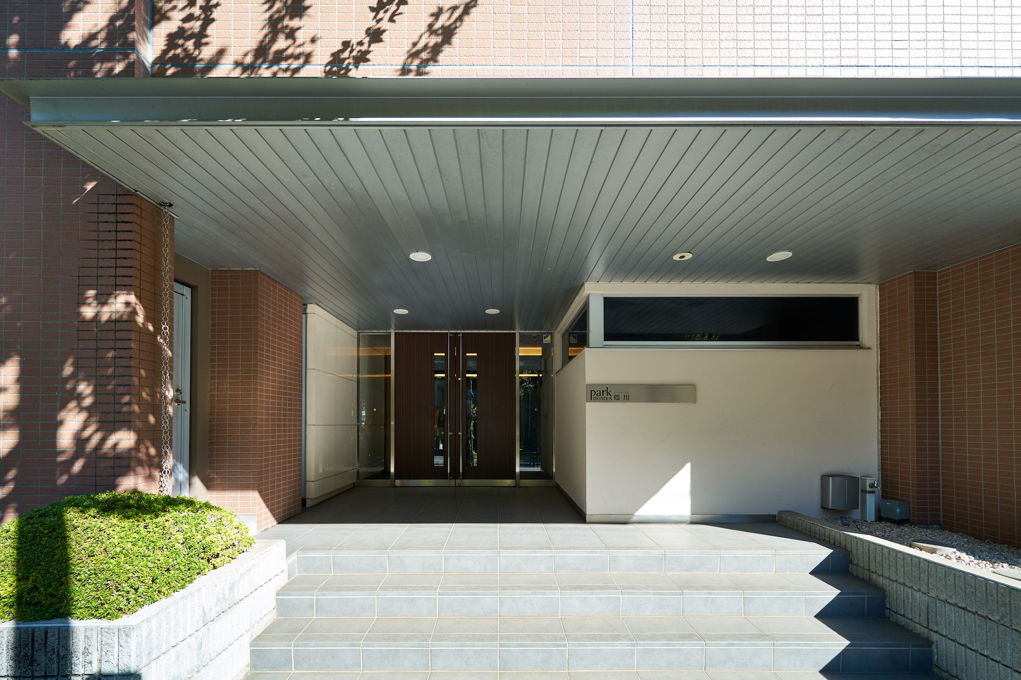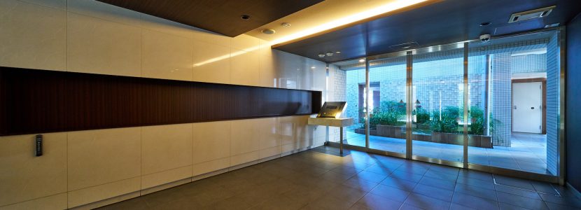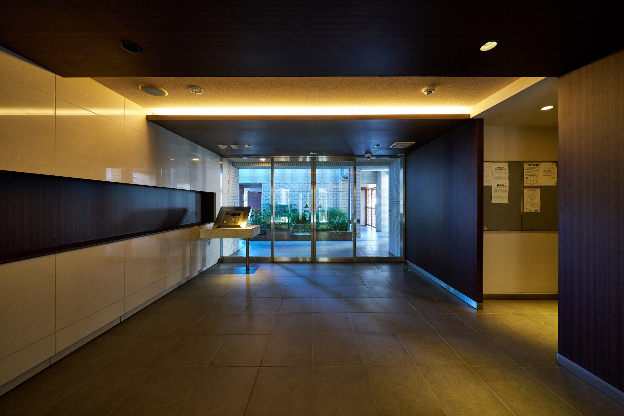 段差と奥行きを持たせることでプライバシー性を高めたエントランス。その先に広がるエントランスホールは、木や土の質感を大切にした素材を丁寧に組み合わせてデザイン。アースカラーと木目のコンビネーションで構成されたデザインウォールや、シックな木目調の天井が、上質で落ち着いた雰囲気を醸成しています。さらに共用廊下や中庭には植栽を多く配し、夜には幻想的な照明演出も。モダンな印象の中にも、暖かい雰囲気を漂わせ、住まう方の憩いの場を形成しています。私邸へのアプローチを優しく結ぶ、やすらぎと洗練の空間です。