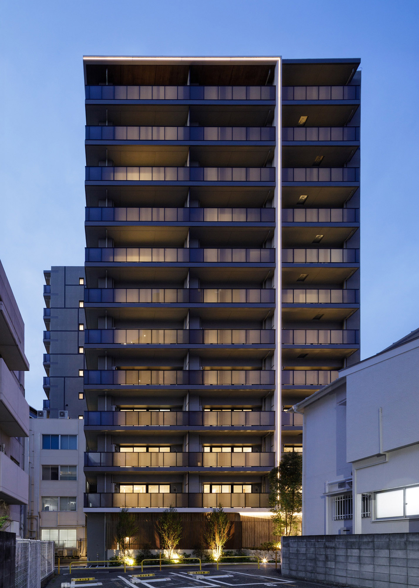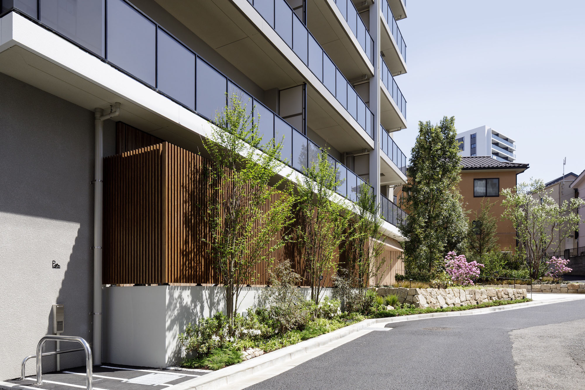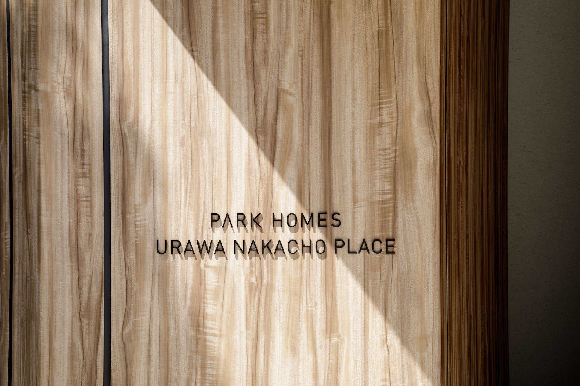 個性を主張することを抑えた優しい印象のファサード。上層部は浦和の住まいとしての品格を意識し、基壇部は木を使って柔らかく温かみのある雰囲気を演出しています。つま壁となる部分には、障子をモチーフとした格子のデザインを採用。インパクトのあるL字のライン照明が全体を引き締めています。控えめながらも確かな個性が光る、外観デザインです。
