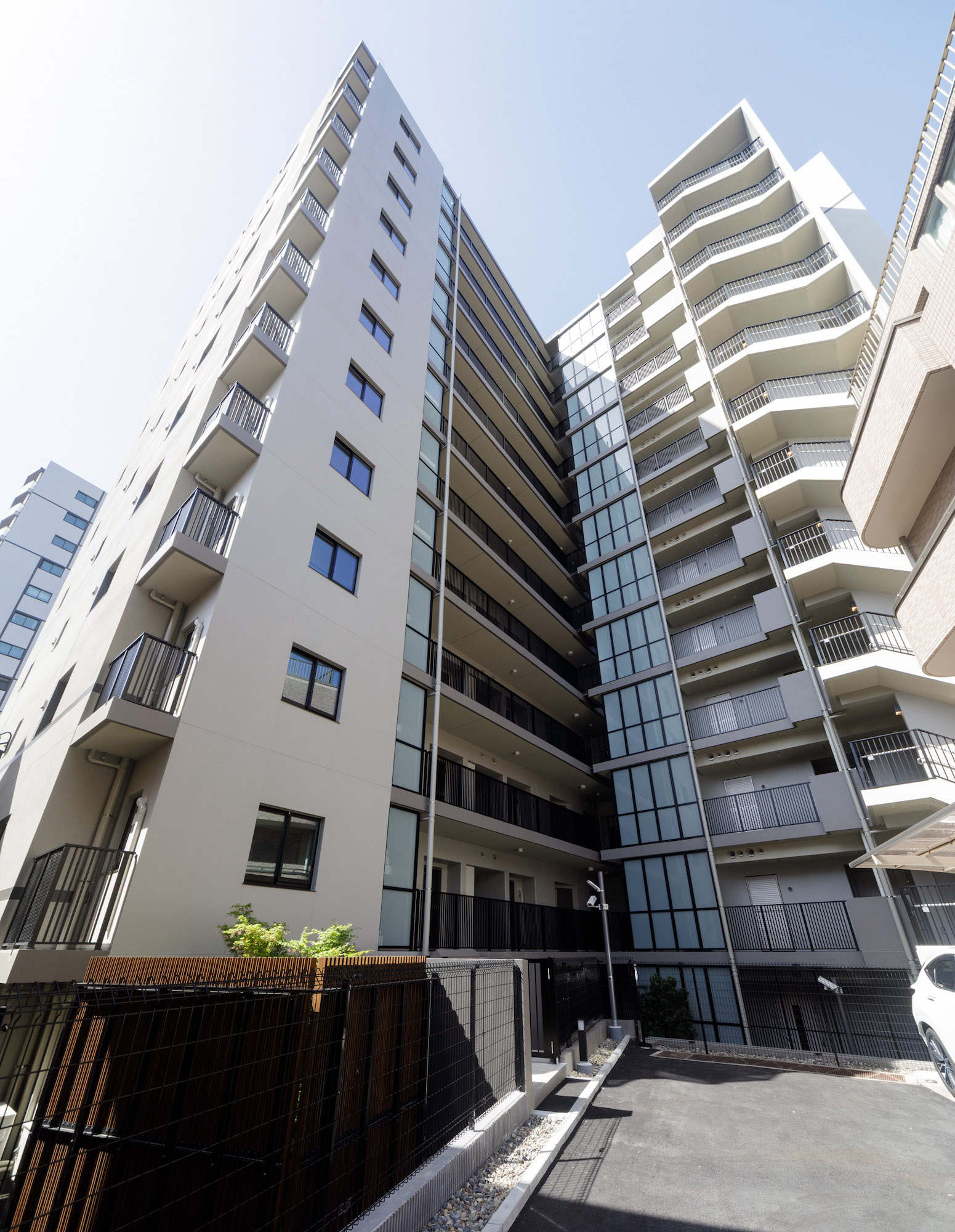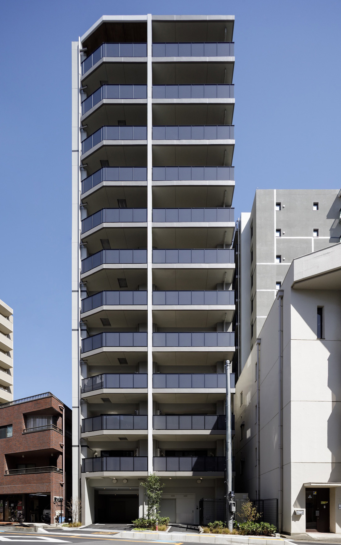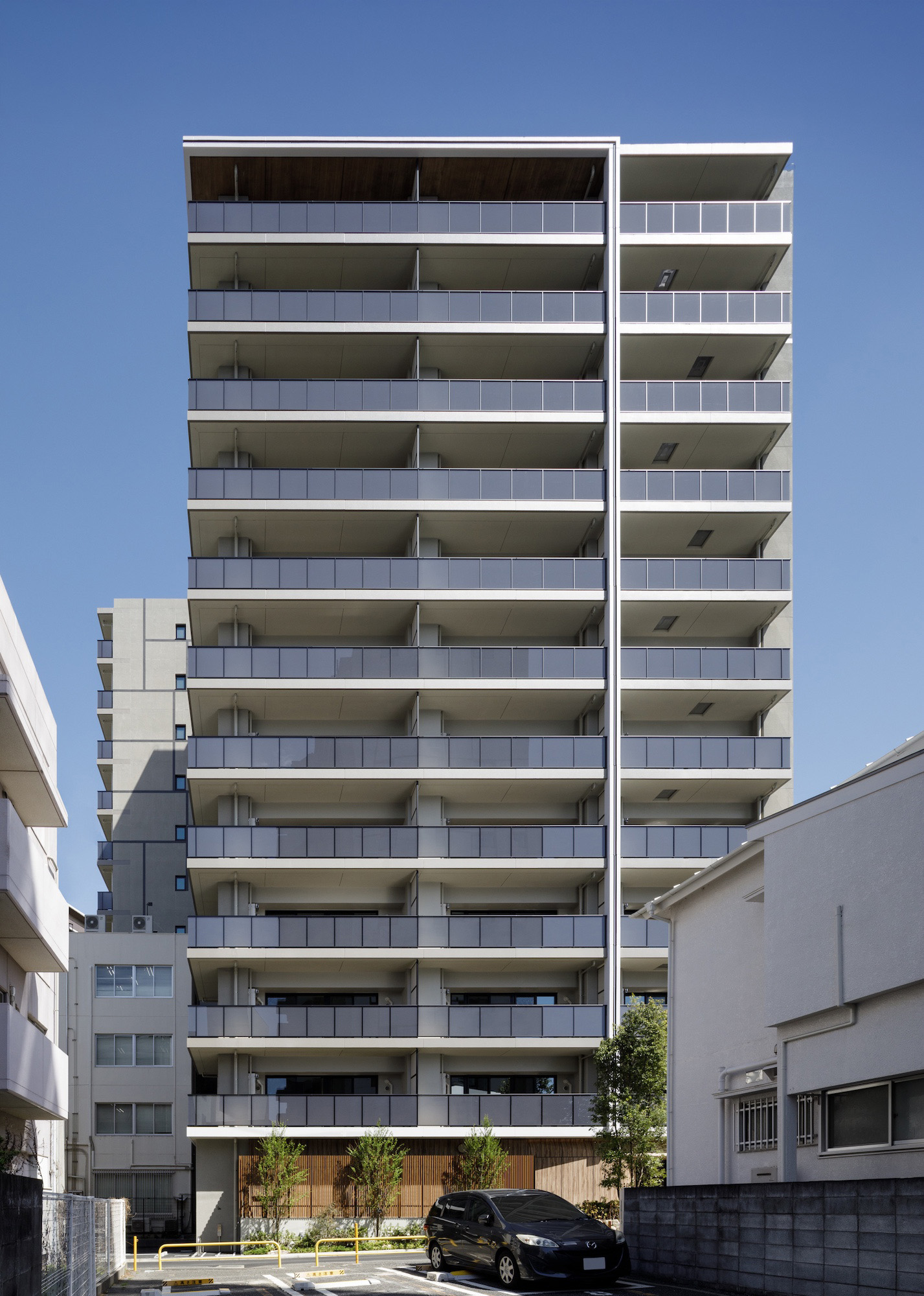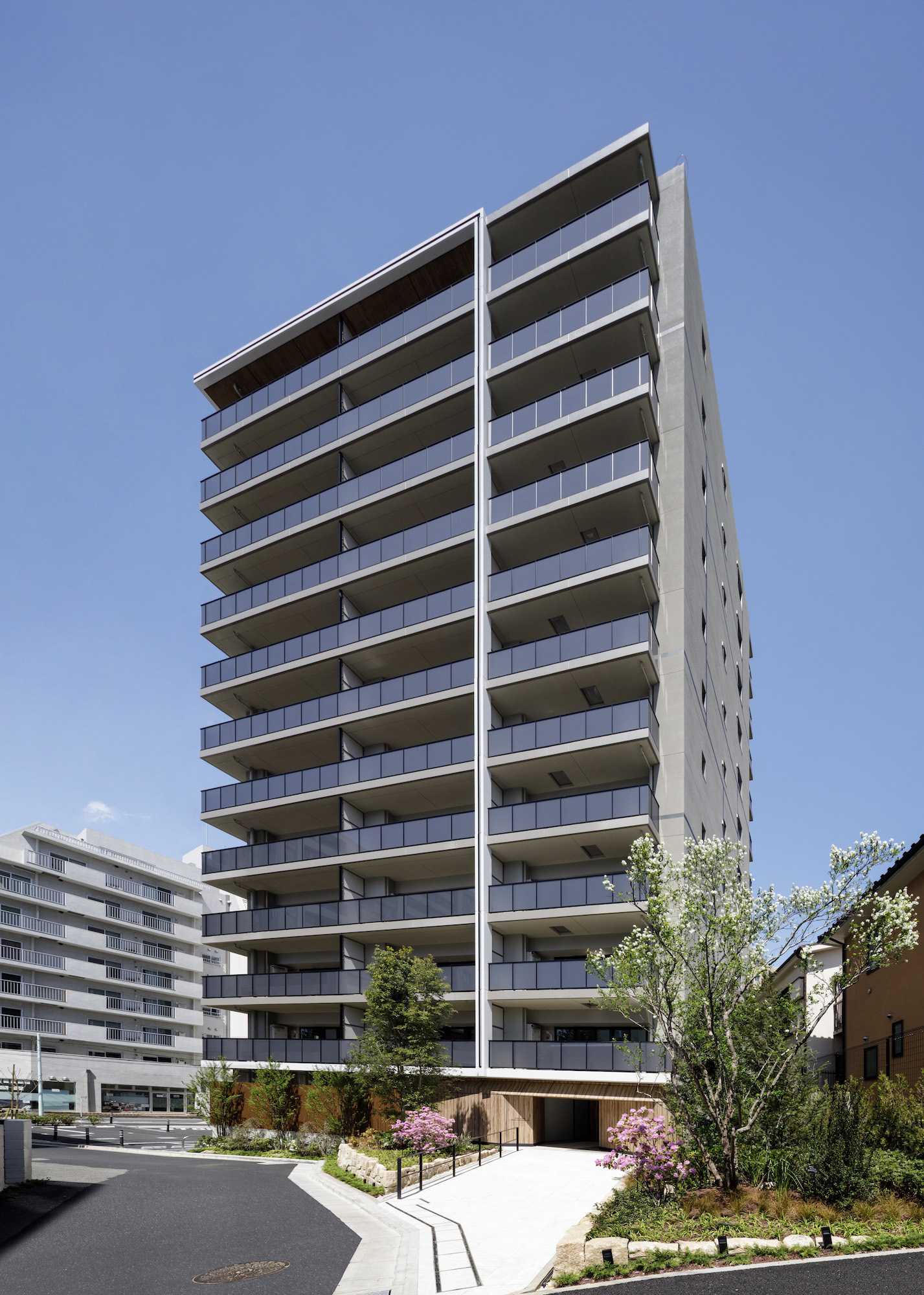 個性を主張することを抑えた優しい印象のファサード。上層部は浦和の住まいとしての品格を意識し、基壇部は木を使って柔らかく温かみのある雰囲気を演出しています。つま壁となる部分には、障子をモチーフとした格子のデザインを採用。インパクトのあるL字のライン照明が全体を引き締めています。控えめながらも確かな個性が光る、外観デザインです。