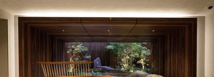たっぷりとした植栽に、柔らかな灯りが照らすエントランスアプローチ。温かみのある木のゲートを抜けると、中庭を望むエントランスホールが広がります。美しい家具と石、自然物と人工物を織り交ぜて創り上げられた、静謐な空間です。エントランスアプローチから中庭まで、帰ってきた方が徐々に心を落ち着かせていくシークエンスを考えて、デザインされています。