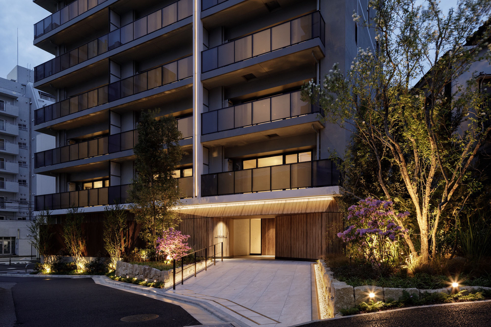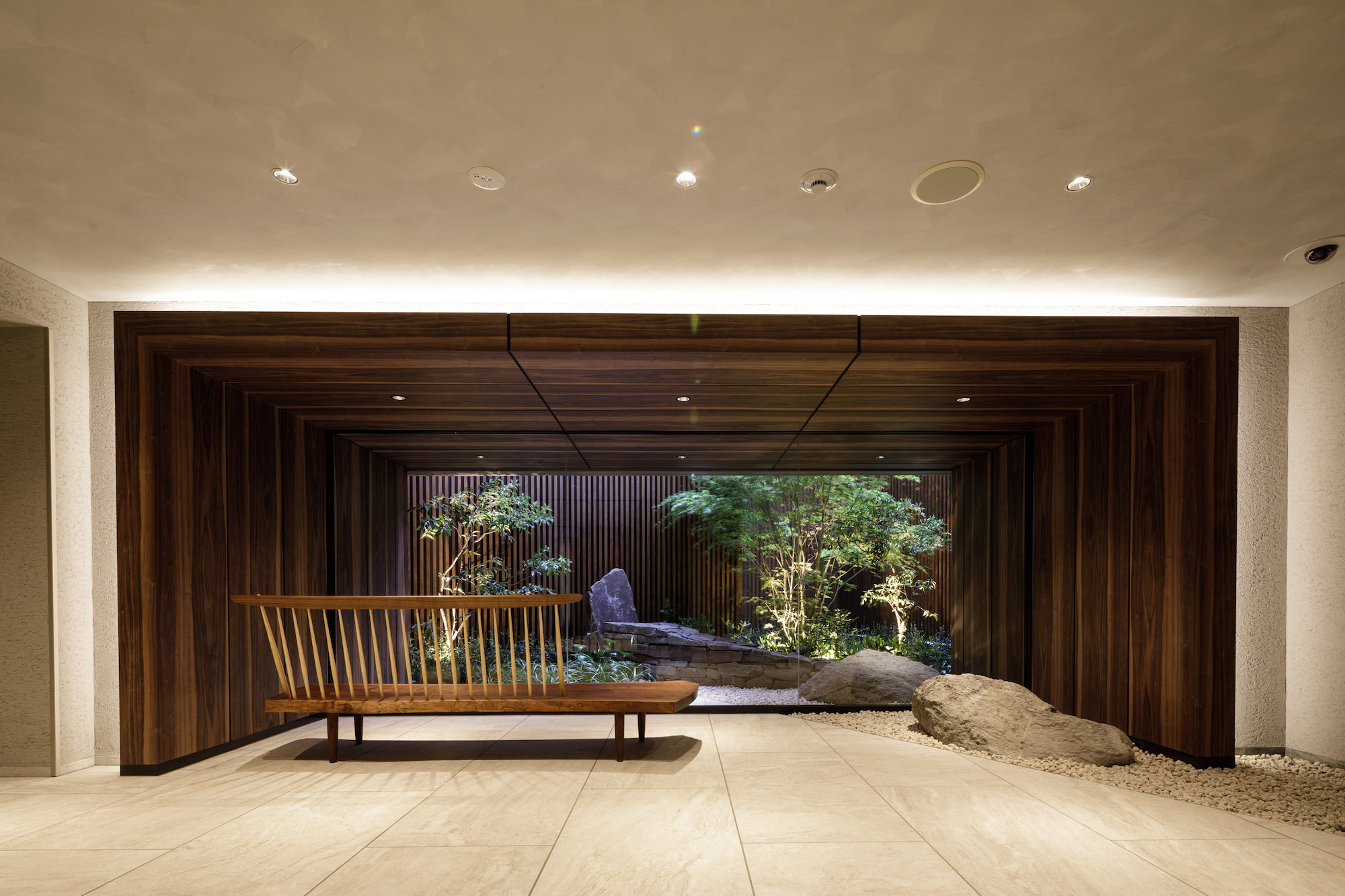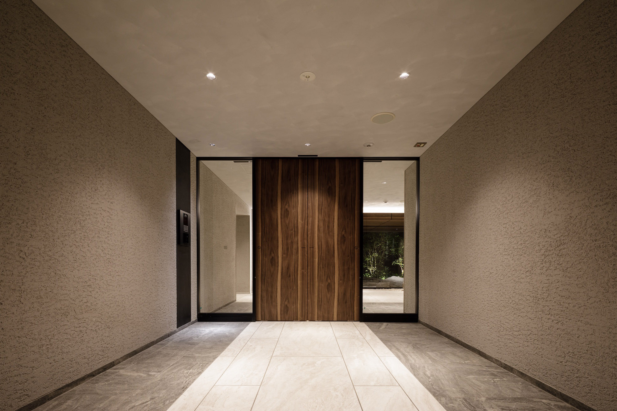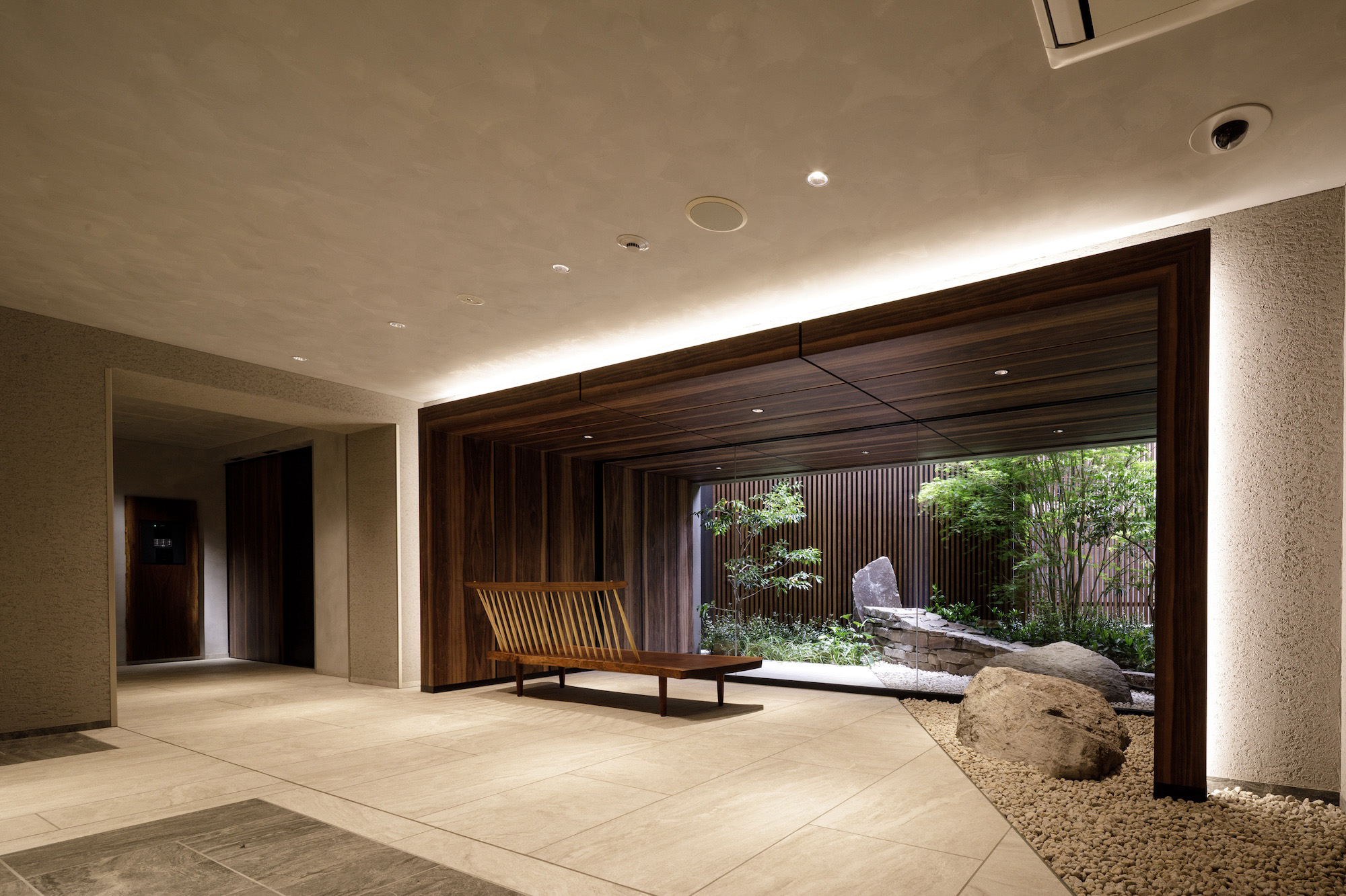 たっぷりとした植栽に、柔らかな灯りが照らすエントランスアプローチ。温かみのある木のゲートを抜けると、中庭を望むエントランスホールが広がります。美しい家具と石、自然物と人工物を織り交ぜて創り上げられた、静謐な空間です。エントランスアプローチから中庭まで、帰ってきた方が徐々に心を落ち着かせていくシークエンスを考えて、デザインされています。