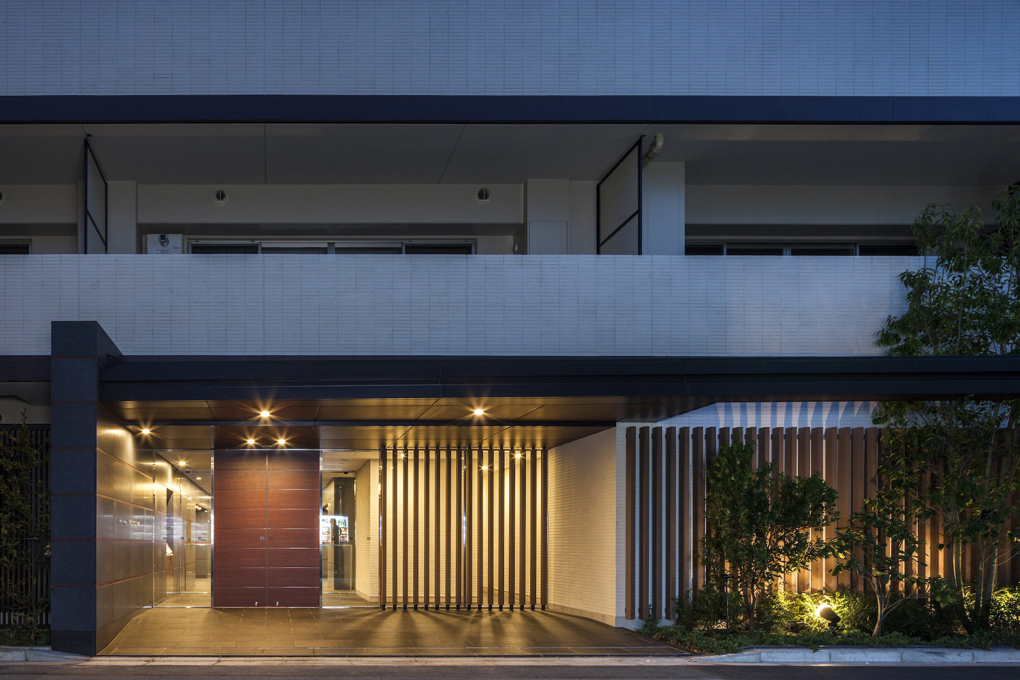 街並みと調和するベージュ系のタイルを基調に、縦横にシックなダークブラウンのアクセントを施した、洗練されたファサード。バルコニーを乳白のガラス手摺とアルミルーバー手摺を組み合わせることで、豊かな表情を創り出しています。足元には豊かな植栽を配し、建物との美しいコントラストを演出。閑静な住宅街に馴染みながらも存在感のある外観デザインです。