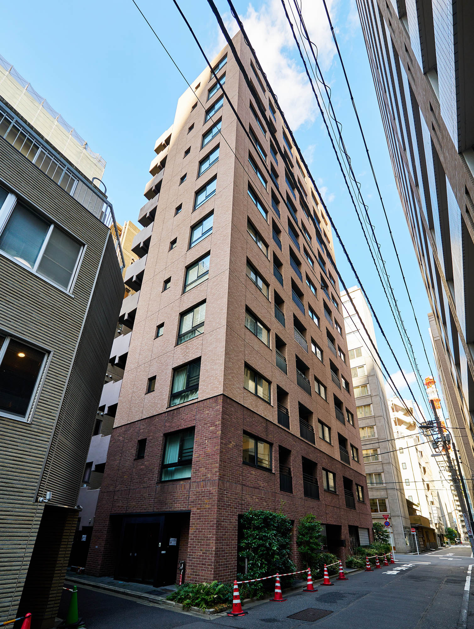 外壁基壇部に煉瓦調のタイルを施したファサードデザイン。重厚感を醸しながらもどこか穏やかな外観は、煉瓦づくりの西欧建築が建ち並んだ、古き良き銀座の街並みをイメージしています。華やかな銀座の中でも比較的閑静な一角に位置する「パークリュクス銀座8丁目 mono」に相応しい、悠々とした貫禄を感じさせる佇まいです。