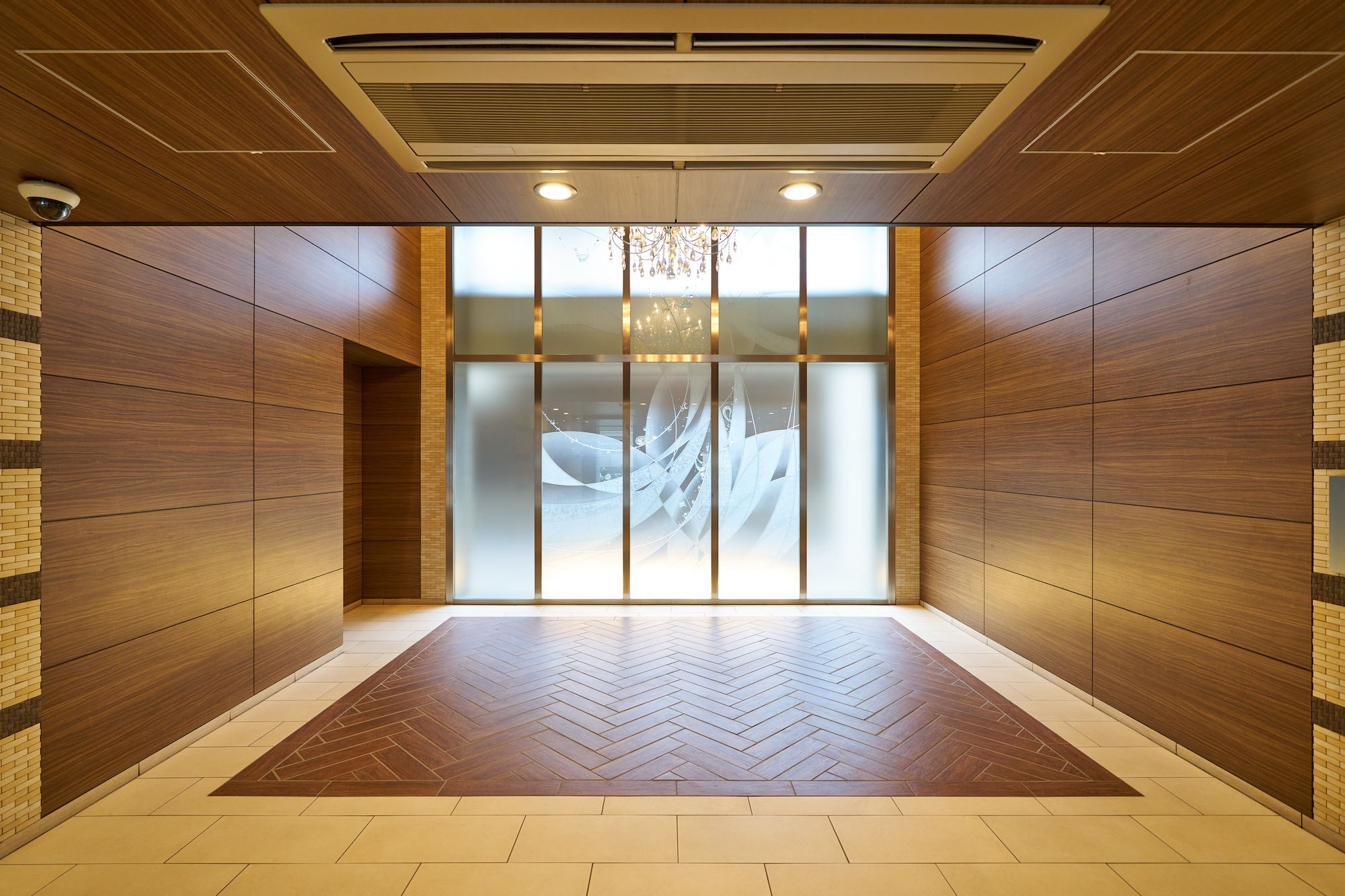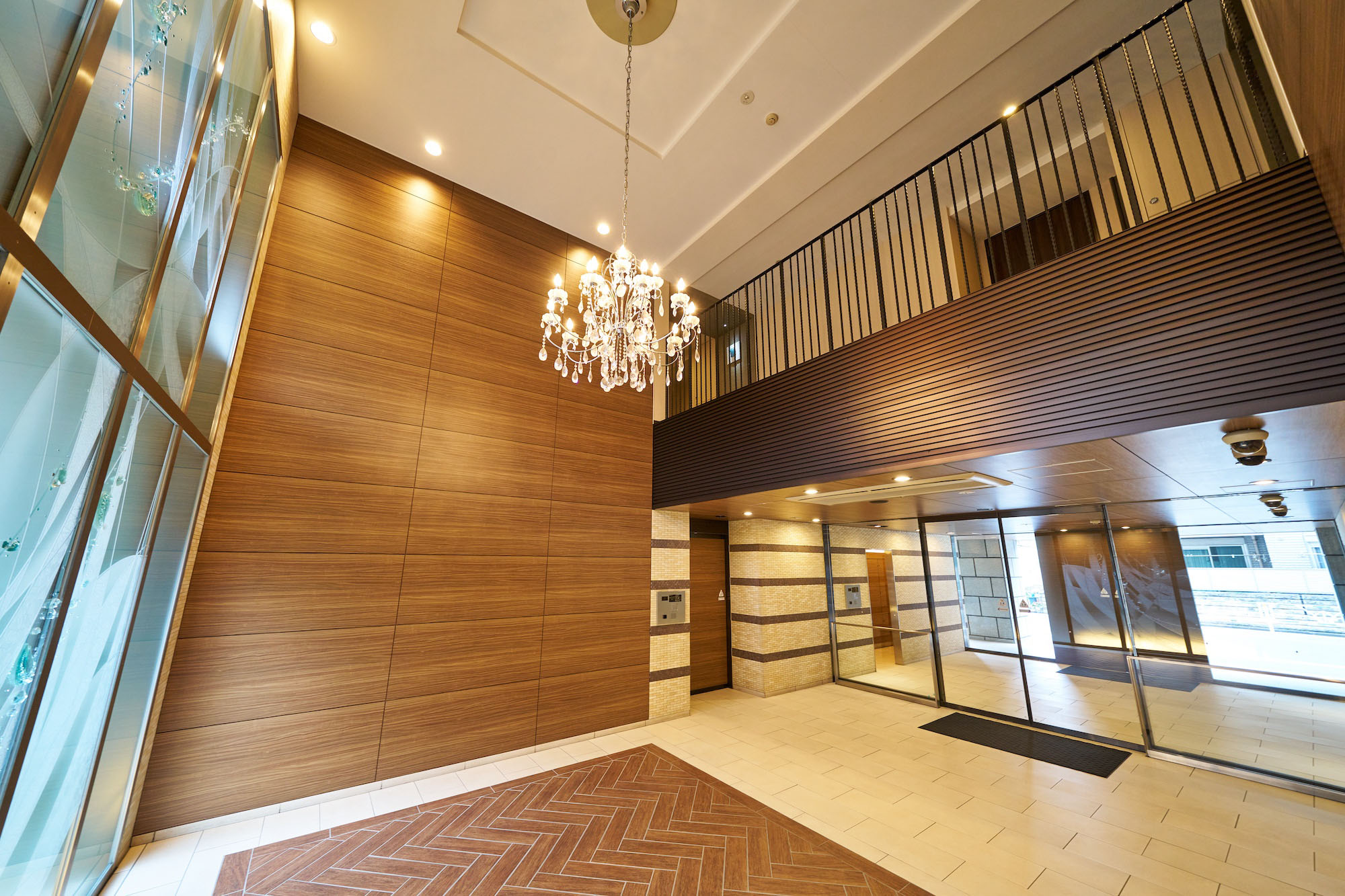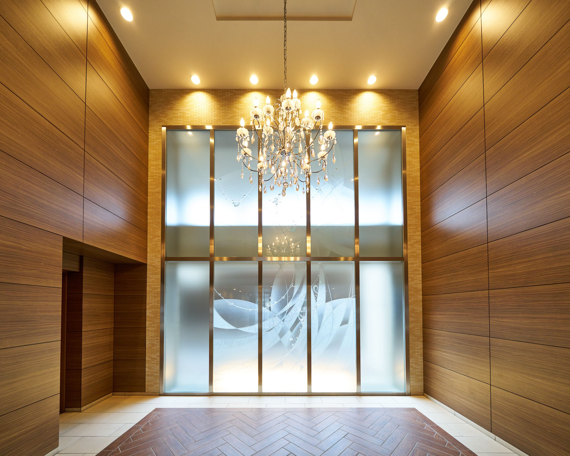 御影石仕上げの柱を抜けたアプローチの両サイドには、ライムストーン系とブラウン系のタイルの組み合わせによって織物のような繊細な表情の壁を配置。あたたかみある木調のエントランスドアと天井とともに、優しい印象のエントランスを創り出しています。館内に入るとまず出迎えるのは、床と壁を木調とした二層吹き抜けのエントランスホールです。壁いっぱいに広がるオリジナル・グラスアートが、開放的な出会いの場をより華やかに演出。頭上に煌めくゴージャスなシャンデリアとともに、期待感を高めてくれます。共用廊下は、ホテルライクな内廊下設計を採用し、壁にアート作品を配したギャラリーのような空間。各住戸玄関には住戸内への直接的な視線を遮るアルコープが設けられており、プライバシー保護にも配慮されています。
