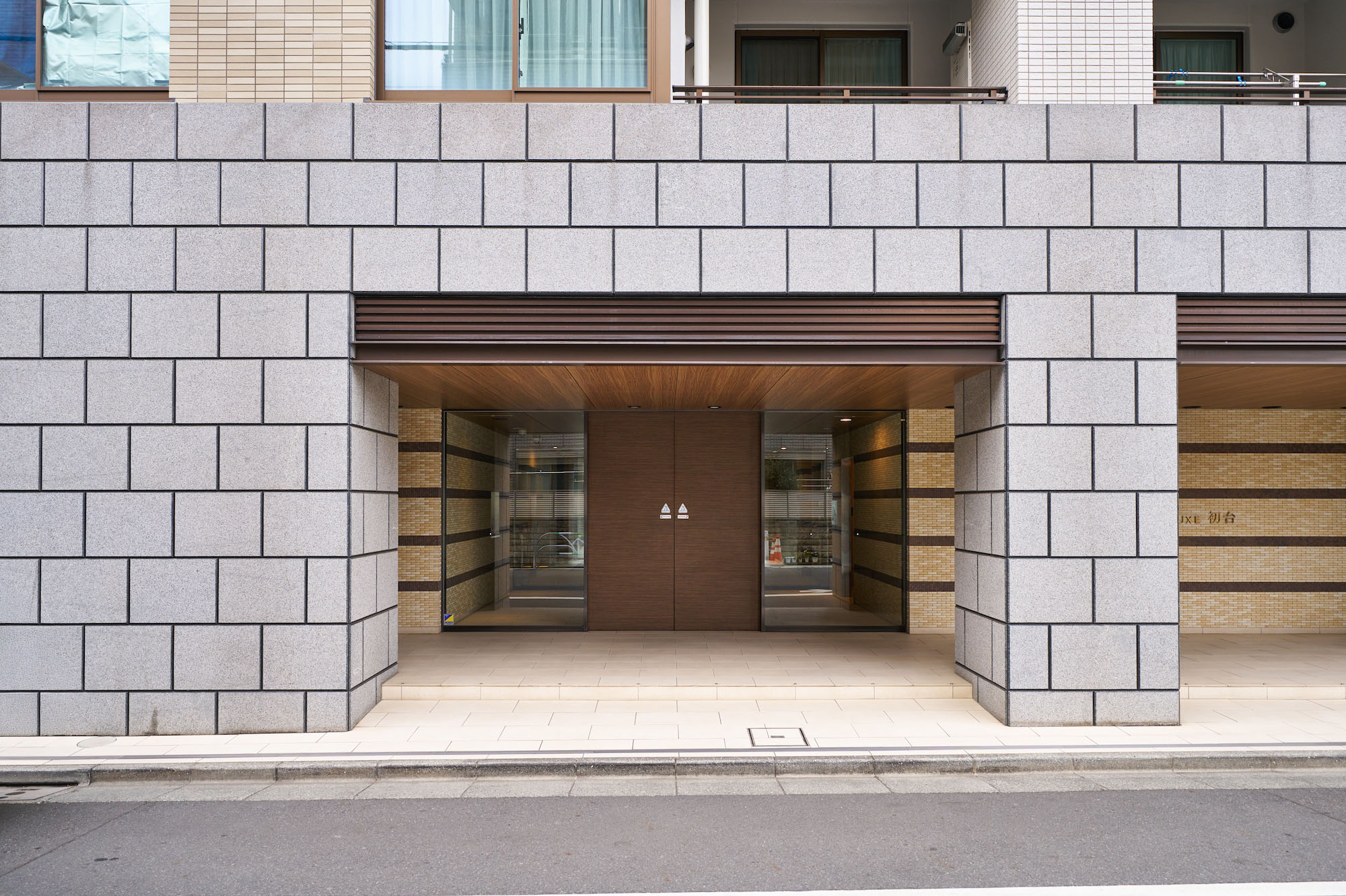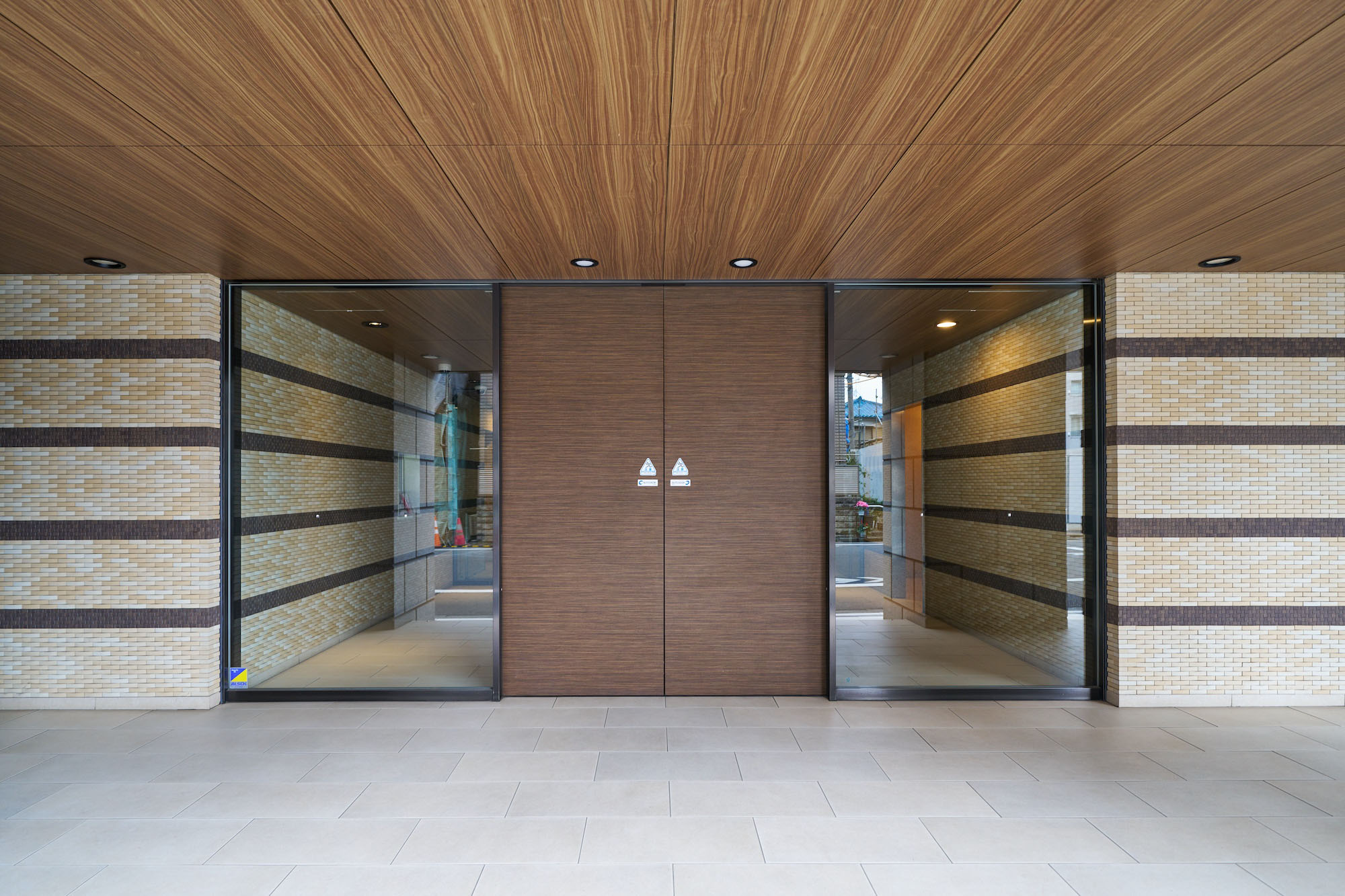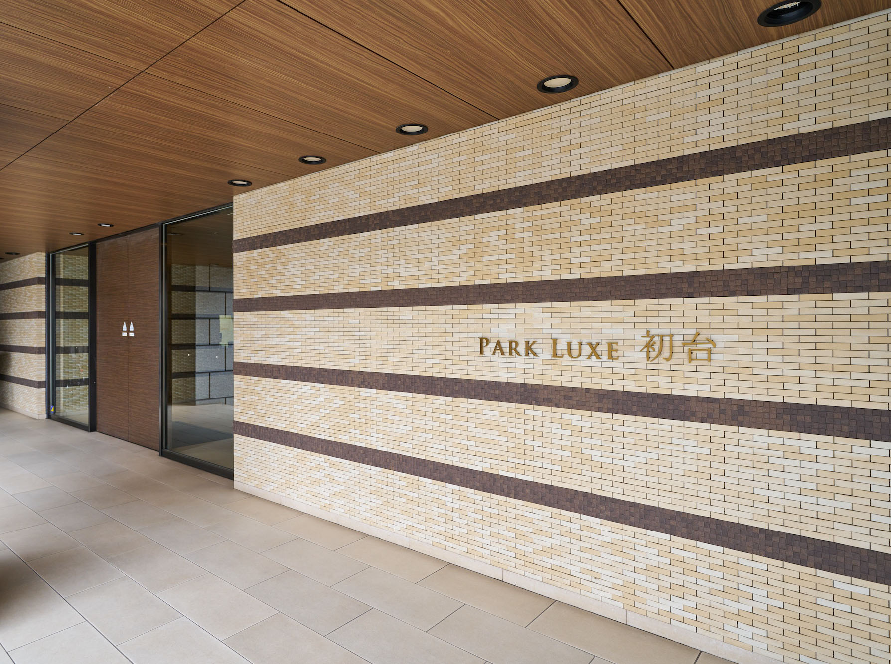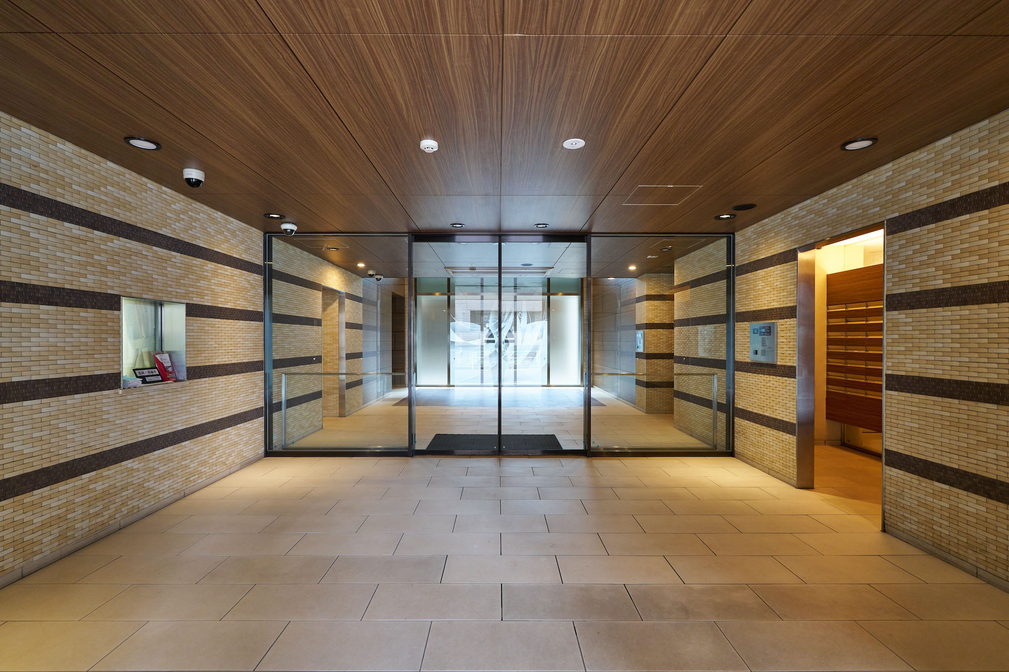 御影石仕上げの柱を抜けたアプローチの両サイドには、ライムストーン系とブラウン系のタイルの組み合わせによって織物のような繊細な表情の壁を配置。あたたかみある木調のエントランスドアと天井とともに、優しい印象のエントランスを創り出しています。館内に入るとまず出迎えるのは、床と壁を木調とした二層吹き抜けのエントランスホールです。壁いっぱいに広がるオリジナル・グラスアートが、開放的な出会いの場をより華やかに演出。頭上に煌めくゴージャスなシャンデリアとともに、期待感を高めてくれます。共用廊下は、ホテルライクな内廊下設計を採用し、壁にアート作品を配したギャラリーのような空間。各住戸玄関には住戸内への直接的な視線を遮るアルコープが設けられており、プライバシー保護にも配慮されています。