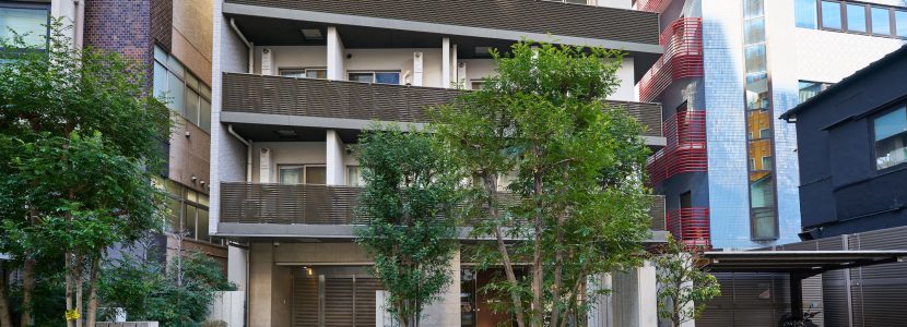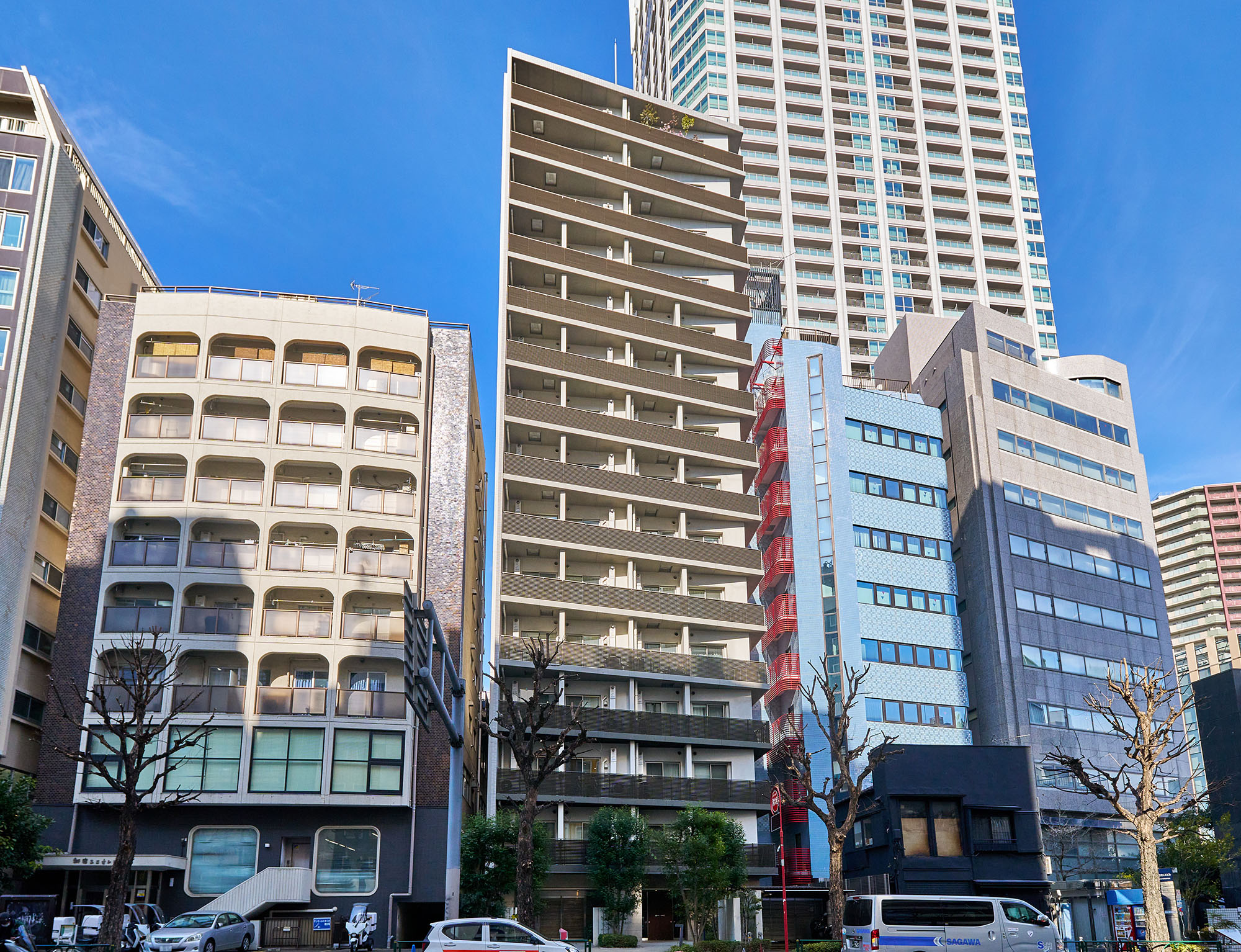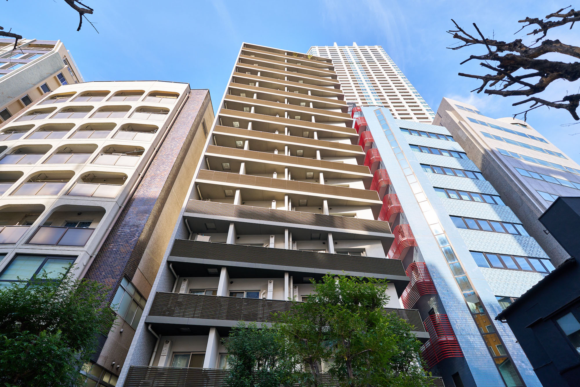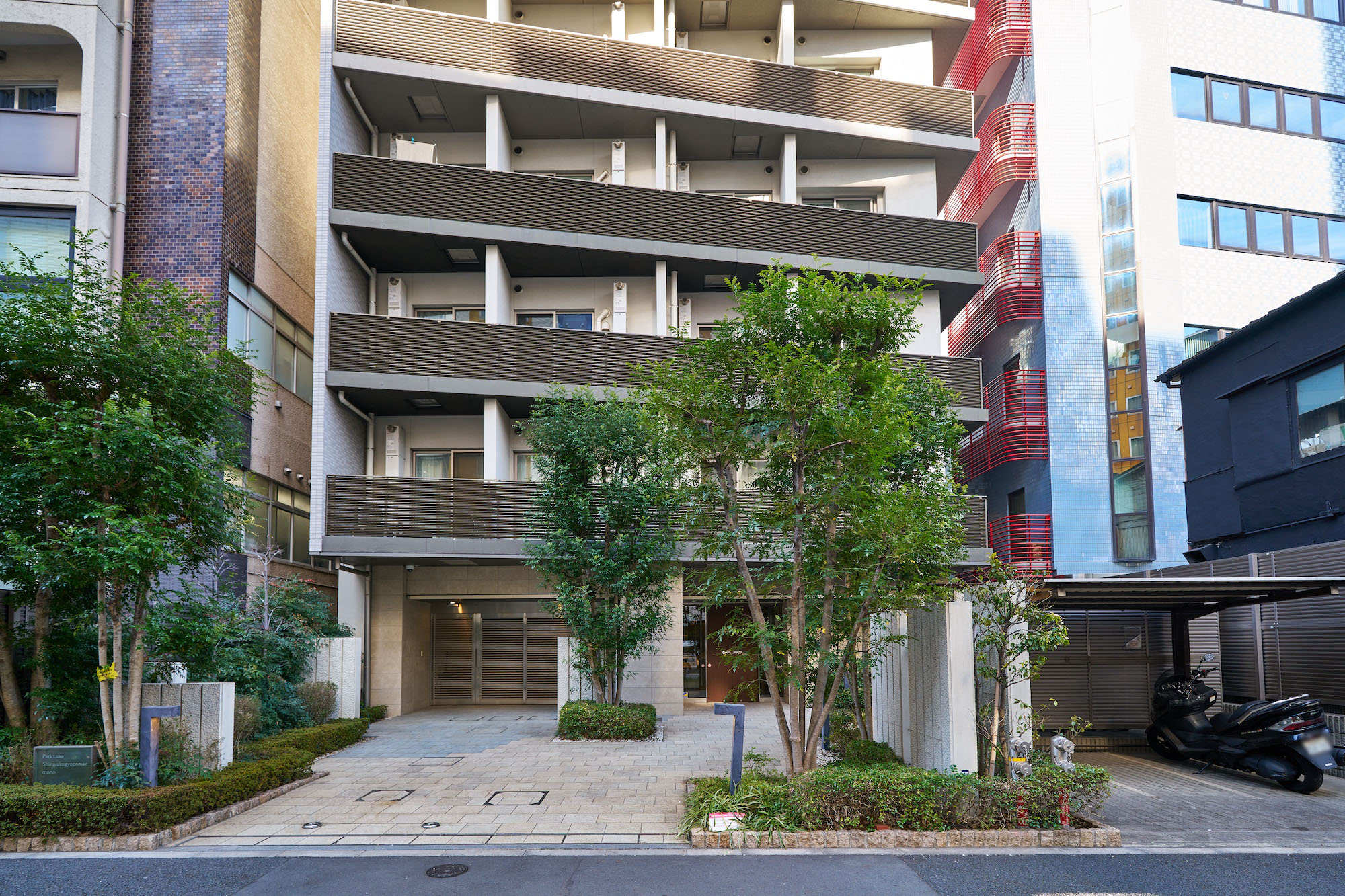 時を経ても飽きのこない、普遍的な美しさを目指したファザードデザイン。基壇部や外構周りのタイルは柔らかい色調のものを採用。バルコニーにはシャープなスタイルを演出する横ルーバー手摺りを使用し、周囲に馴染みながらも道行く人々の目を引く、モダンな印象に仕上げています。