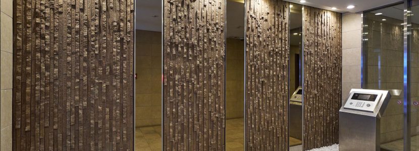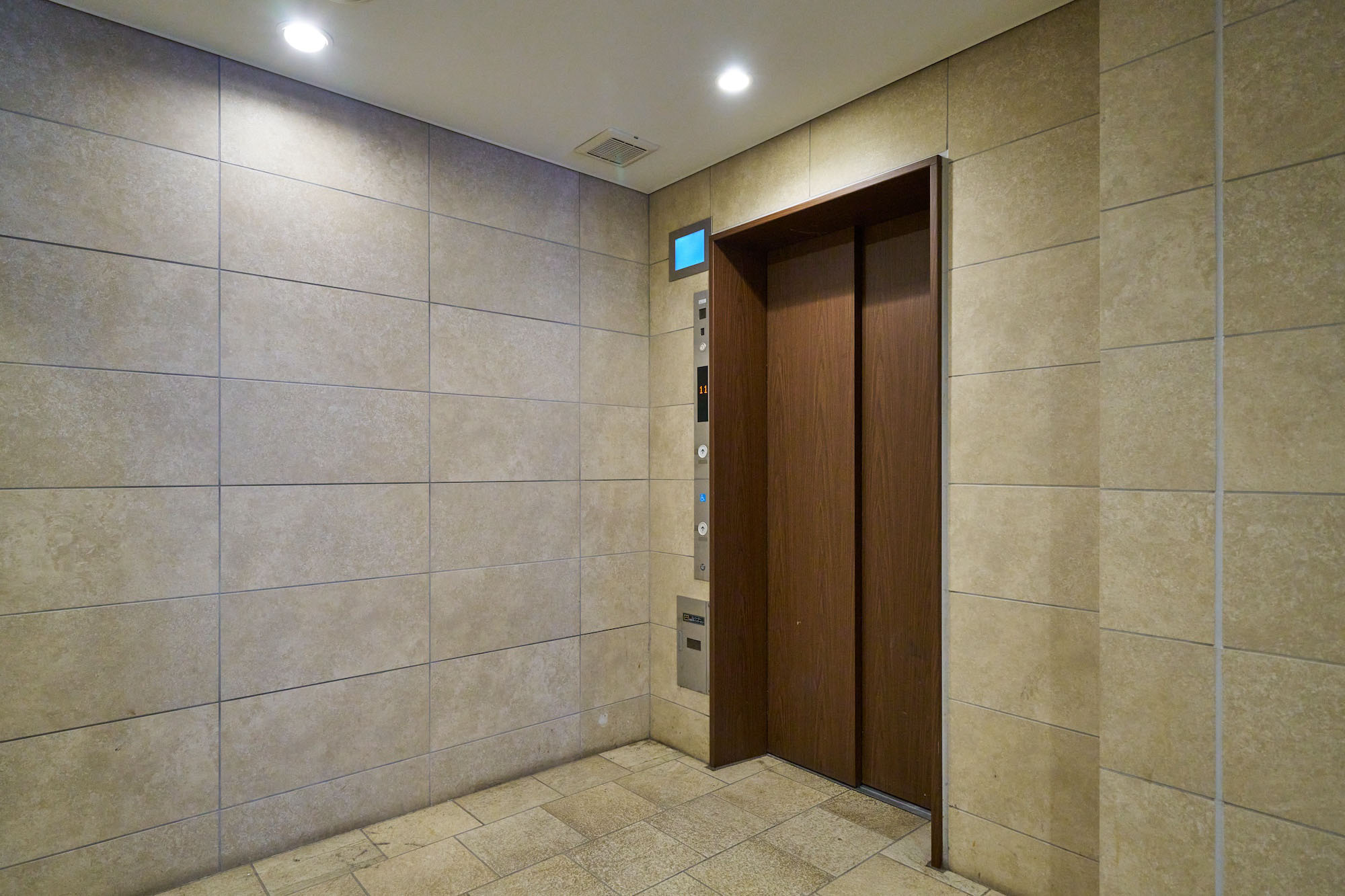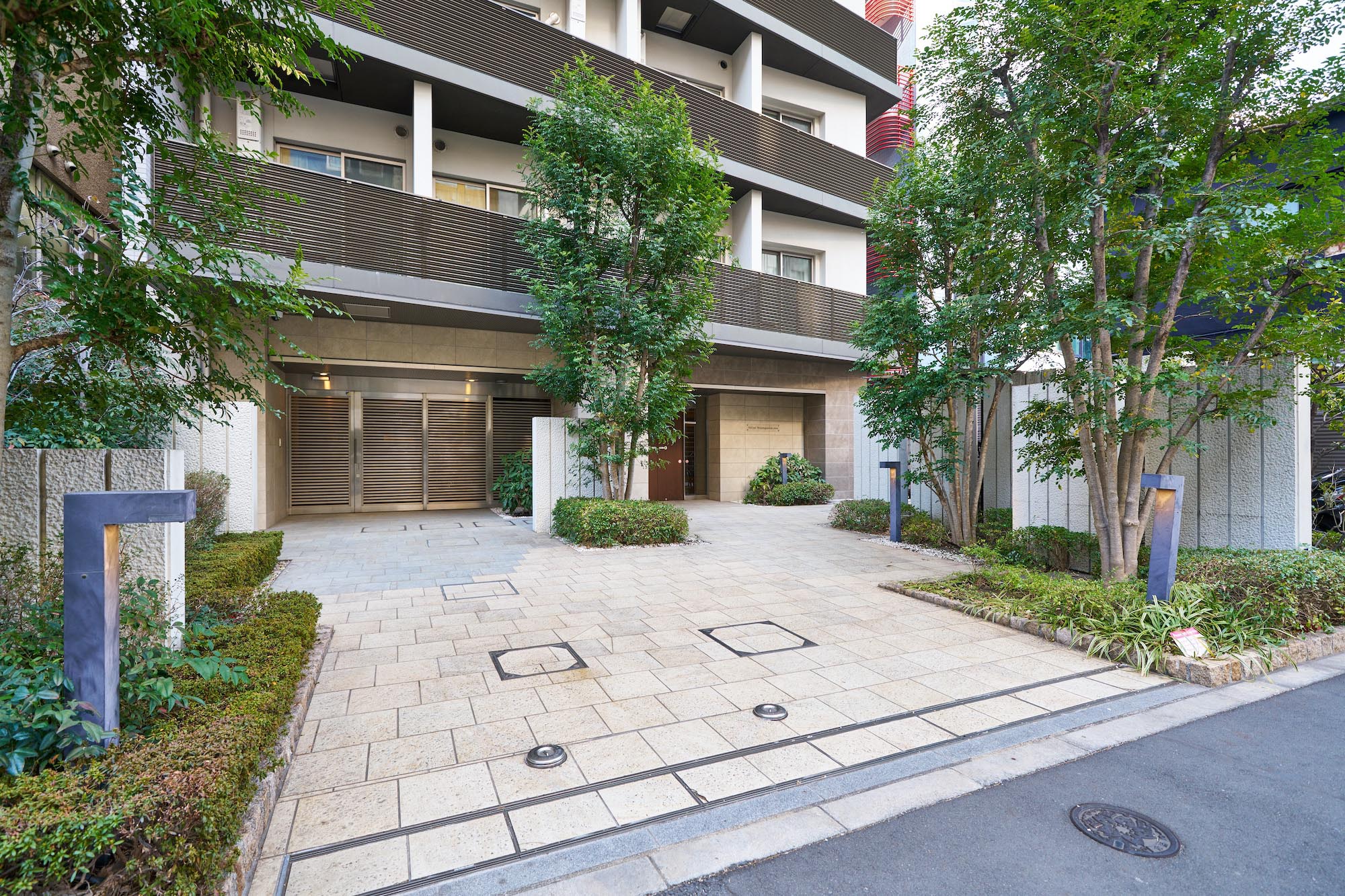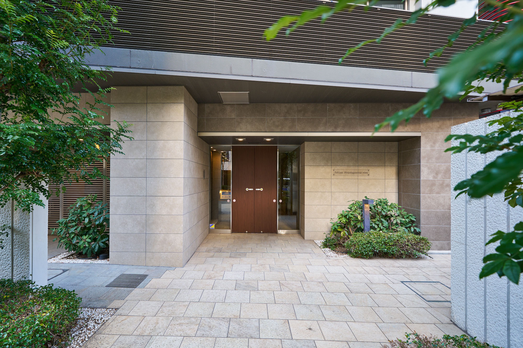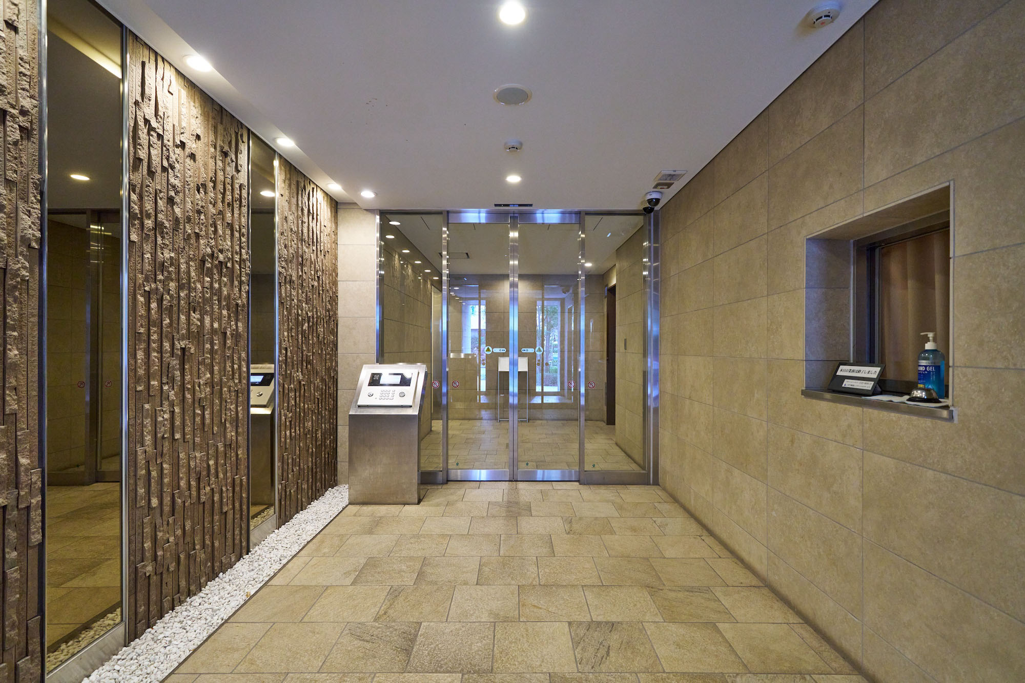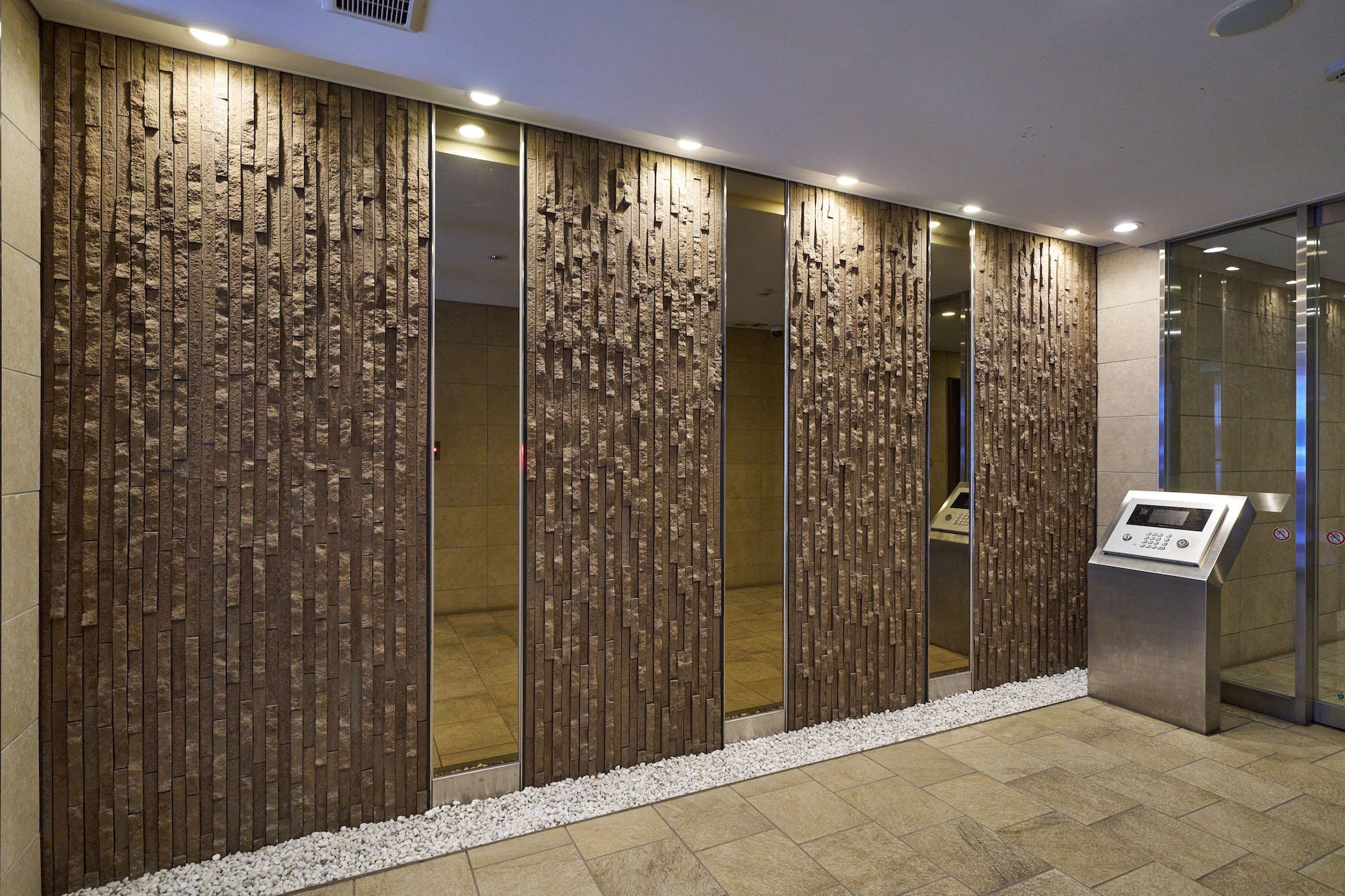 通りからの距離を確保し、豊かな植栽を配したエントランスアプローチ。緑の小径が潤いとともに優しく私邸へと導きます。木調の自動ドアの先には、風除室からエントランスホール、エレベーターホールへと奥行きある空間が続いています。壁面には豊かな表情を持つ割肌調ボーダータイルと鏡がリズムよく配され、洗練された雰囲気と空間の広がりを演出。石の陰影を際立たせるダウンライトや、白玉石を敷き詰めたラインなど、随所にこだわりの意匠が施された、上質な迎賓空間です。
