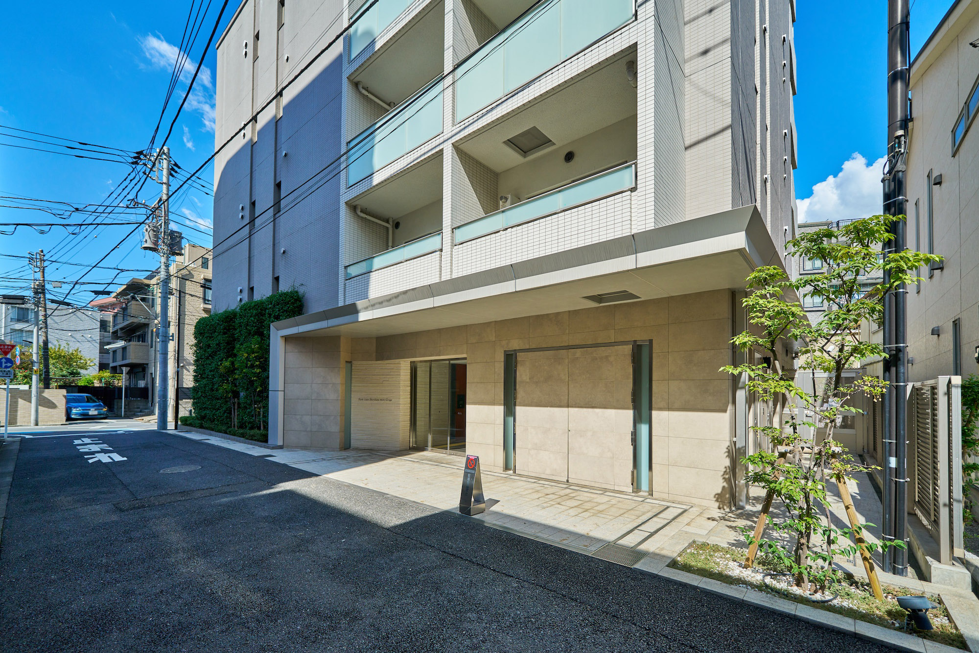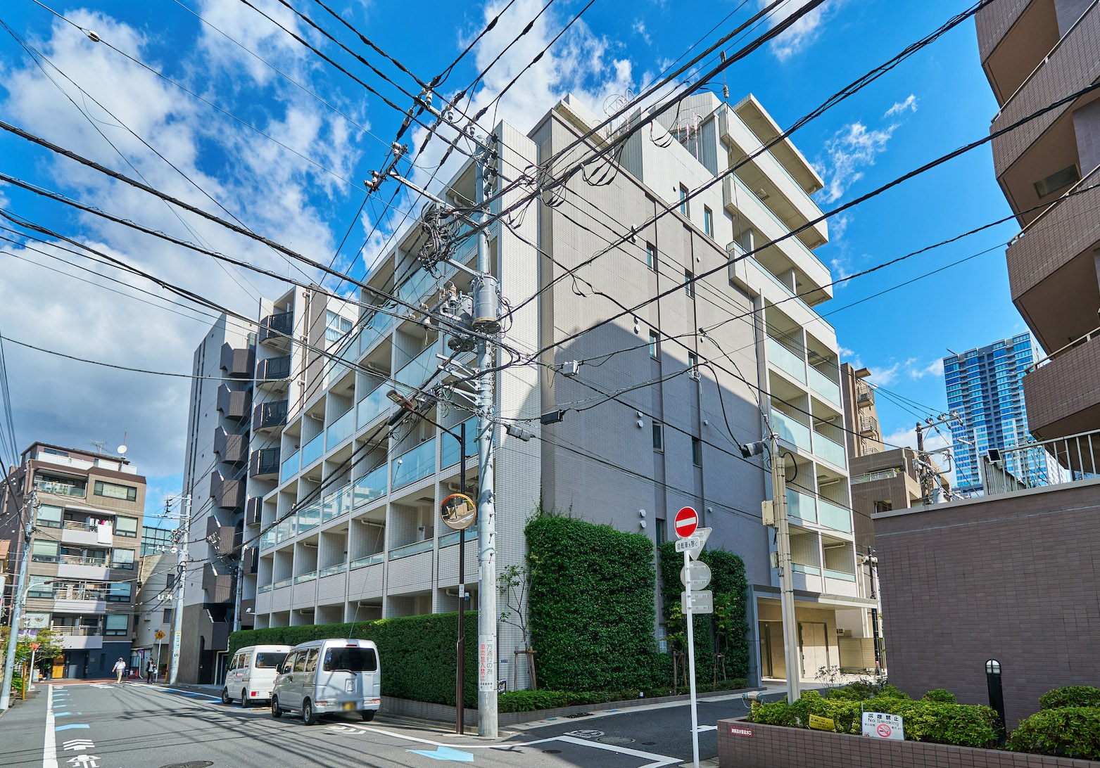 凜とした個性を秘めたグレージュ。清潔感あふれる白。淑やかな2色のコントラストが街に映える、洗練と品格を湛えたファサードデザインです。大らかな庇、グリーンウォール、ガラス手摺、上層階住戸に設けたルーフバルコニーなど、都心の開放感と安らぎを、さまざまに演出。至福の時間をもたらす、白金にふさわしい佇まいです。