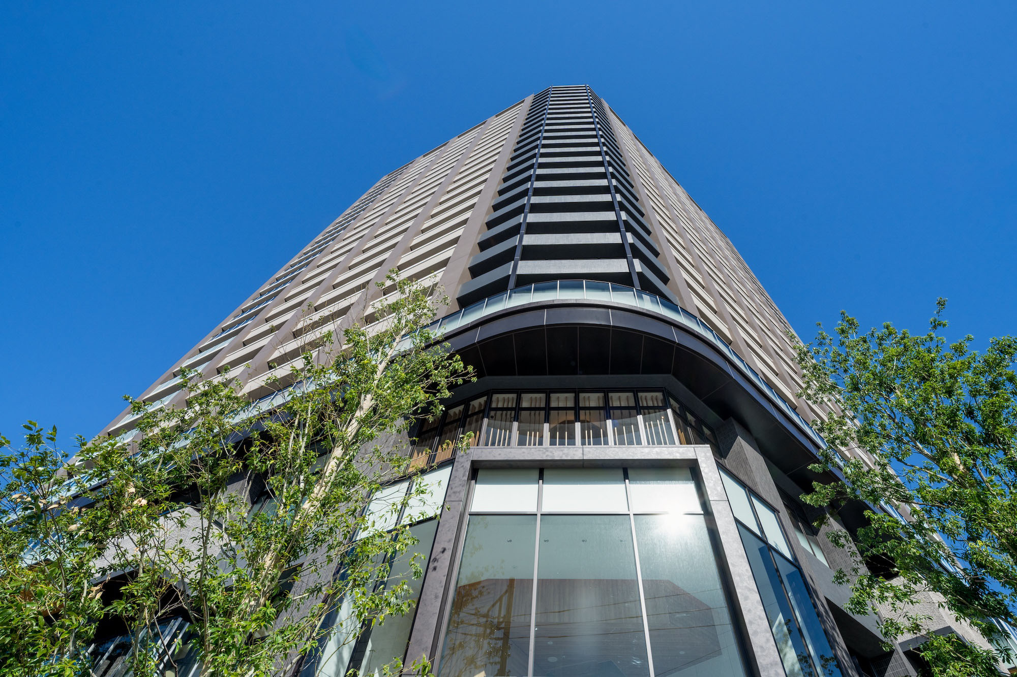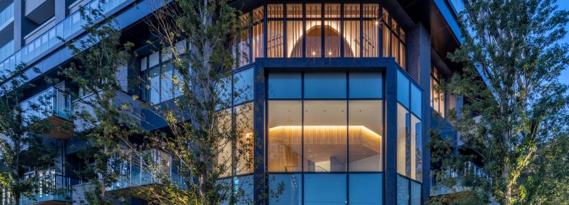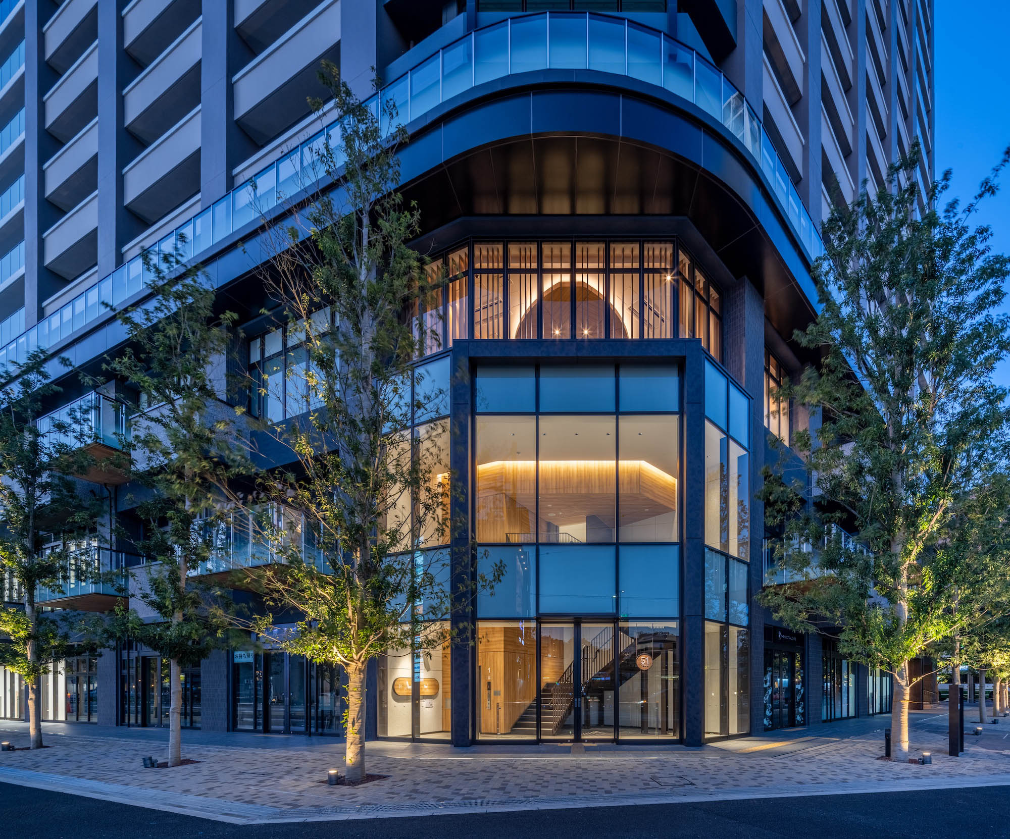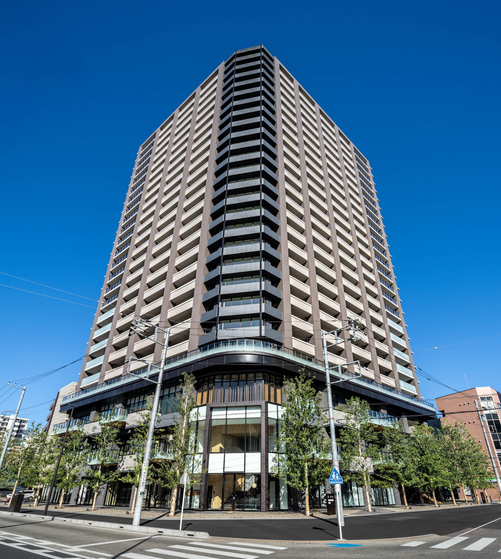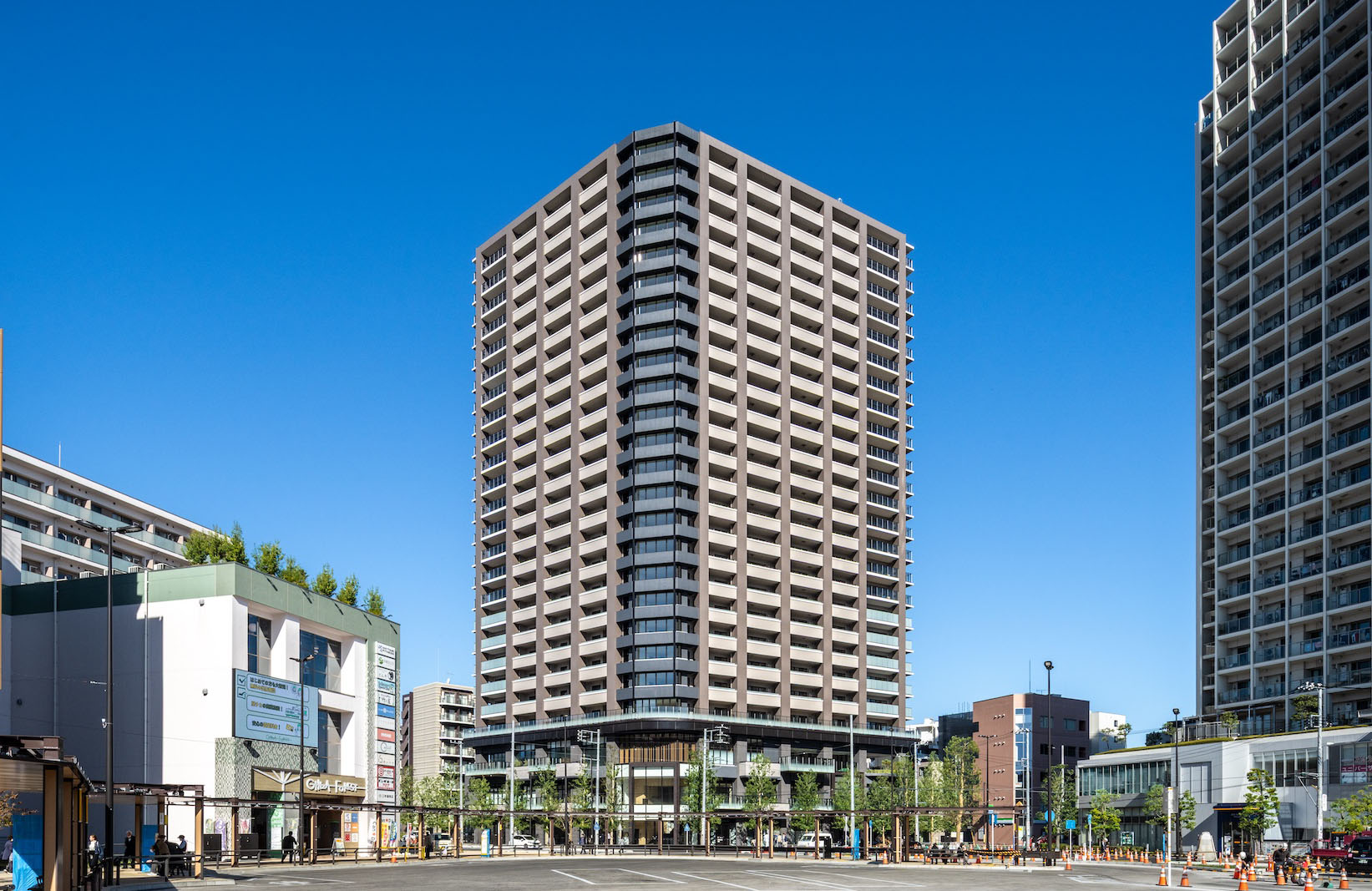 デザインコンセプトは「Stream Line」。潤いあふれる多摩川の流れ、生田緑地の木々を渡る風の流れ、向ヶ丘遊園が紡いできた“人々が楽しく集う場所“という街の歴史と時代の流れ——この街に息づく様々な“流れ”をテーマに、駅前のランドマークレジデンスとしてデザインされました。「向ヶ丘遊園」駅方面にあたる南西の妻側は濃色のブラウンタイルを主体に構成し、ダークブロンズの金属製マリオンをアクセントとして設置。邸宅の「顔」を形づくる場所として、重厚かつ格調高い造形を創り上げています。基壇部と上層階の境界となる4階のバルコニーには、緩やかなストリームラインを描くガラス手すりを配置。下層階の商業エリアと上層階のレジデンスエリアを区分けるとともに、フォルムに柔らかな印象を与えています。さらに、生田緑地内にある枡形山(ますがたやま)をモチーフとした2階・3階部分の凹凸のあるバルコニー、地層をモチーフにしたエントランスの土壁やガラスアートなど、この街の豊かな自然環境をエッセンスとして採り入れ、特徴的なデザインの邸宅が創り上げられています。