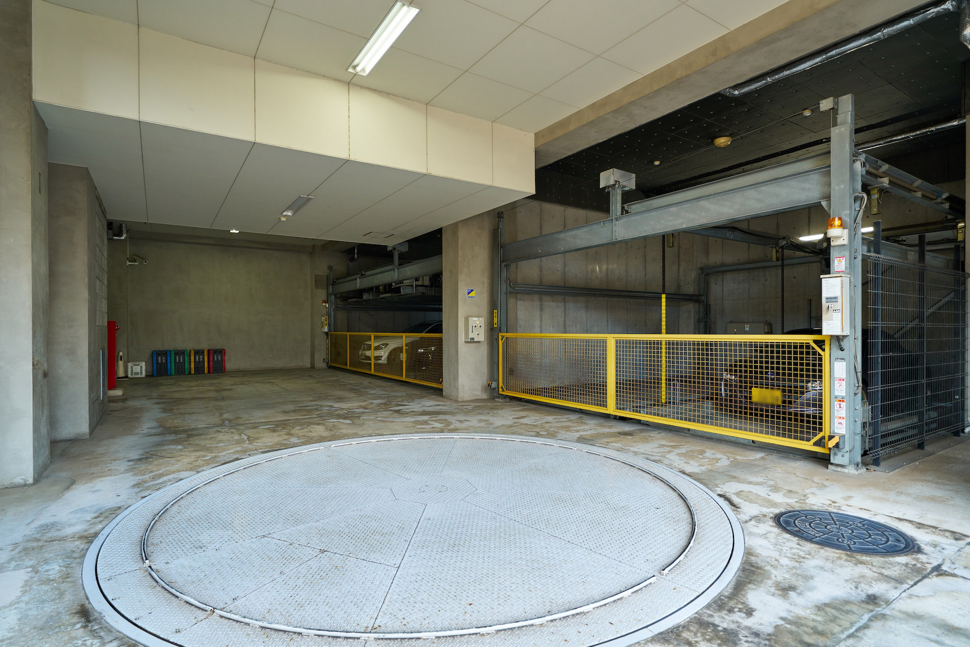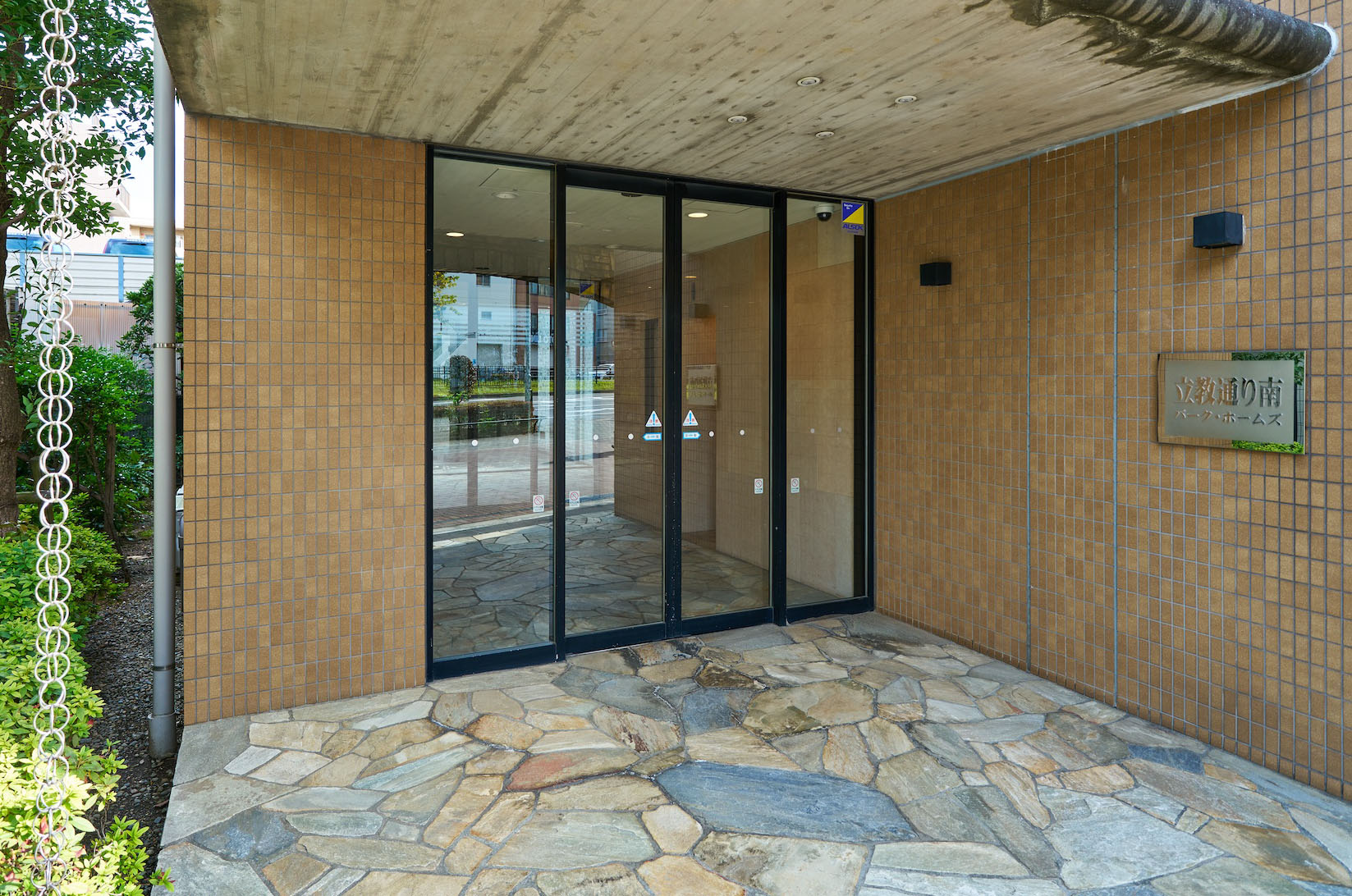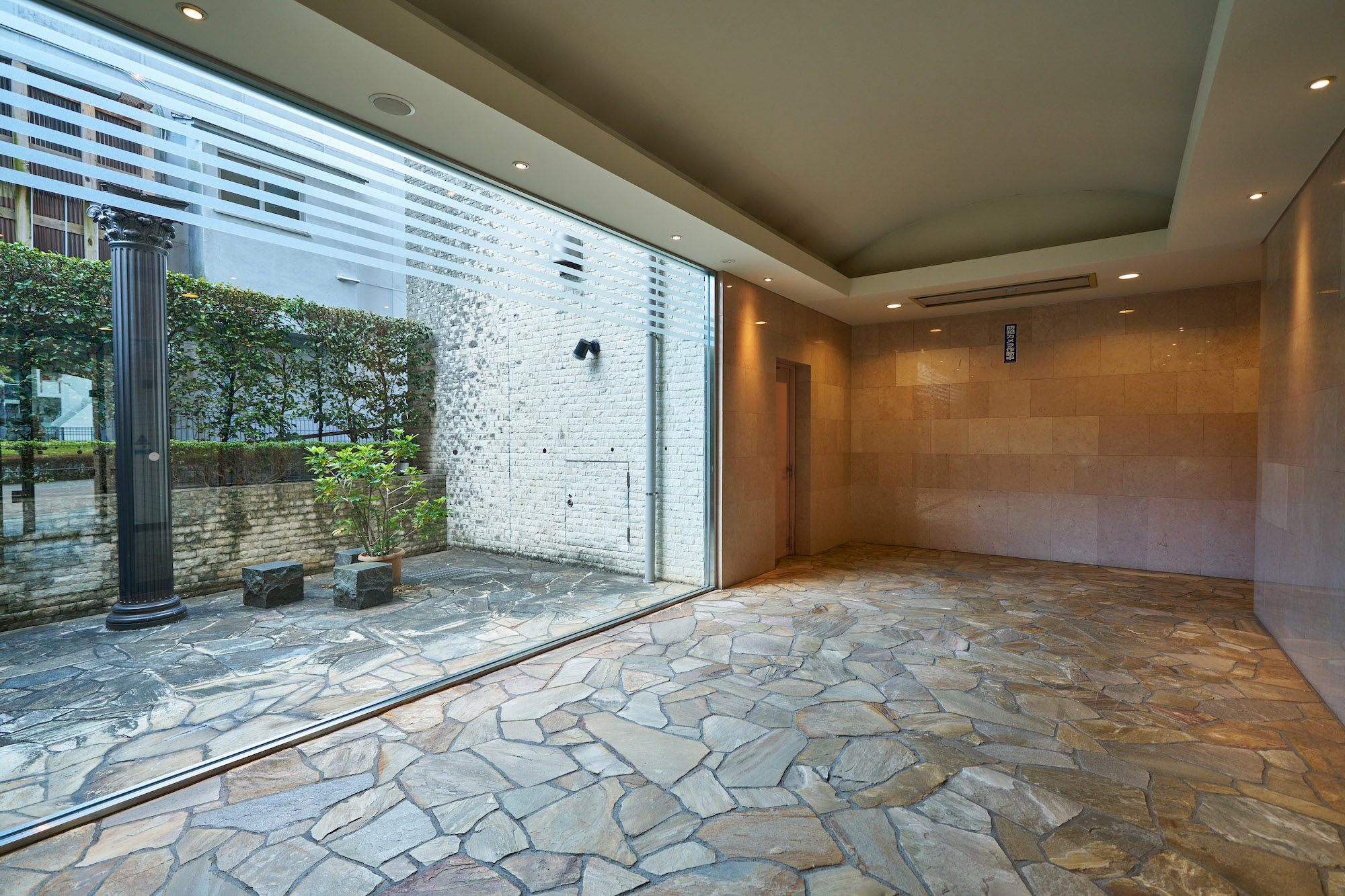 エントランスは「ほっとできる癒しのデザイン」をコンセプトに、洗練された優雅さを演出。道路際から充分な奥行きを確保したアプローチレイアウトによって、エントランスホール内部は表通りから隔離された静寂さを実現するとともに、ポーチからホールにかけては床に砂岩の乱貼りを施した高級感あふれる仕上がりとなっています。そのまま同じ仕上げに統一したカームコート(中庭)には、植栽帯をバックに古代ギリシャ風の柱のオブジェなどを配して、都心居住拠点にふさわしいアーティスティックな雰囲気を醸成。ホールからはガラス越しにその景観を望むことができます。エントランスポーチから中庭へと一直線に抜けるパースペクティブは、まるで一幅の絵画。我が家に向かうにつれて徐々に気持ちが和んでいくような、上質な空間が創り上げられています。